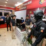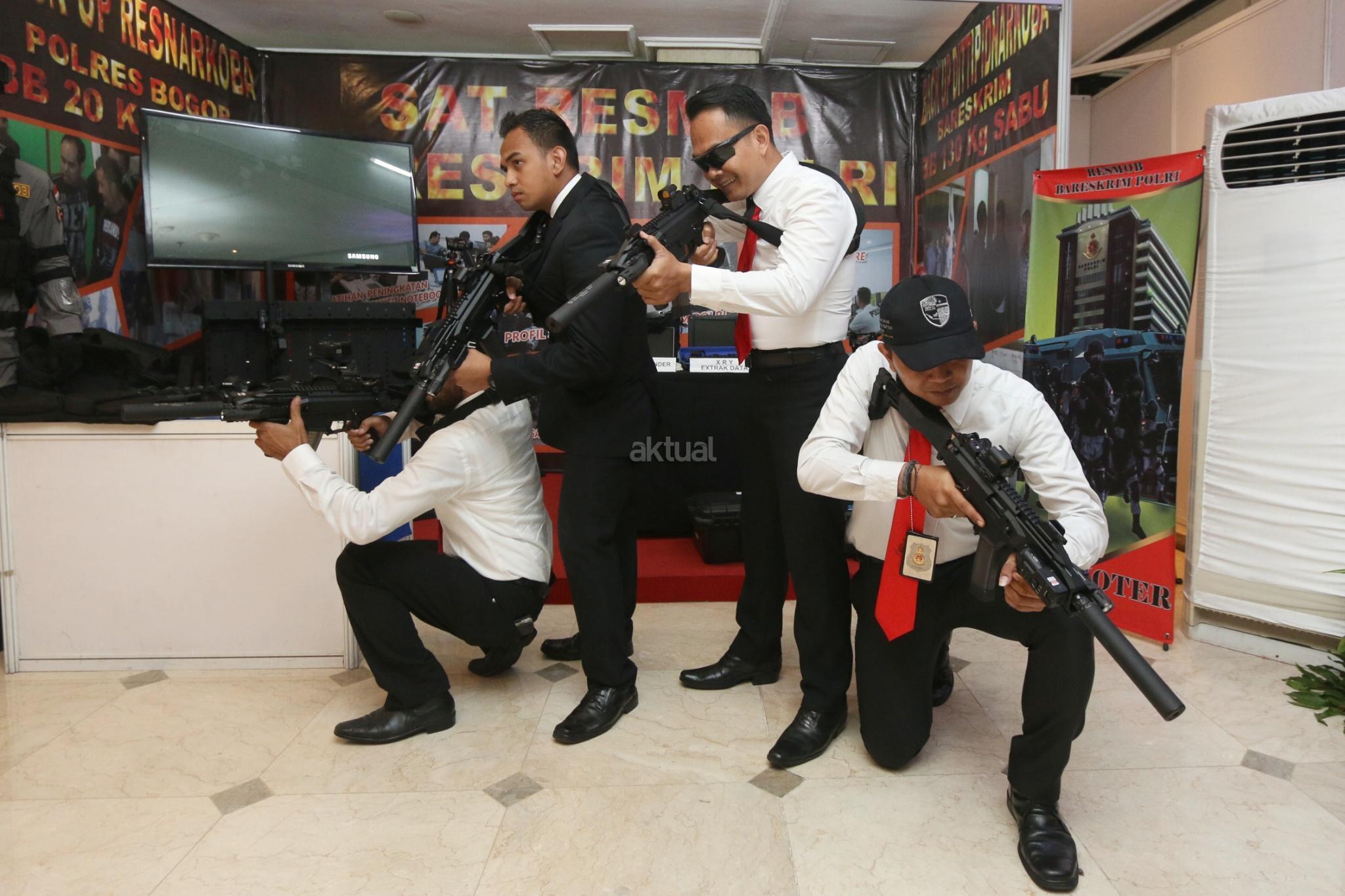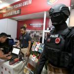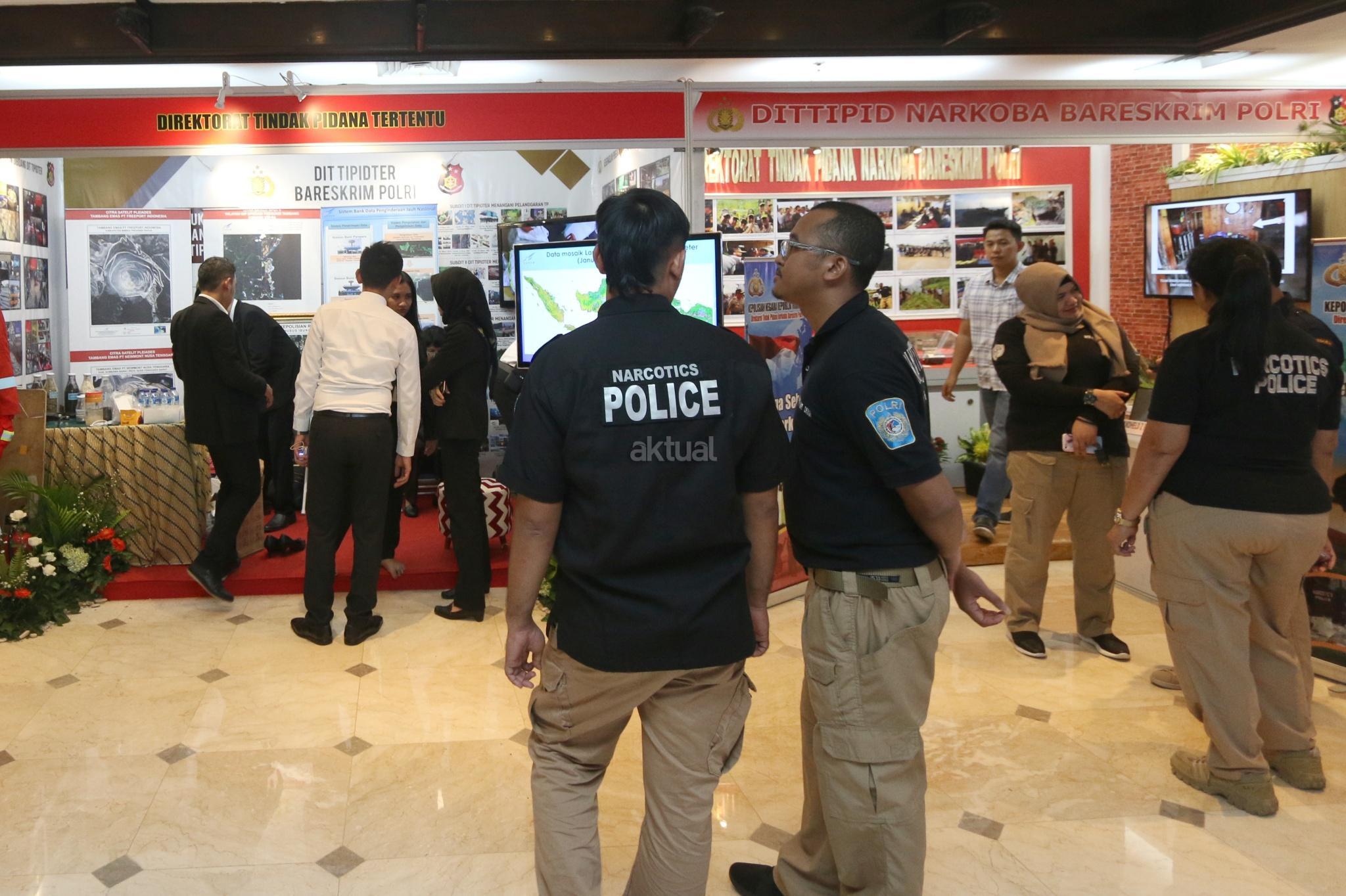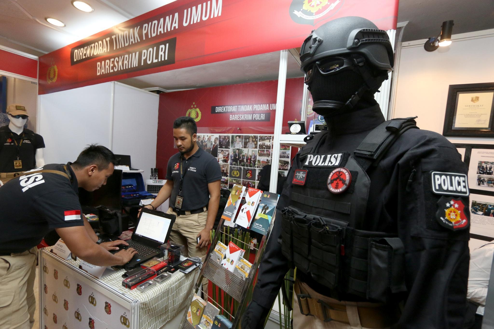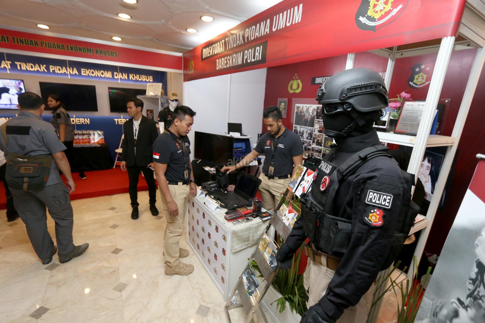 Petugas berjaga di booth pameran Bareskrim Expo 2018 disela-sela rapat kerja teknis (rakernis) Polri di Jakarta, Selasa (6/3/18). Kapolri Jendral Polisi Tito Karnavian menekankan pentingnya membangun keparcayaan publik dalam rakernis yang berlangsung dari 5 hingga 8 Maret 2018. AKTUAL/Tino Oktaviano