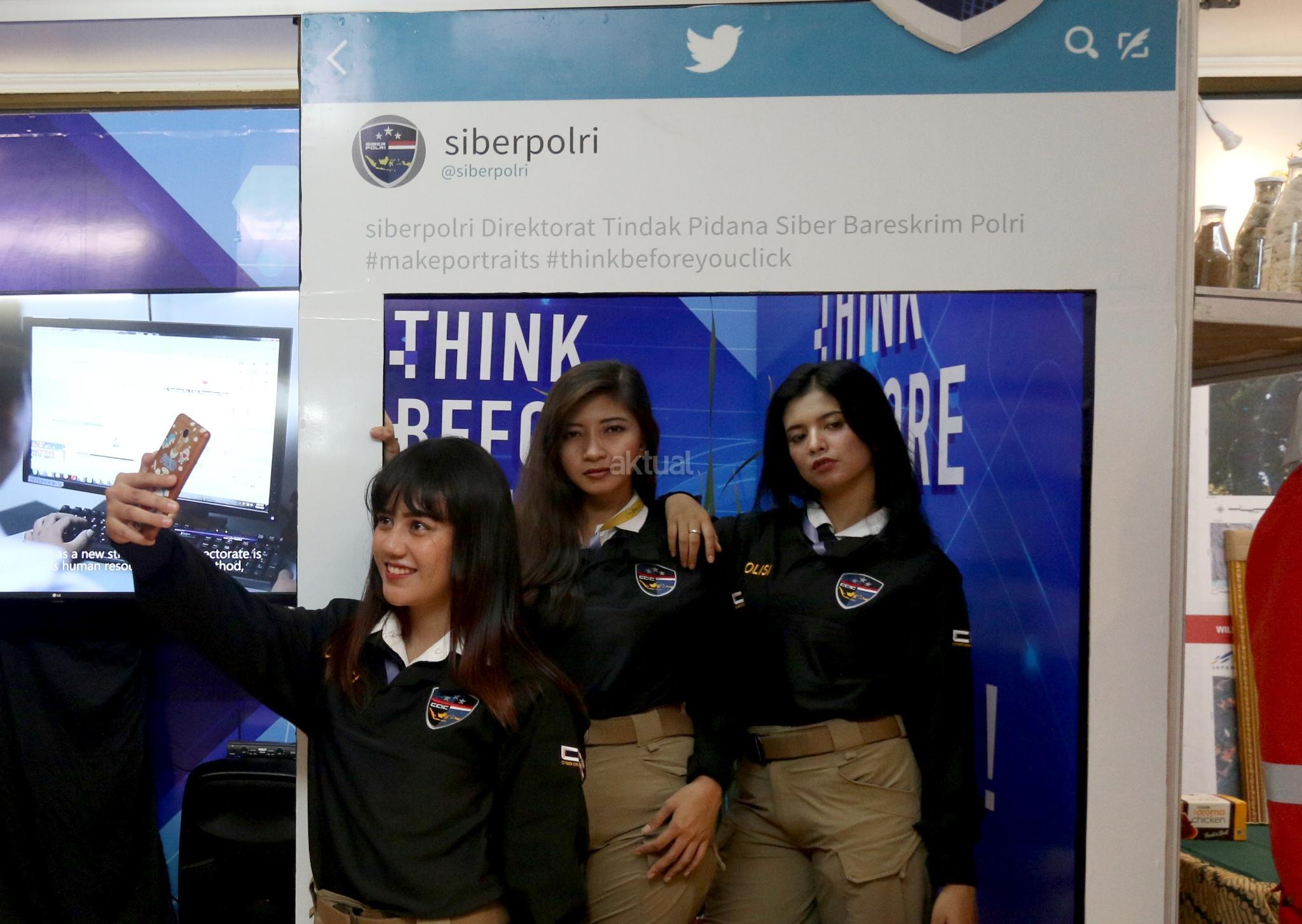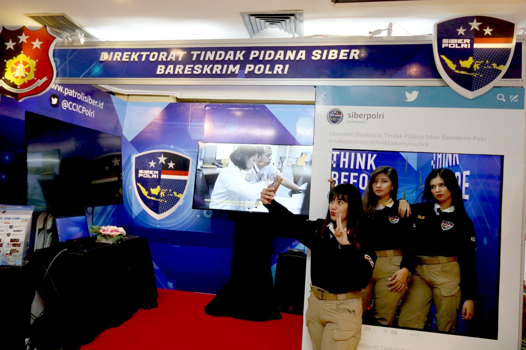 Pengunjung melakukan swafoto di booth pameran Bareskrim Expo 2018 disela-sela rapat kerja teknis (rakernis) Polri di Jakarta, Selasa (6/3/18). Kapolri Jendral Polisi Tito Karnavian menekankan pentingnya membangun keparcayaan publik dalam rakernis yang berlangsung dari 5 hingga 8 Maret 2018. AKTUAL/Tino Oktaviano
