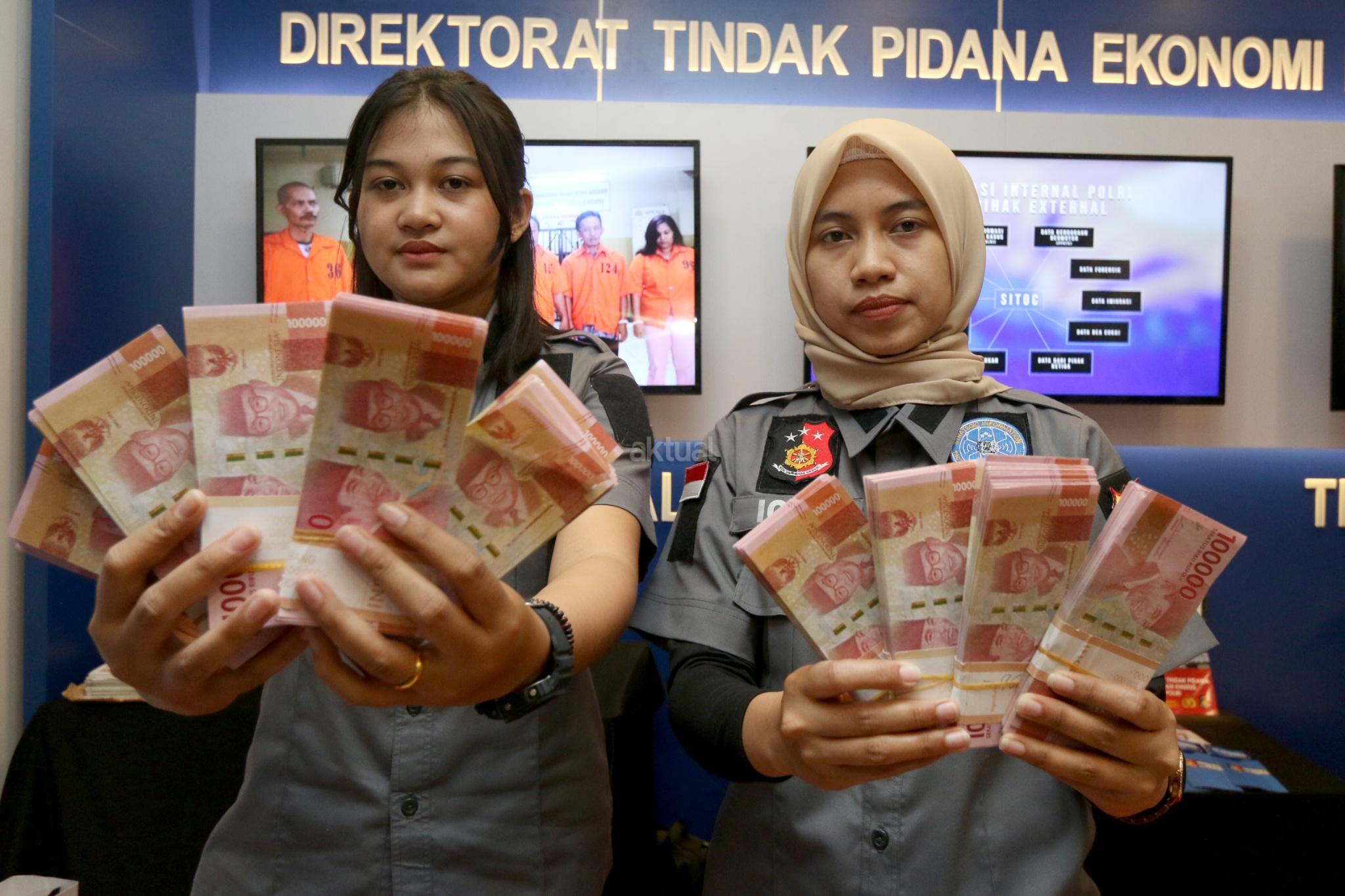 Petugas memperlihatkan uang palsu di booth pameran Bareskrim Expo 2018 disela-sela rapat kerja teknis (rakernis) Polri di Jakarta, Selasa (6/3/18). Kapolri Jendral Polisi Tito Karnavian menekankan pentingnya membangun keparcayaan publik dalam rakernis yang berlangsung dari 5 hingga 8 maret 2018. AKTUAL/Tino Oktaviano