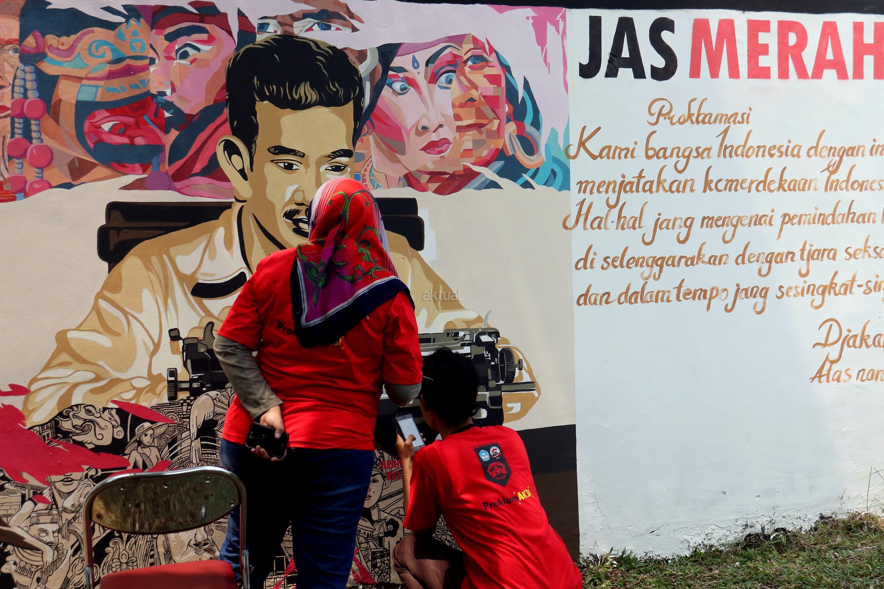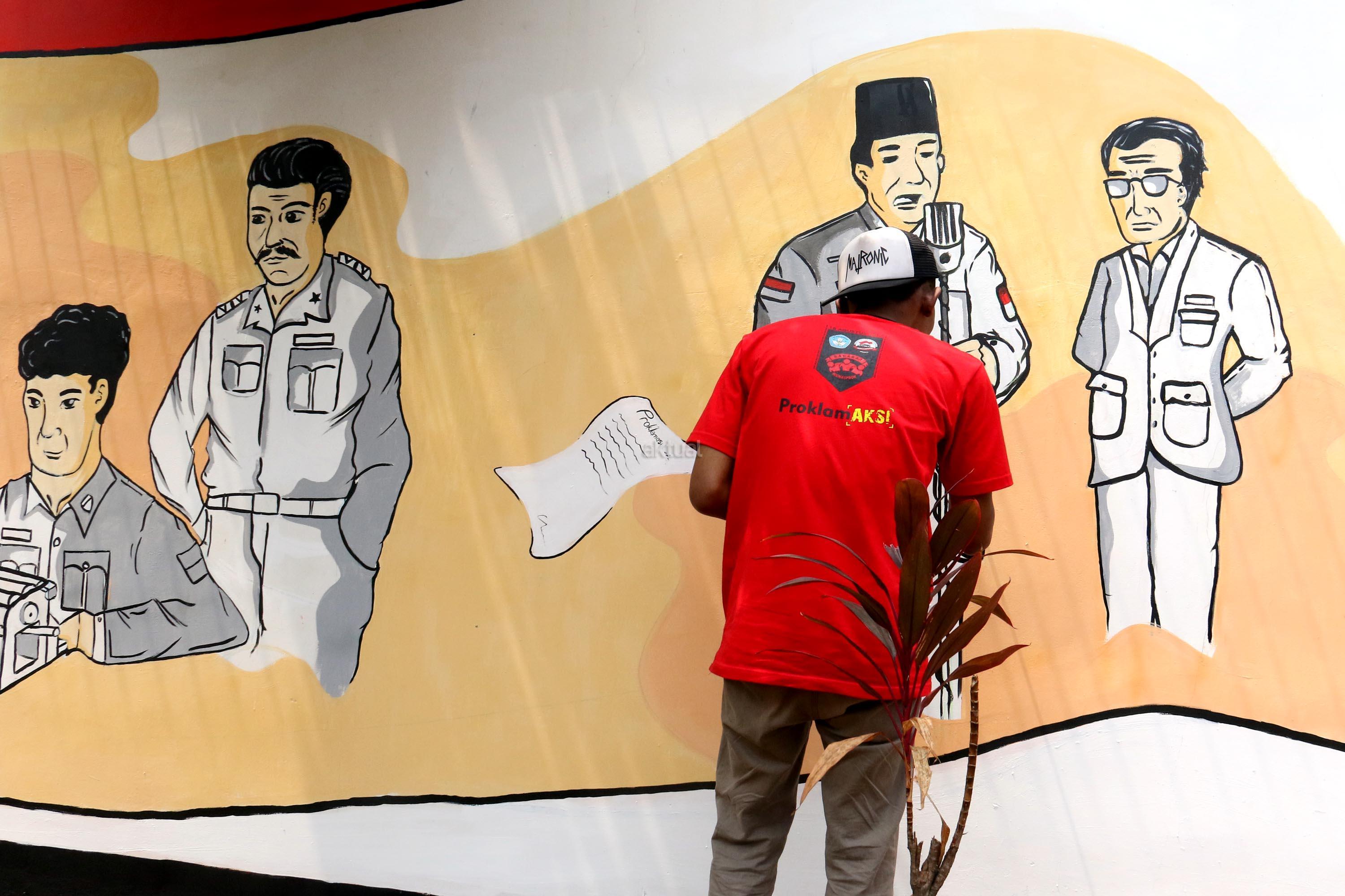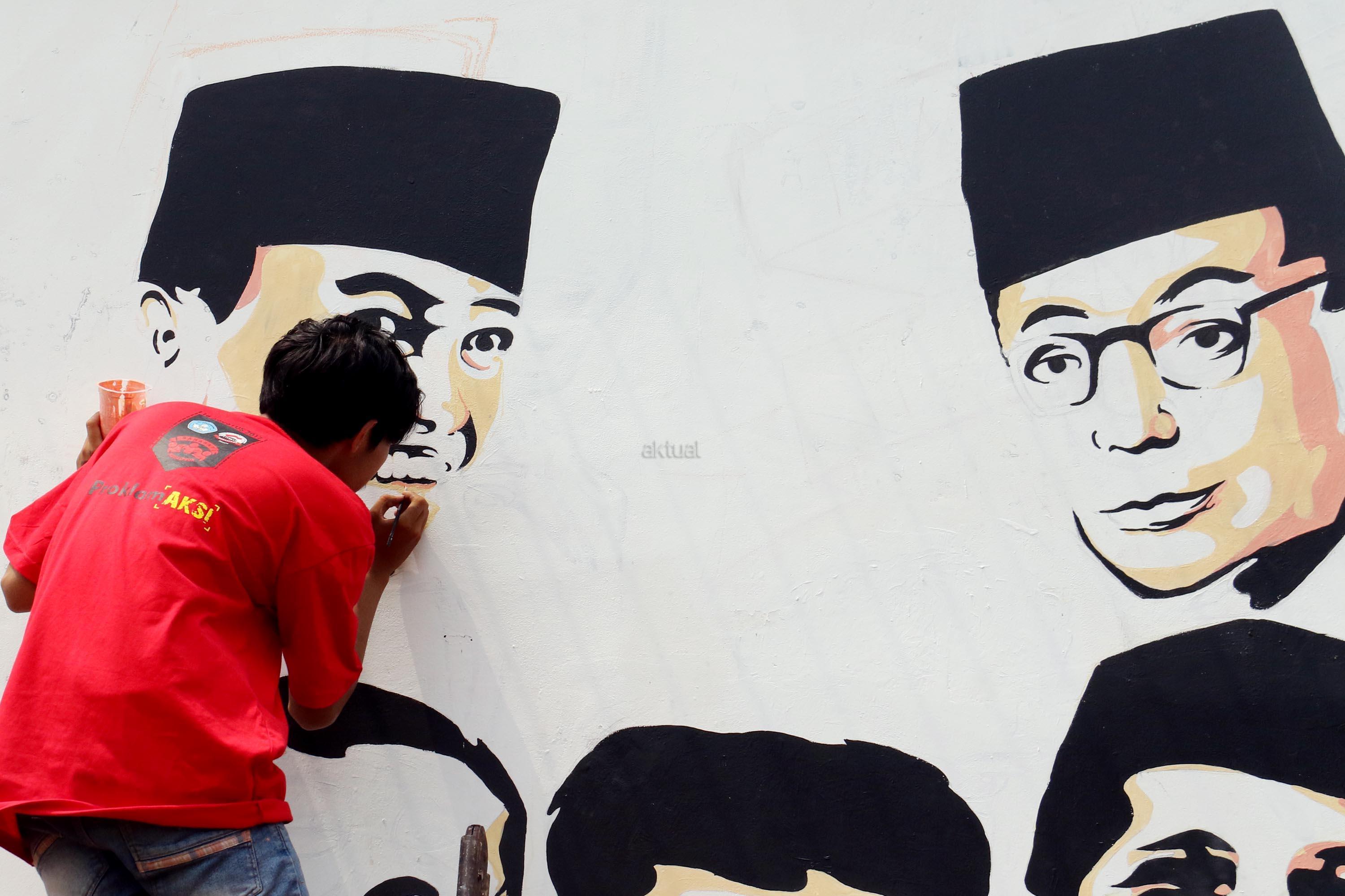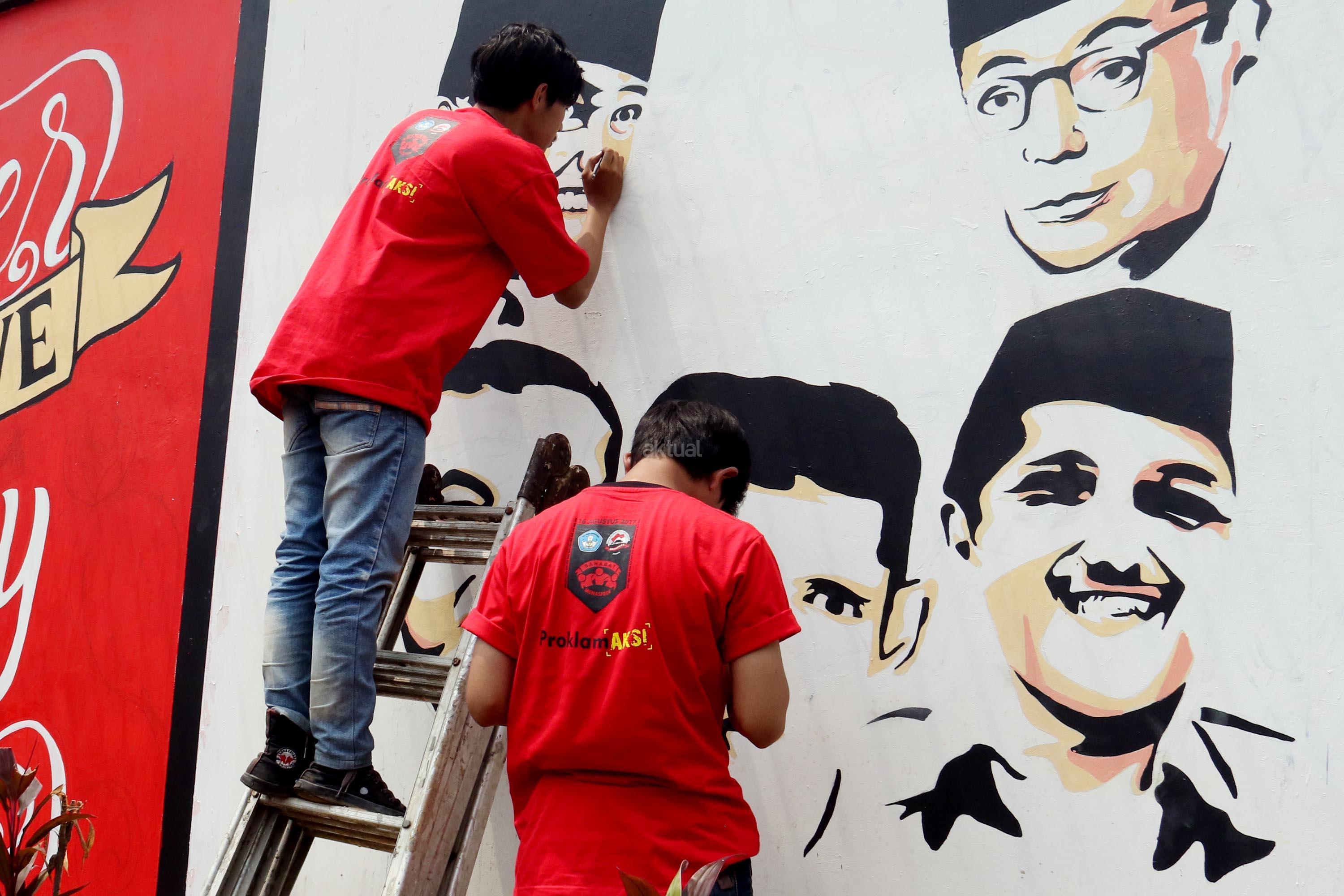 Sejumlah pemuda melukis mural wajah para founding father Indonesia di halaman belakang museum perumusan naskah Proklamasi, Jakarta, Rabu (16/8/2017). Melukis mural para founding father menjelang HUT Kemerdekan RI yang ke 72 tahunSejumlah pemuda melukis mural wajah para founding father Indonesia di halaman belakang museum perumusan naskah Proklamasi, Jakarta, Rabu (16/8/2017). Melukis mural para founding father menjelang HUT Kemerdekan RI yang ke 72 tahun. AKTUAL/Munzir