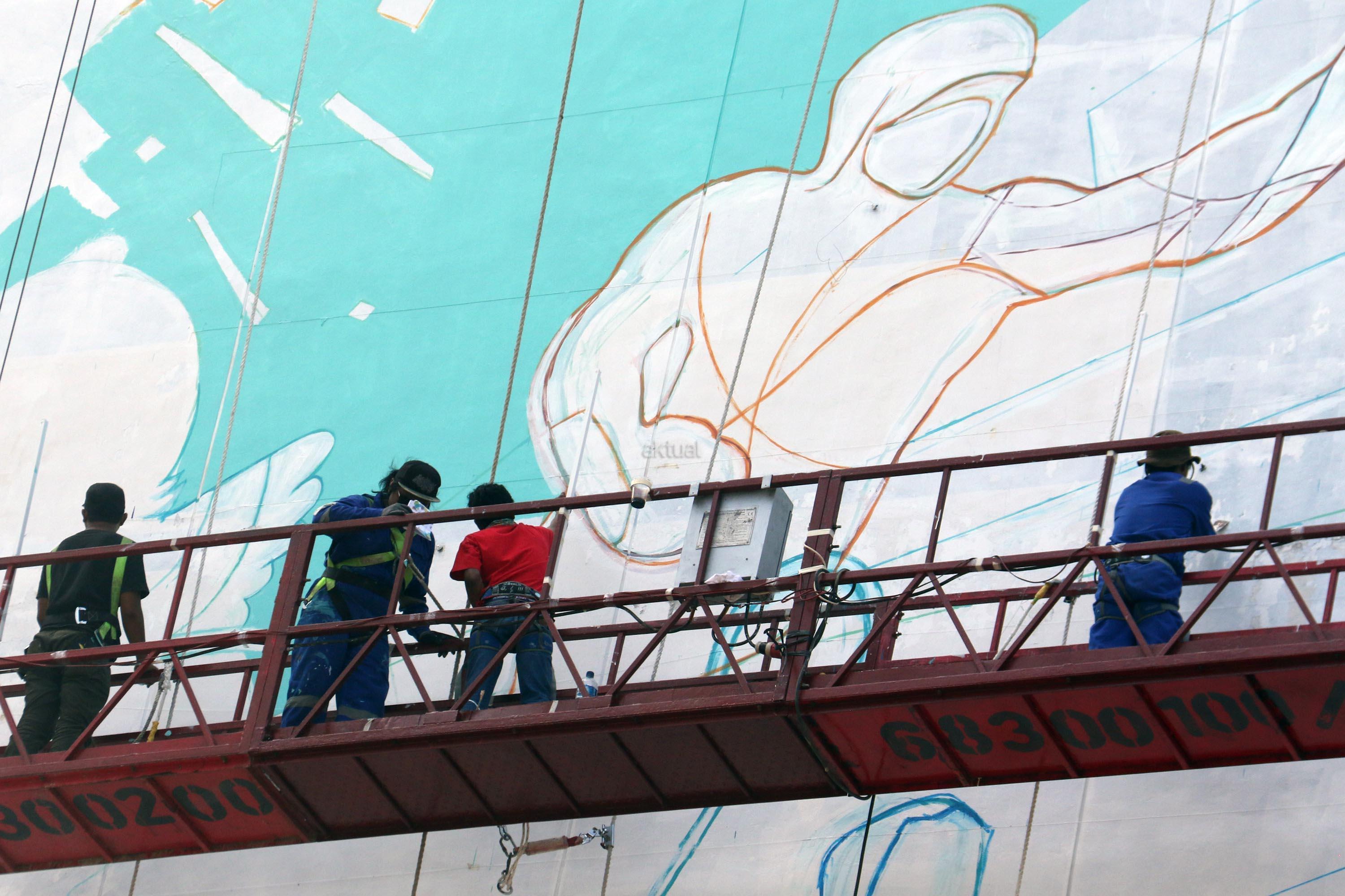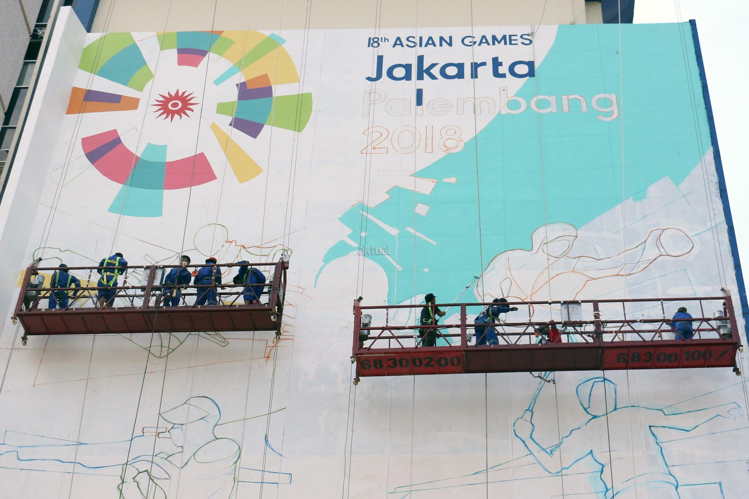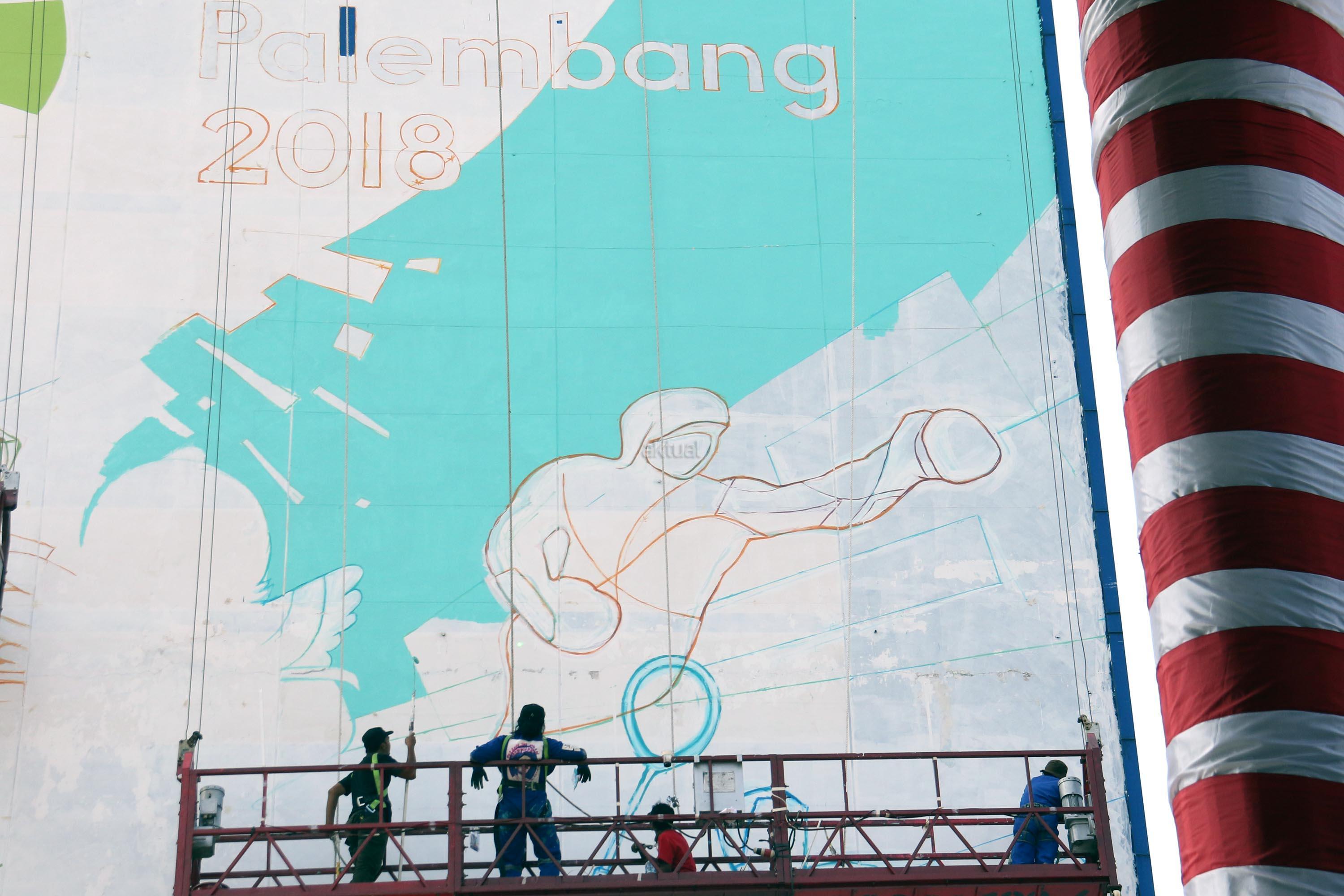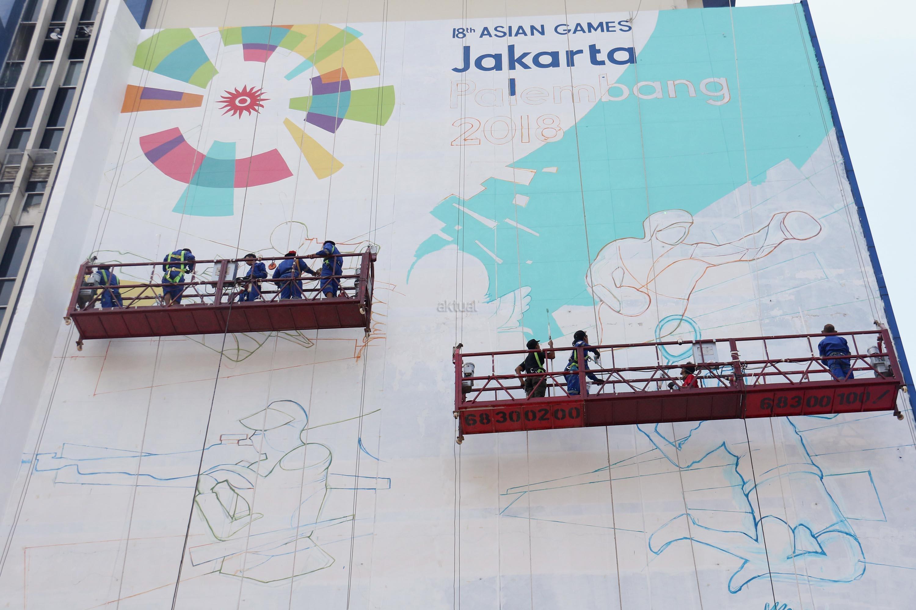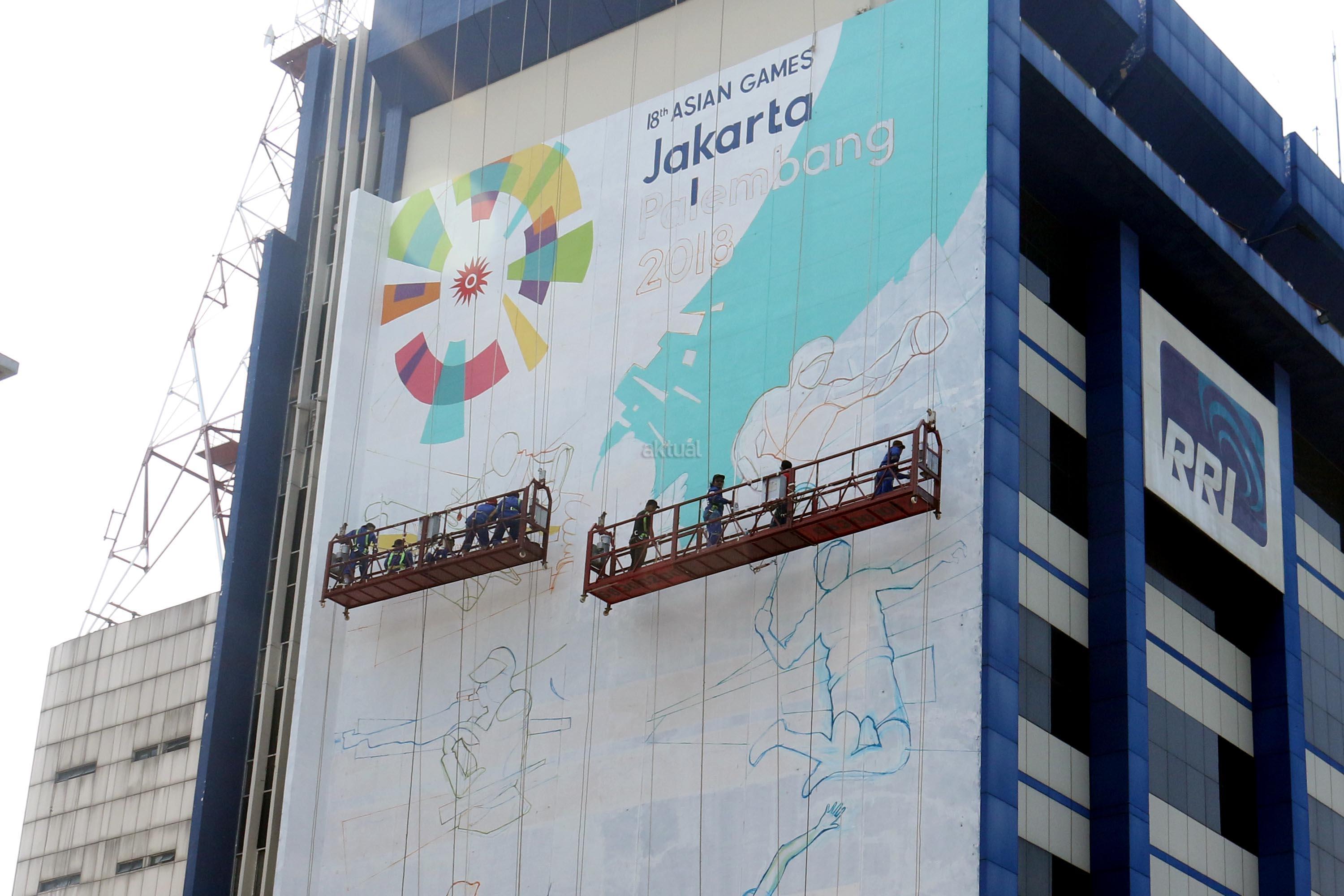 Sejumlah seniman melukis mural di gedung RRI, Jakarta, Kamis (24/8/2017). Kegiatan tersebut berlangsung dalam rangka menyambut Asian Games 2018 yang dilaksanakan di dua Provinsi Jakarta dan Palembang. AKTUAL/Munzir
