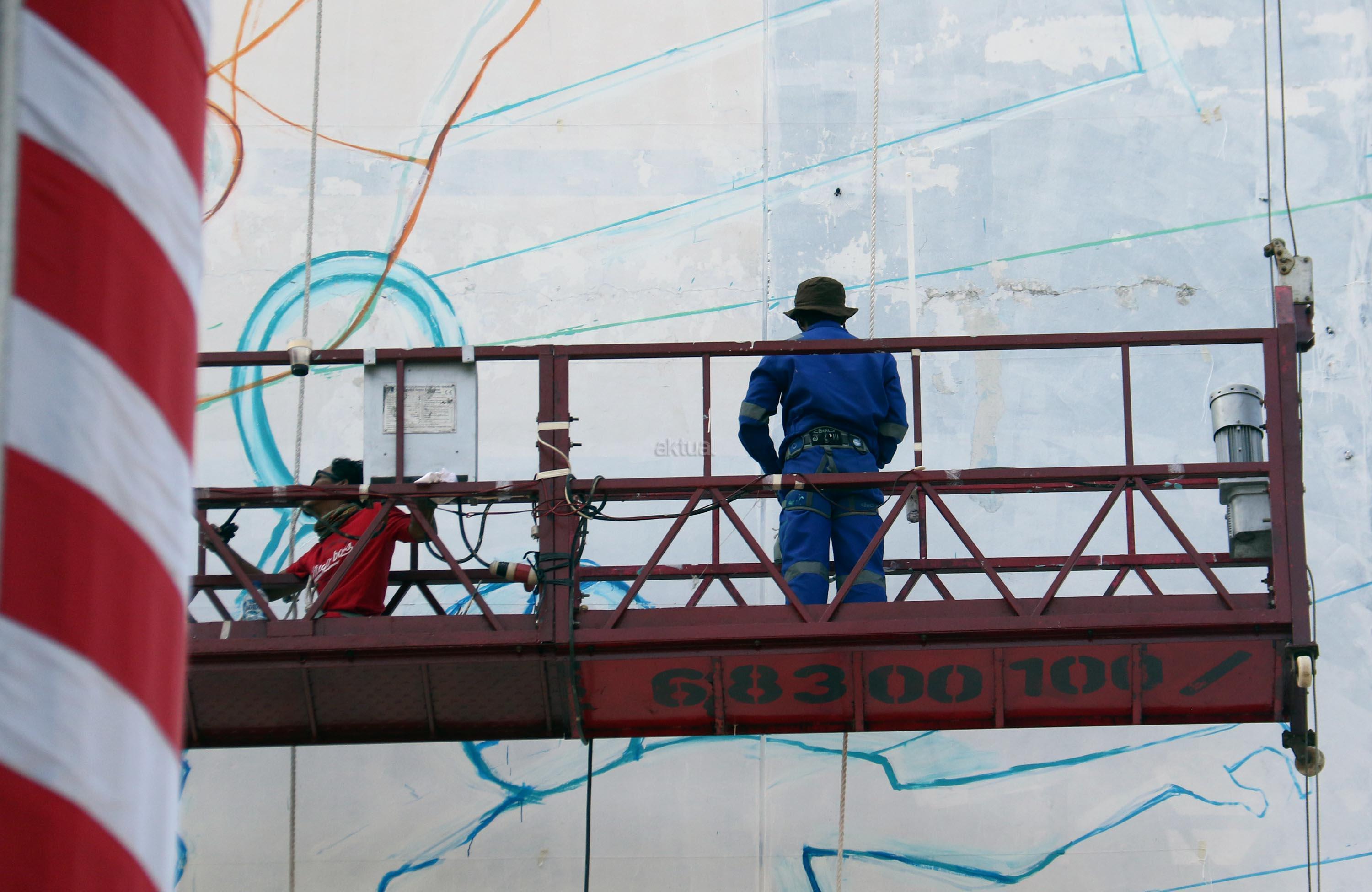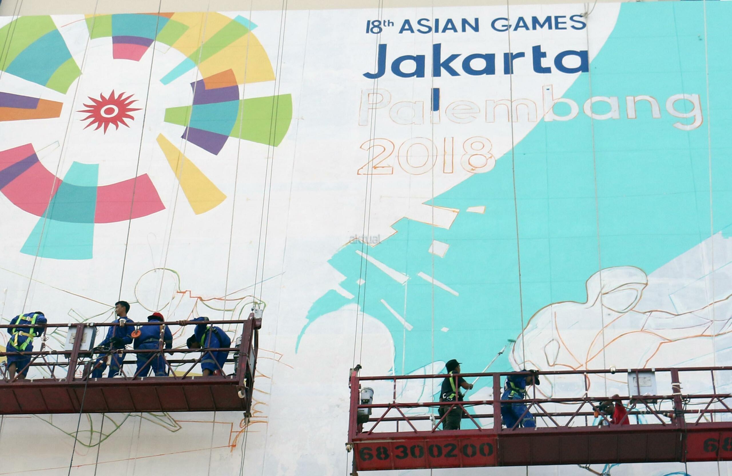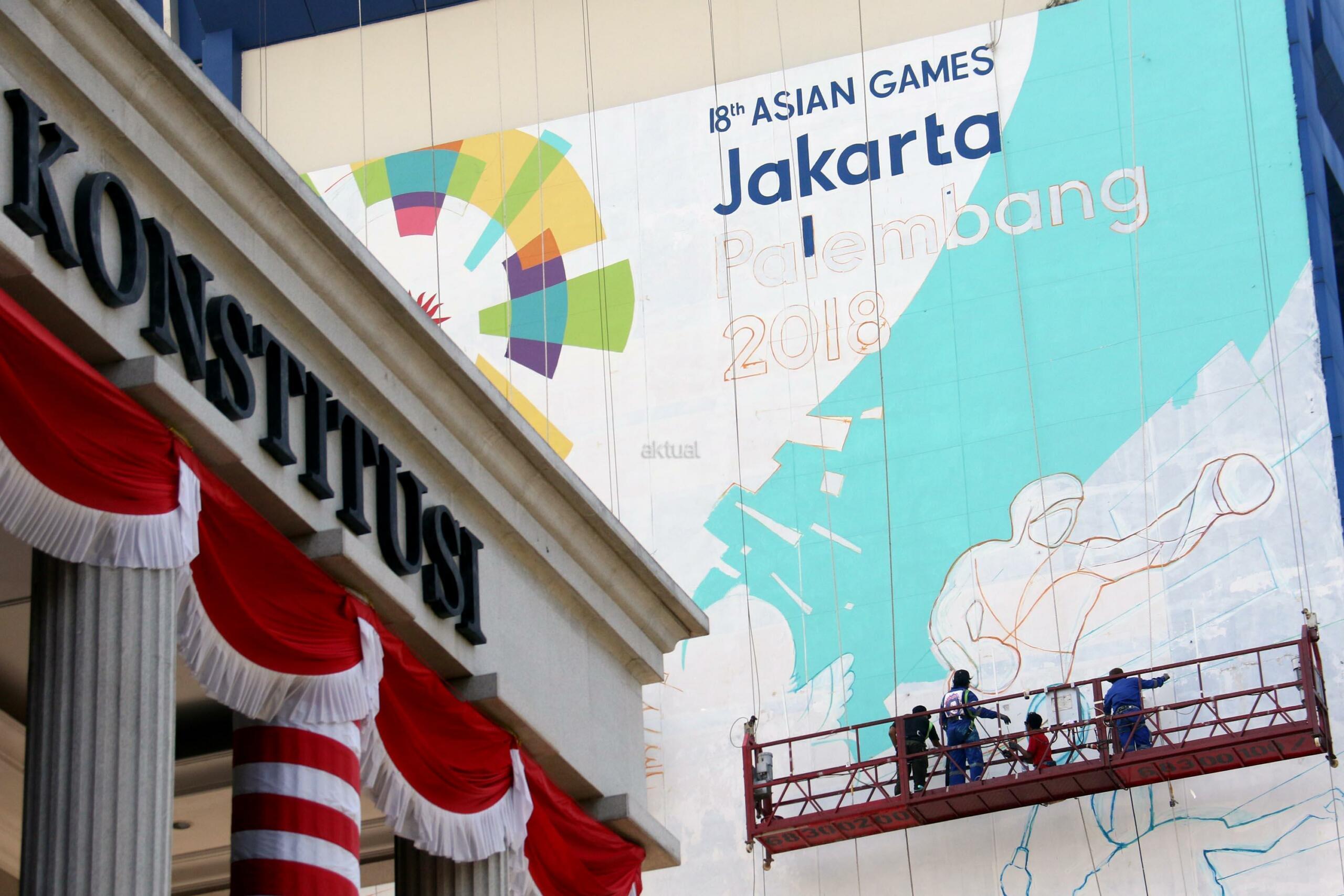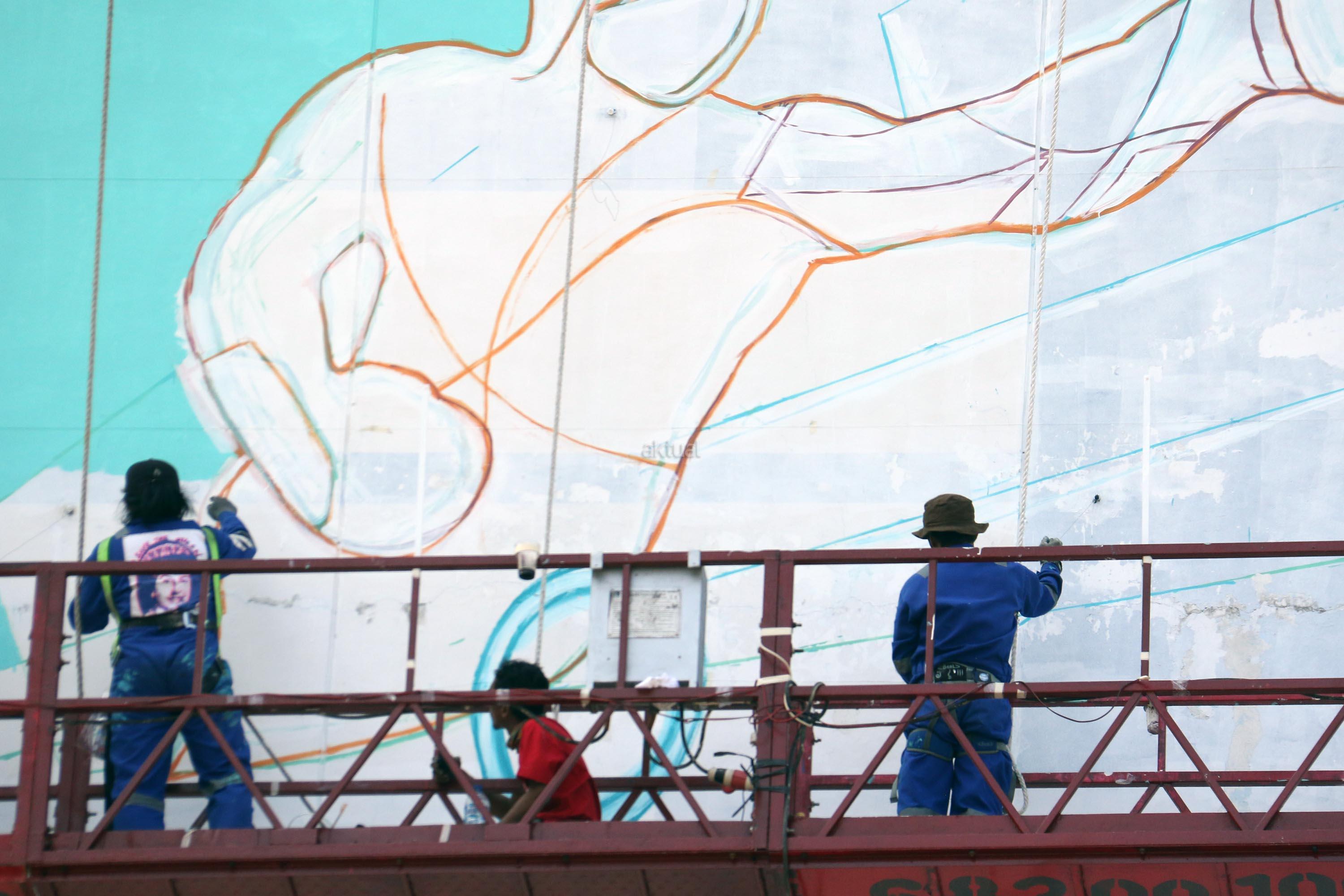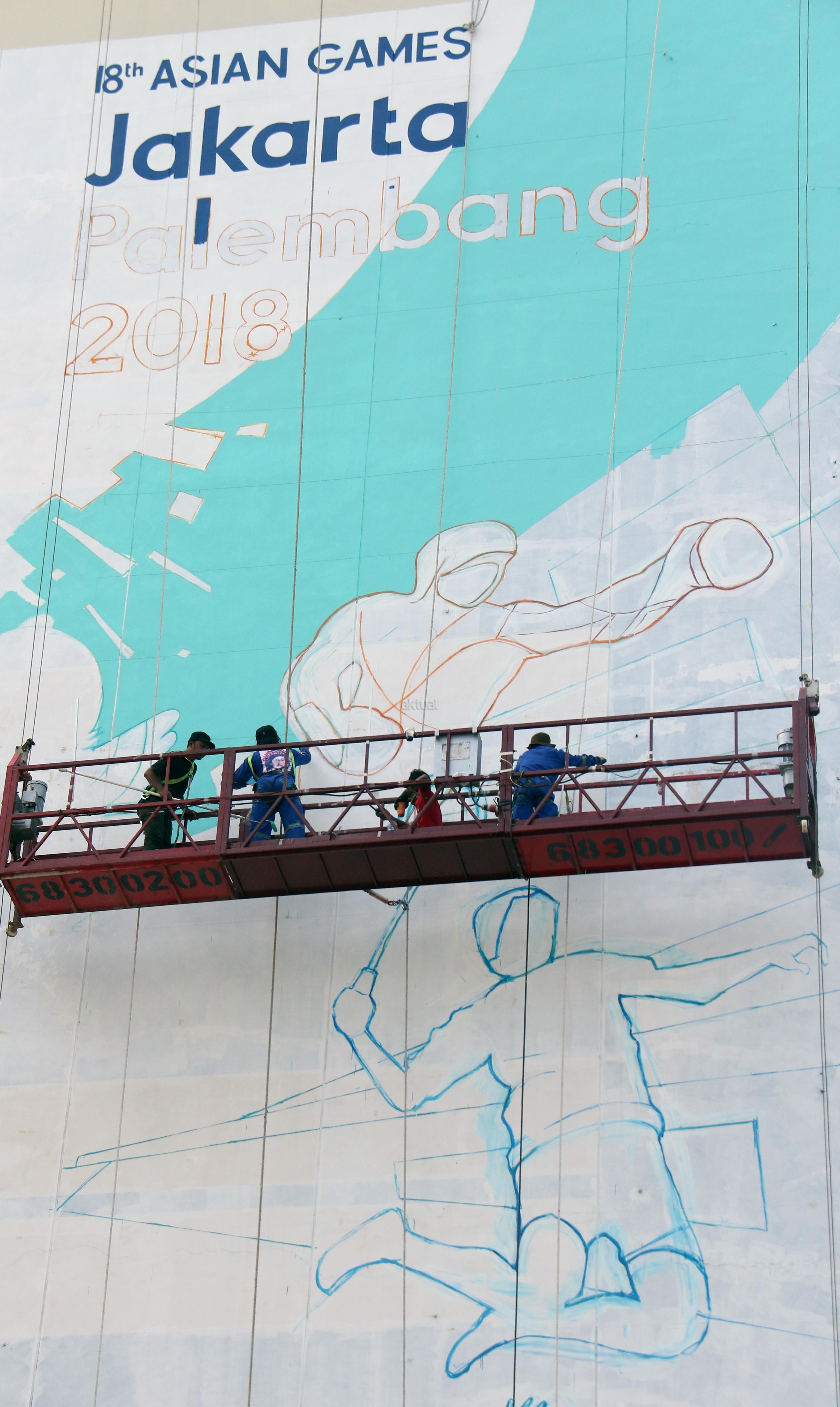 Sejumlah seniman melukis mural di gedung RRI, Jakarta, Kamis (24/8/2017). Kegiatan tersebut berlangsung dalam rangka menyambut Asian Games 2018 yang dilaksanakan di dua Provinsi Jakarta dan Palembang. AKTUAL/Munzir