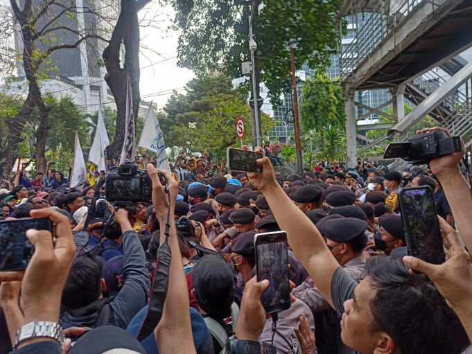 “Kami ingin menyuarakan aksi di depan Istana,” ucap orator di atas mobil komando, Patung Kuda, Jakarta, Kamis (15/9).