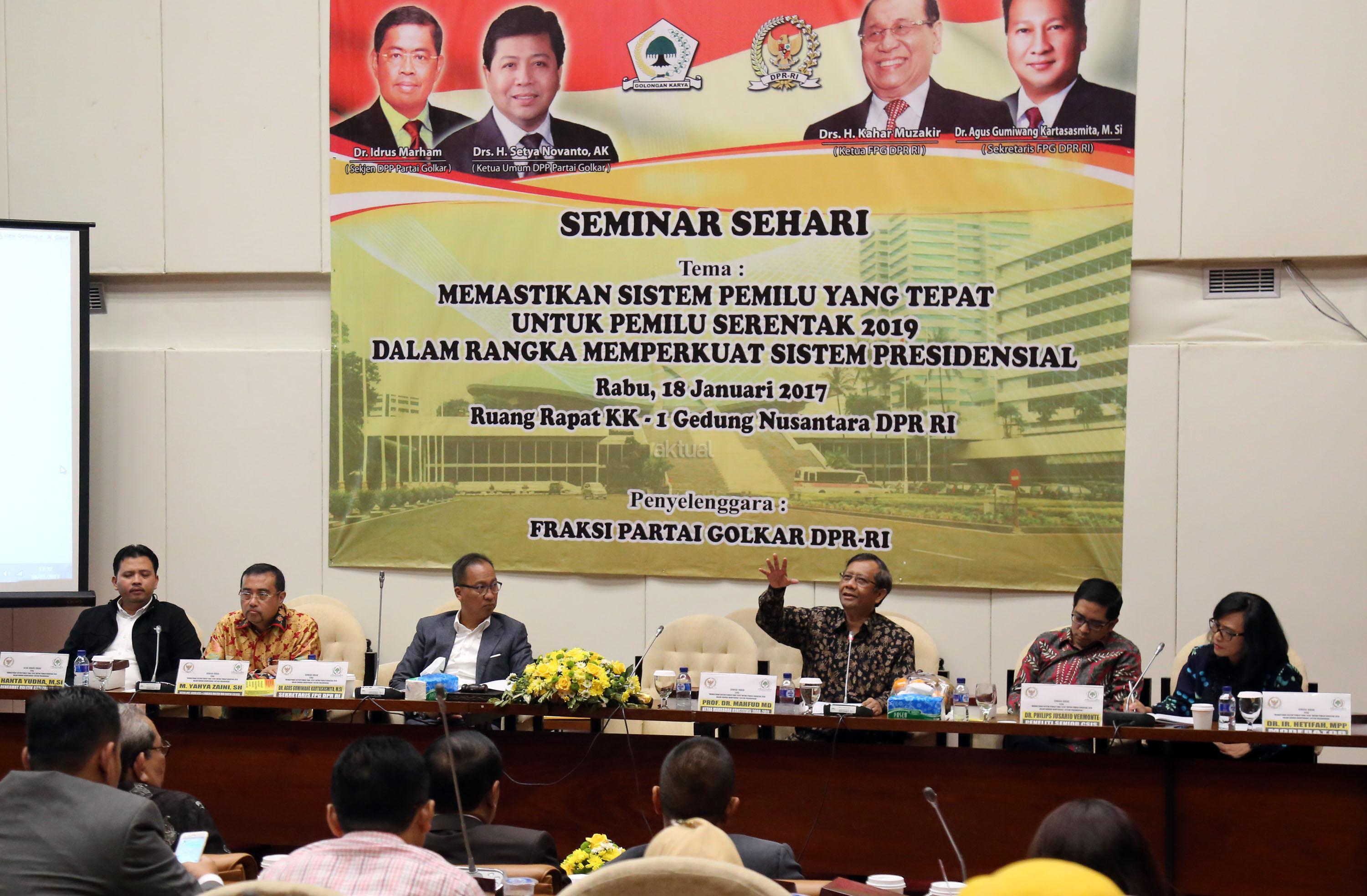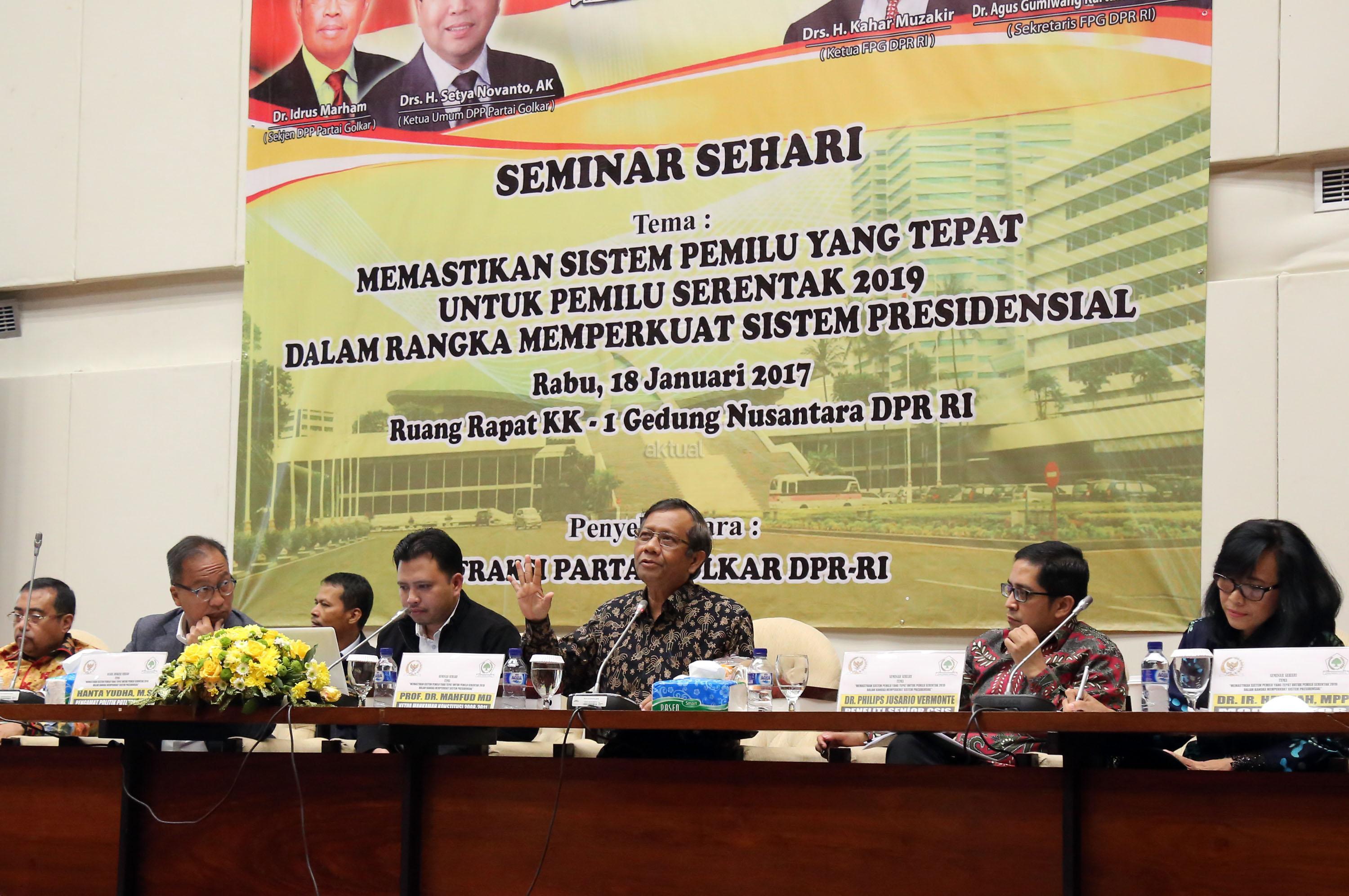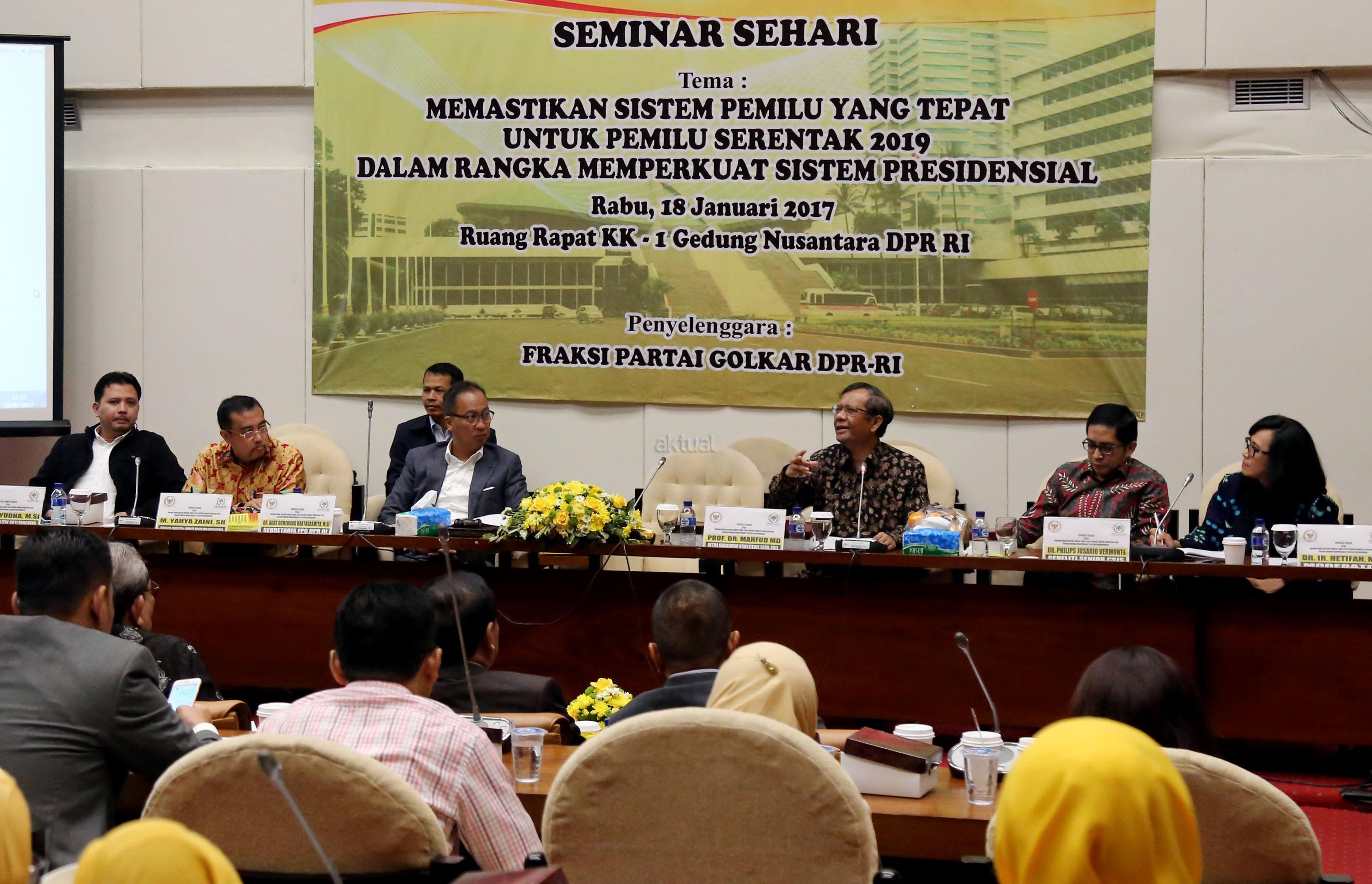 Ketua Bidang Hubungan Legislatif dan Lembaga Politik Partai Golkar Yahya Zaini, Ketua Bidang Pengabdian Masyarakat Partai Golkar Agus Gumiwang Kartasasmita, Pengamat Politik Poltracking Hanta Yudha, Ketua Mahkamah Konstitusi 2008-2011 Mahfud MD, Peneliti Senior CSIS Philips Jusario Vermonte dan Moderator Hetifah Sjafudian saat menjadi pembicara saat seminar sehari dengan tema Memastikan Sistem Pemilu yang Tepat untuk Pemilu Serentak 2019 dalam Rangka Memperkuat Sistem Presidensial di Ruang Rapat KK Gedung PArlemen, Senayan, Jakarta, Rabu (18/1/2017). AKTUAL/Tino Oktaviano