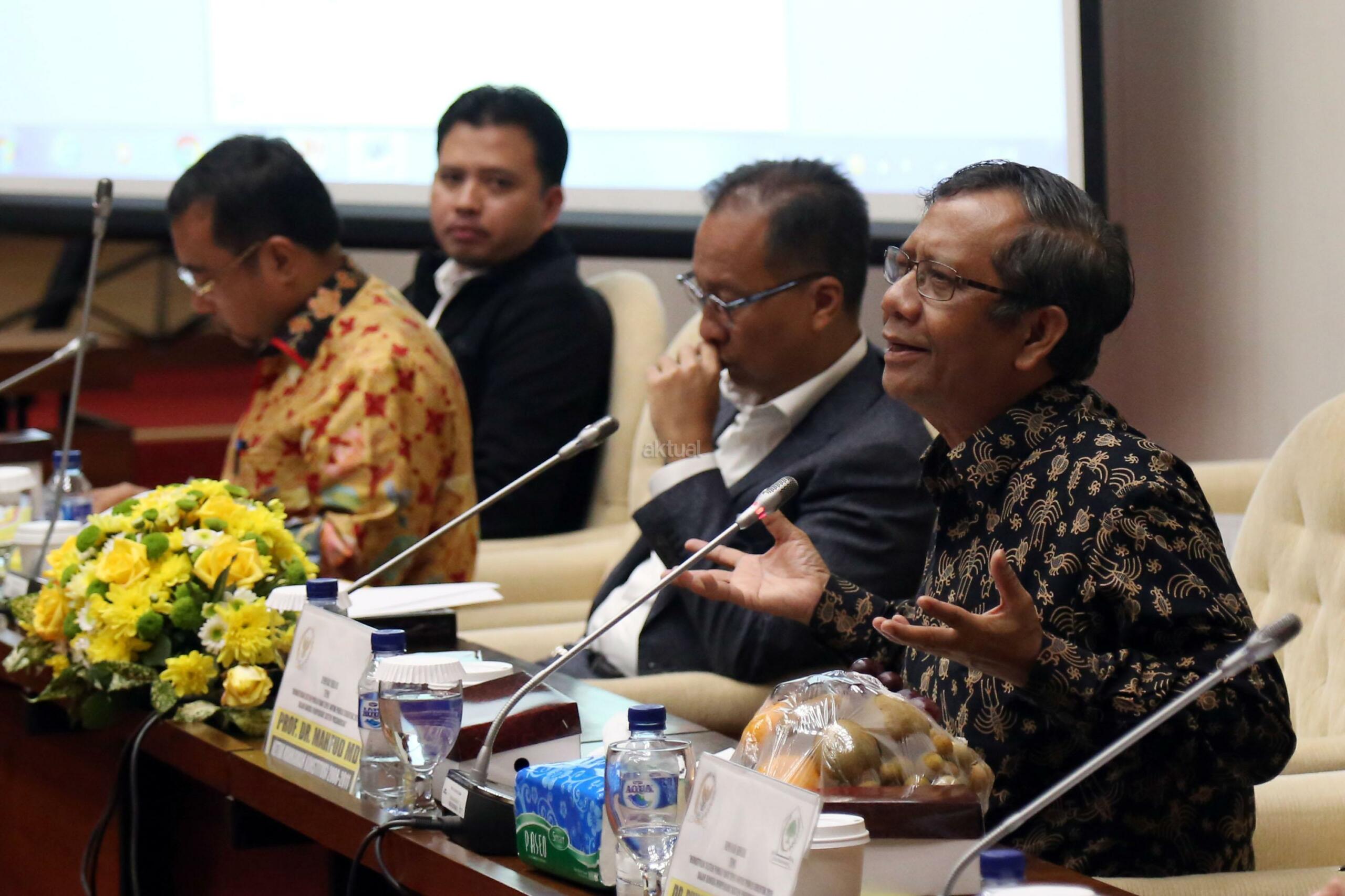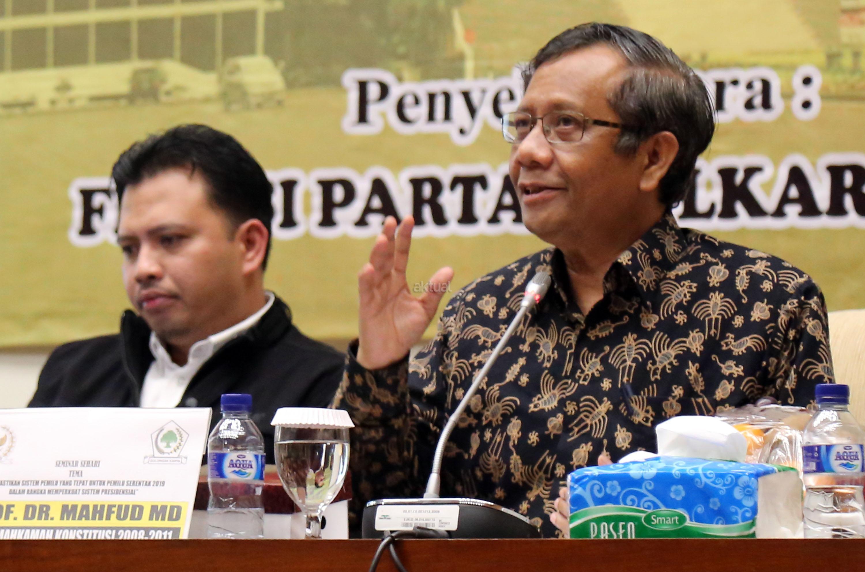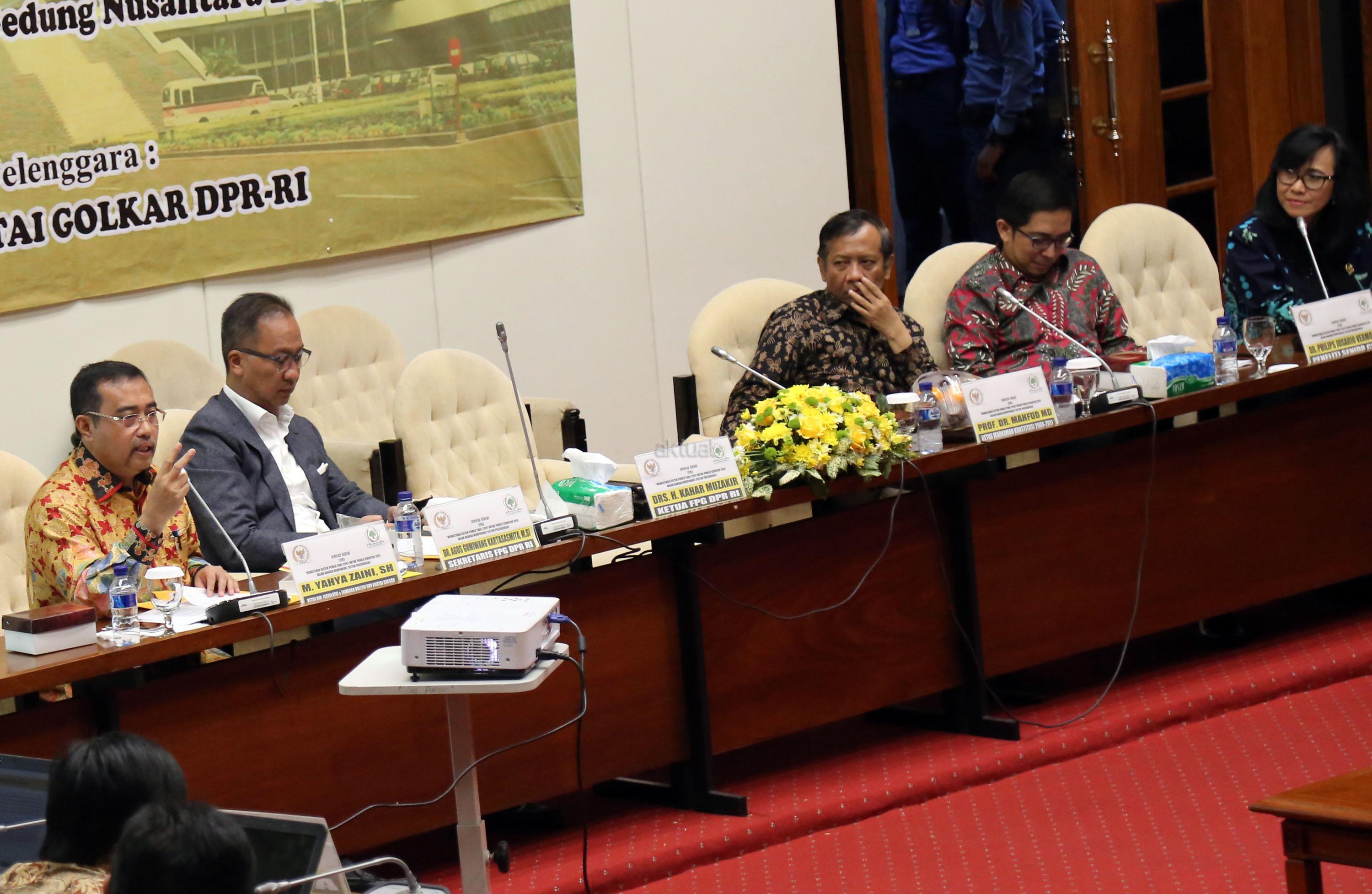 Ketua Bidang Hubungan Legislatif dan Lembaga Politik Partai Golkar Yahya Zaini, Ketua Bidang Pengabdian Masyarakat Partai Golkar Agus Gumiwang Kartasasmita, Pengamat Politik Poltracking Hanta Yudha, Ketua Mahkamah Konstitusi 2008-2011 Mahfud MD, Peneliti Senior CSIS Philips Jusario Vermonte dan Moderator Hetifah Sjafudian saat menjadi pembicara saat seminar sehari dengan tema Memastikan Sistem Pemilu yang Tepat untuk Pemilu Serentak 2019 dalam Rangka Memperkuat Sistem Presidensial di Ruang Rapat KK Gedung PArlemen, Senayan, Jakarta, Rabu (18/1/2017). AKTUAL/Tino Oktaviano