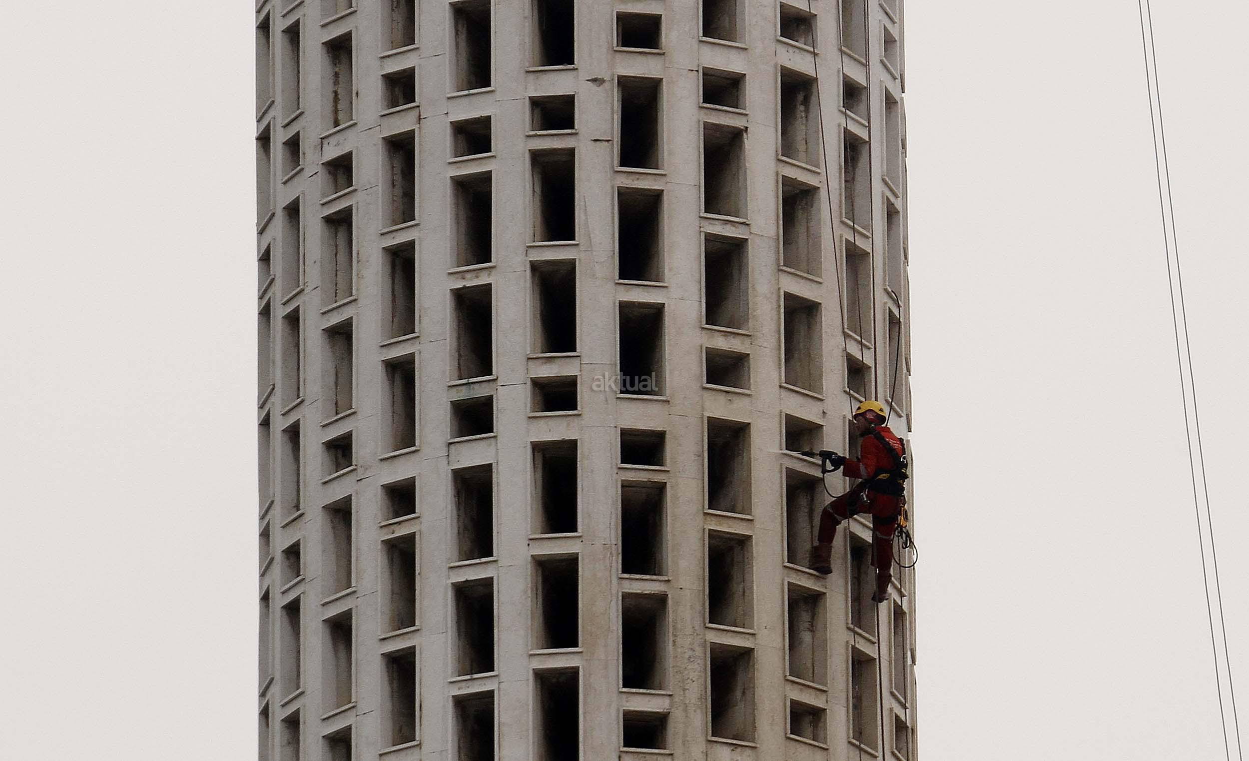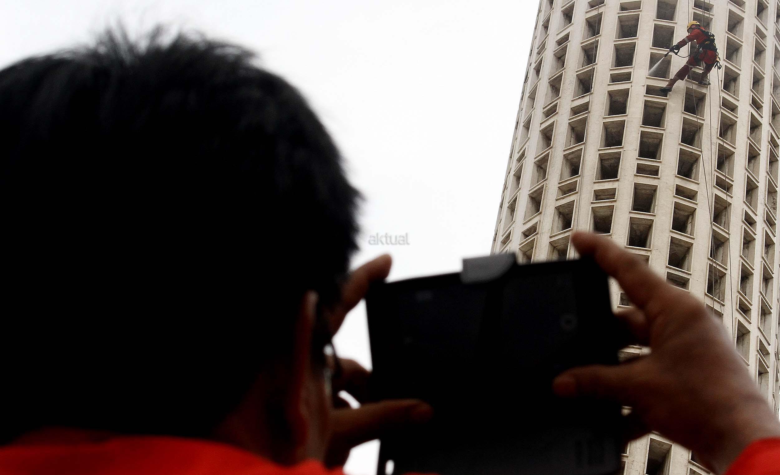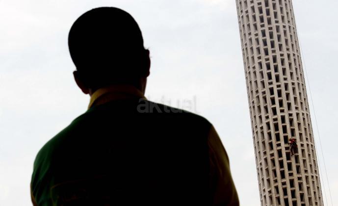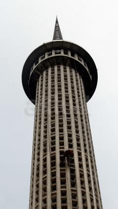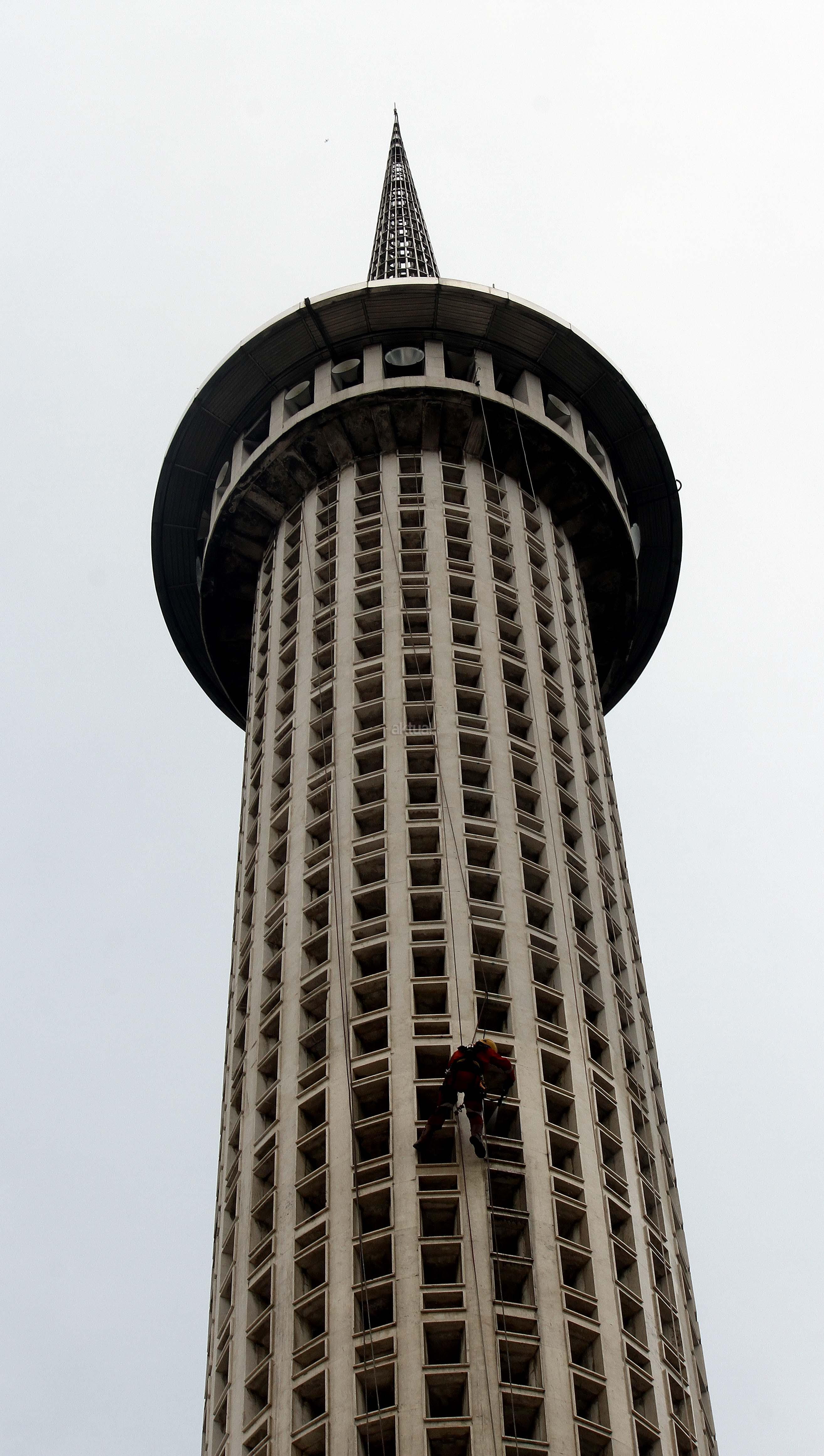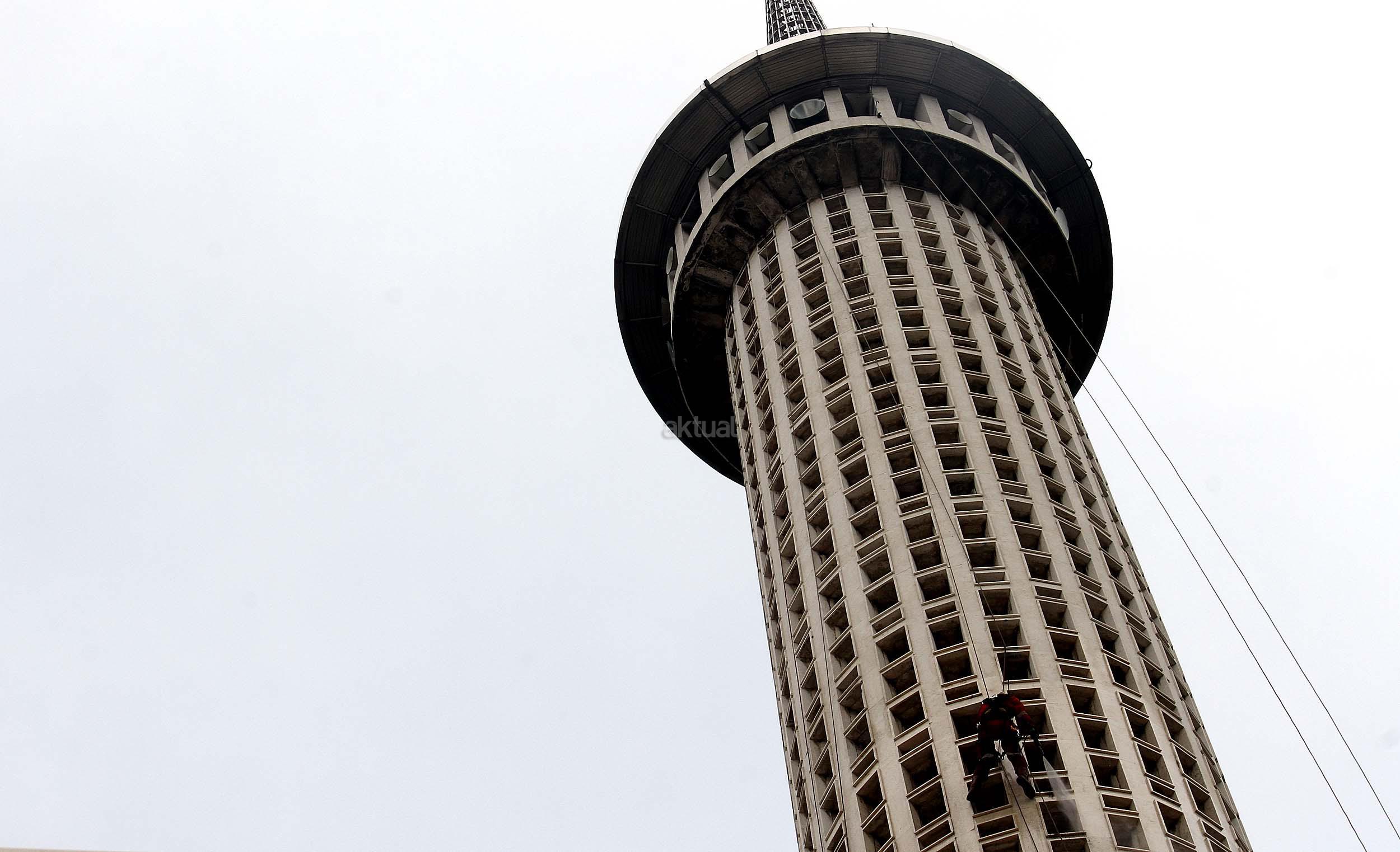 Seorang pekerja membersihkan menara Masjid Istiqal, di Jakarta, Selasa (14/6/2016). Pembersihan dilakukan sebagai bagian dari perawatan dan menjaga keindahan masjid yang banyak dikunjungi umat Muslim terutama pada bulan Ramadhan.
