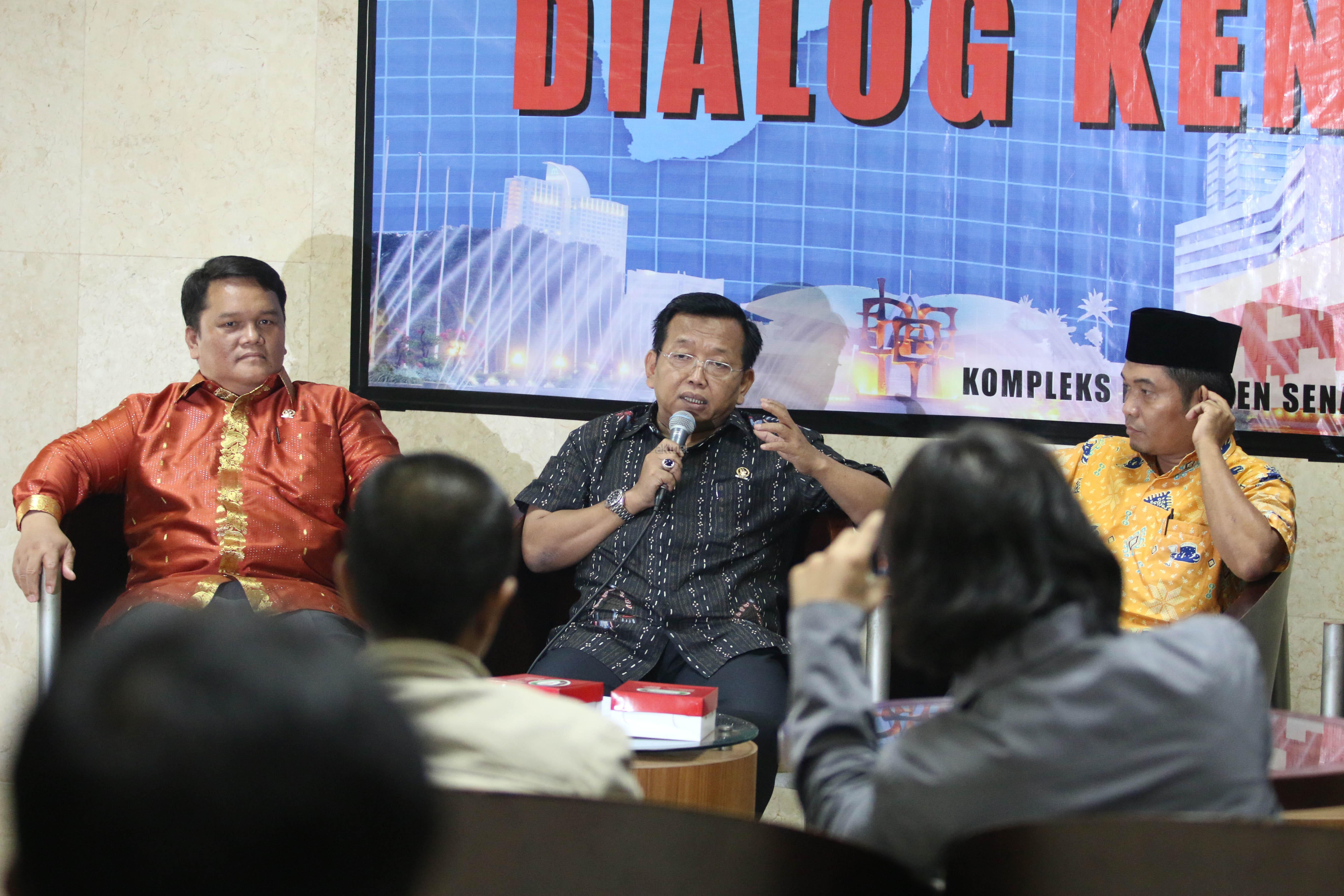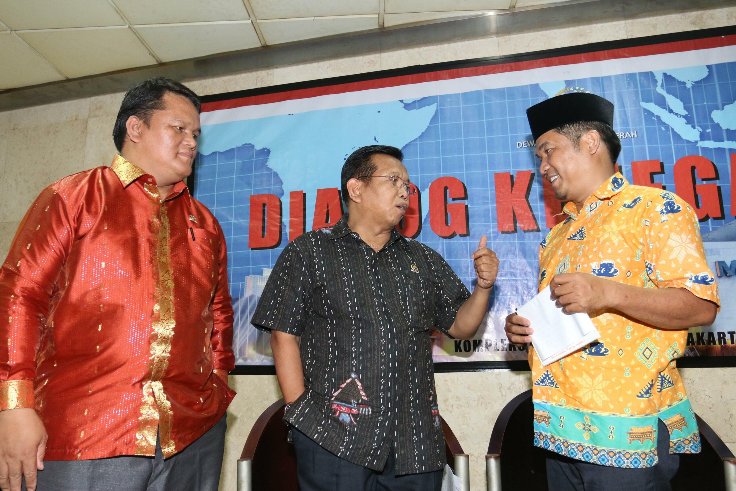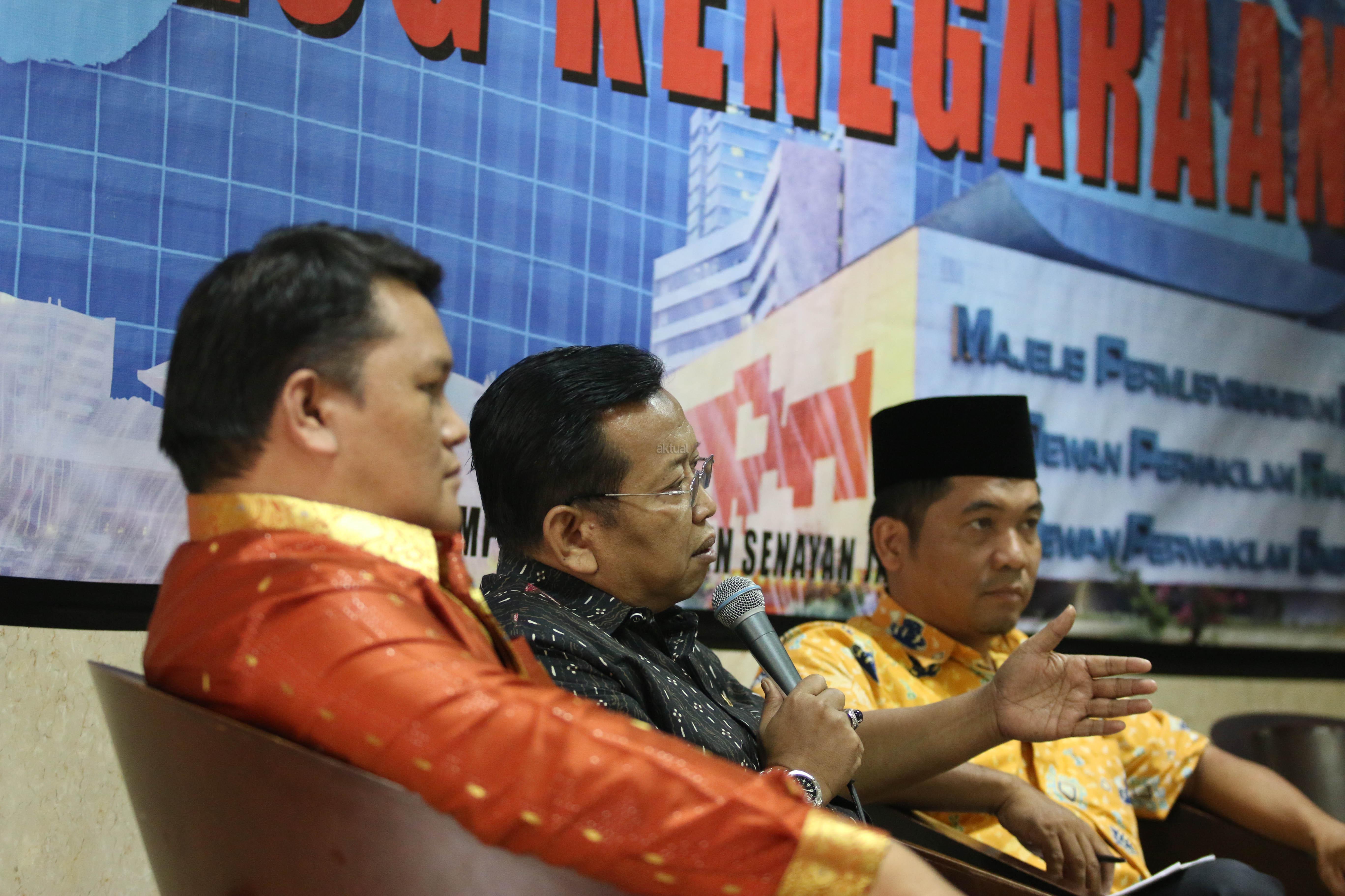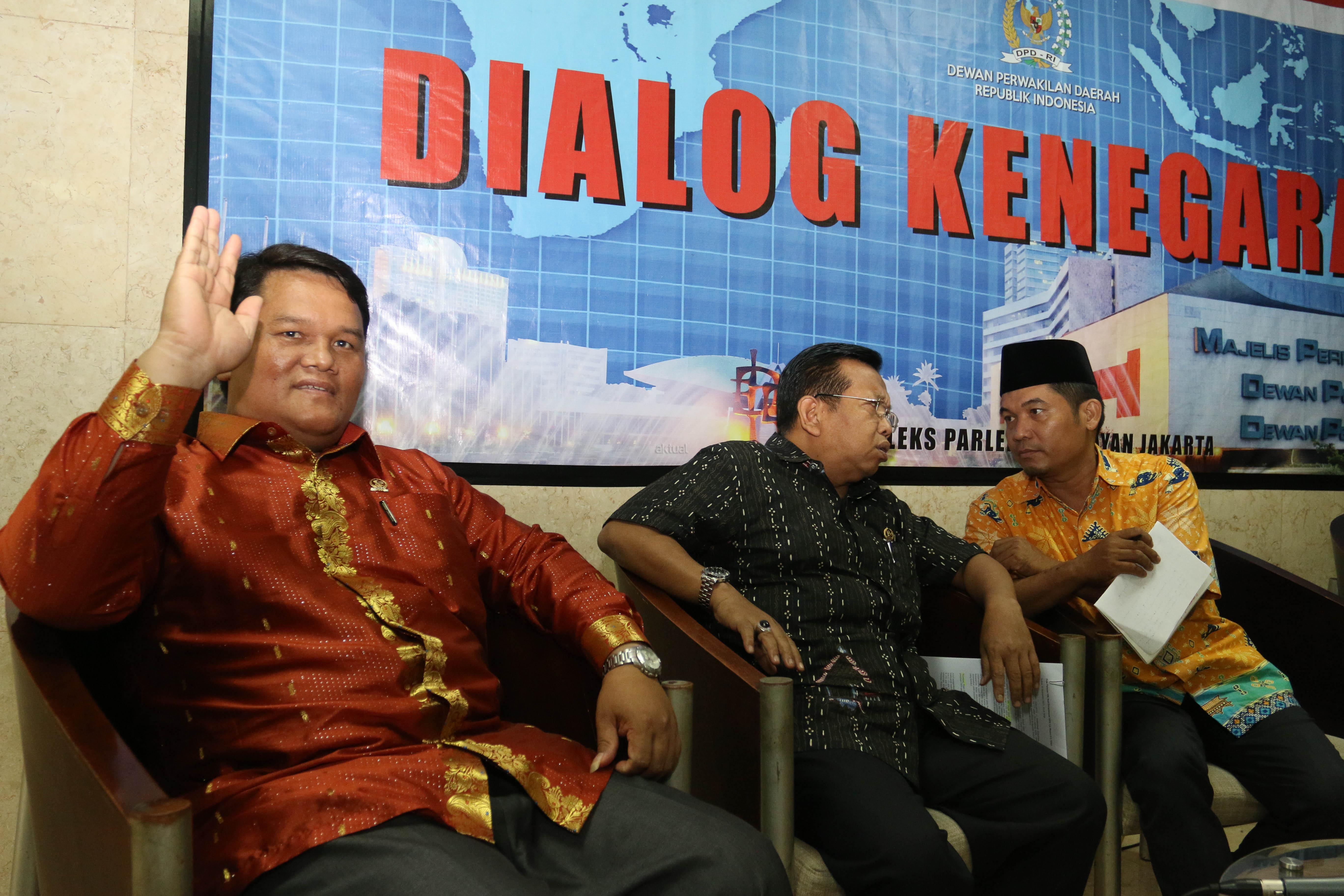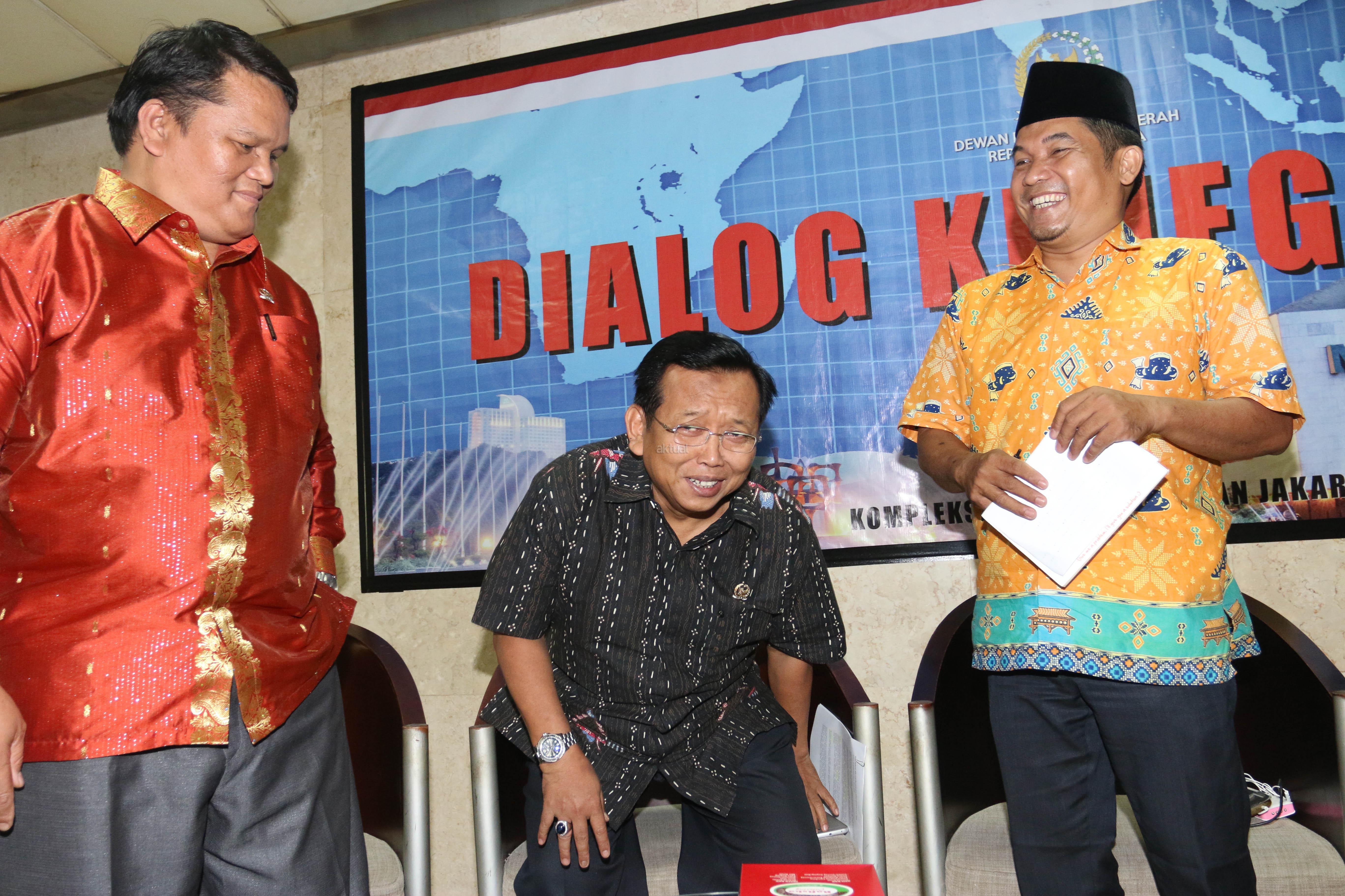 Ketua Komite I DPD Akhmad Muqowam (tengah) bersama Anggota Badan Pengembangan Kapasitas Kelembagaan (BPKK) DPD Pdt Charles Simaremare (kiri) dan Direktur Eksekutif Lima Ray Rangkuti berbincang sebelum menjadi pembicara sebuah diskusi di Kompleks Parlemen Senayan, Jakarta, Rabu (25/11). Diskusi itu membahas penguatan peran DPD sesuai putusan MK.