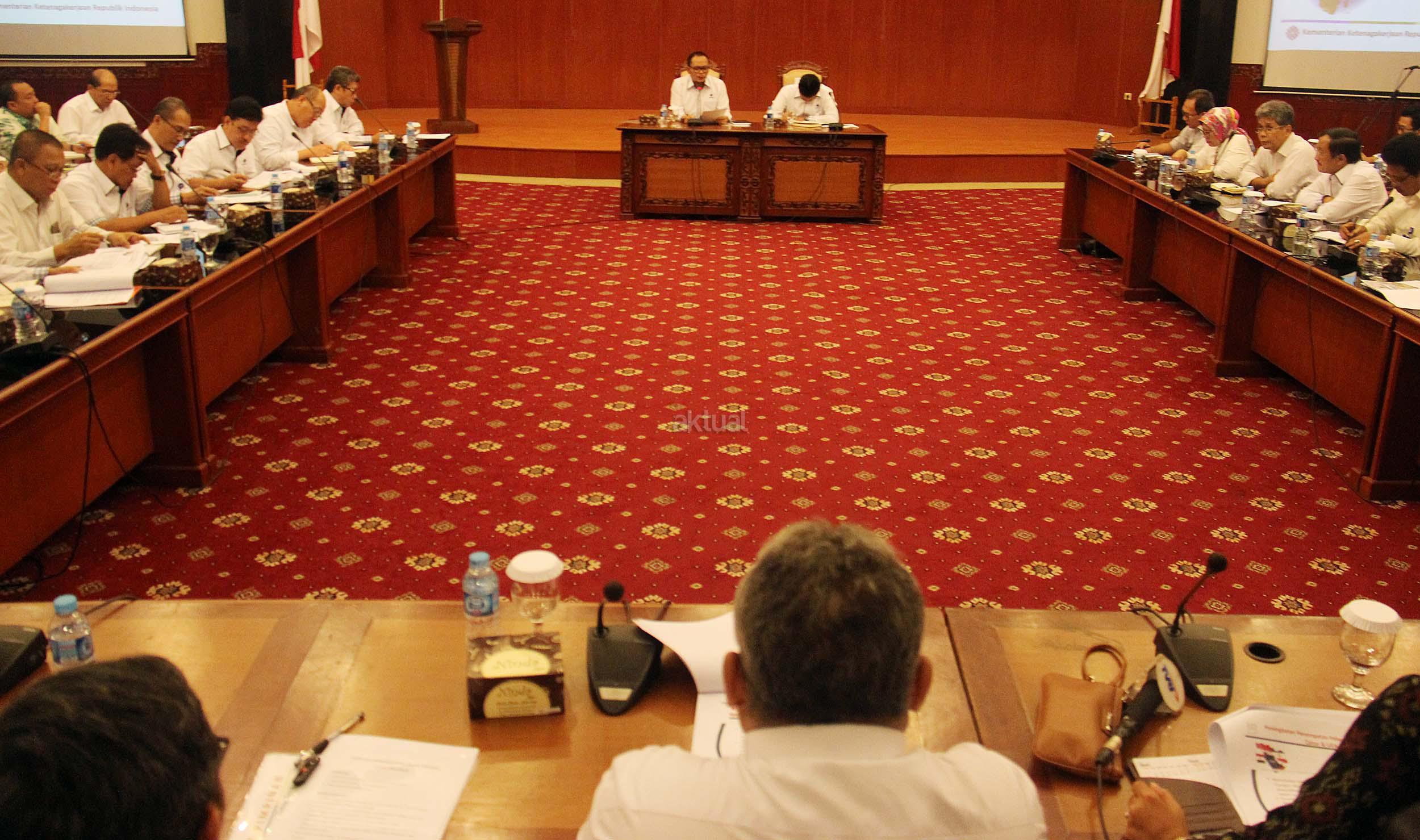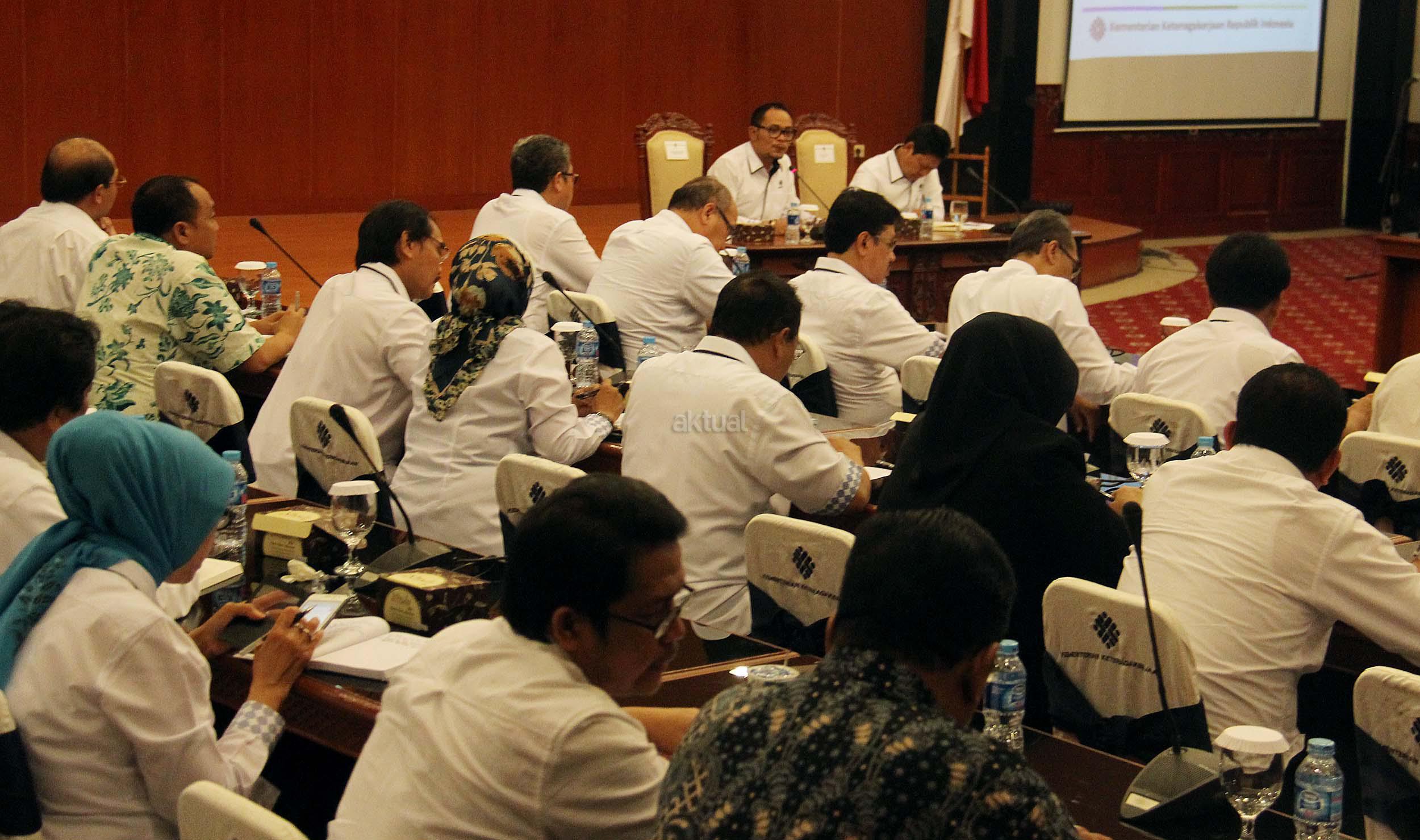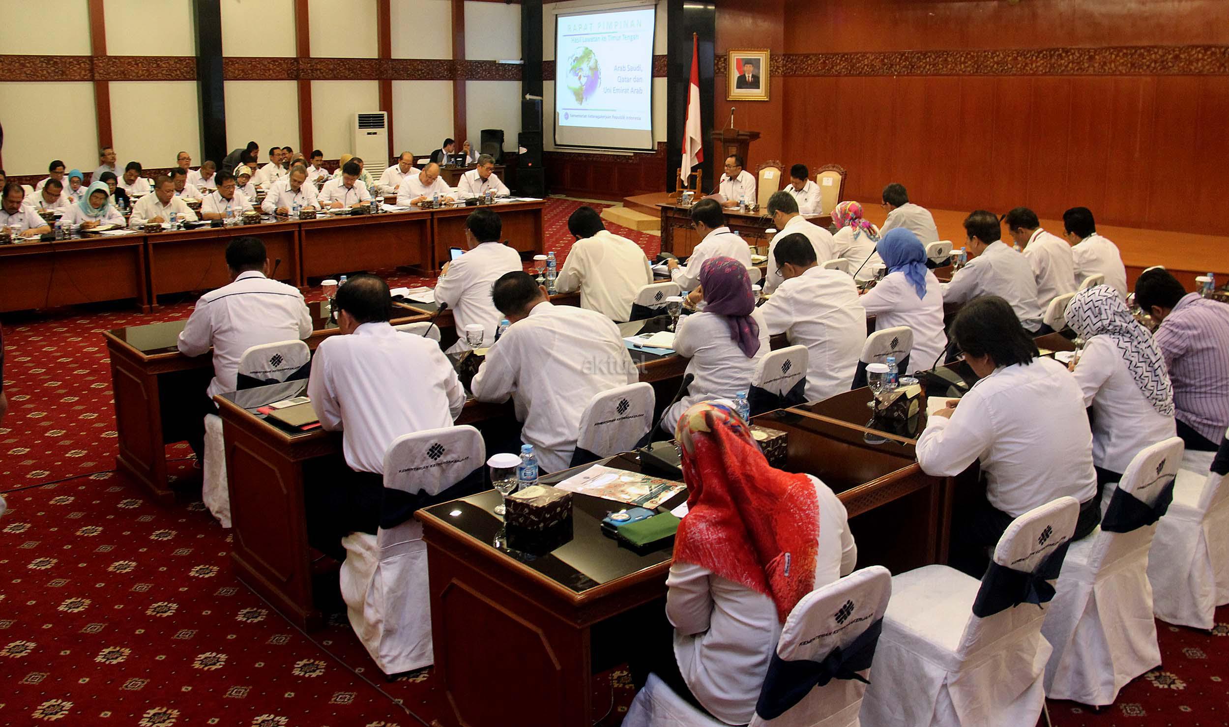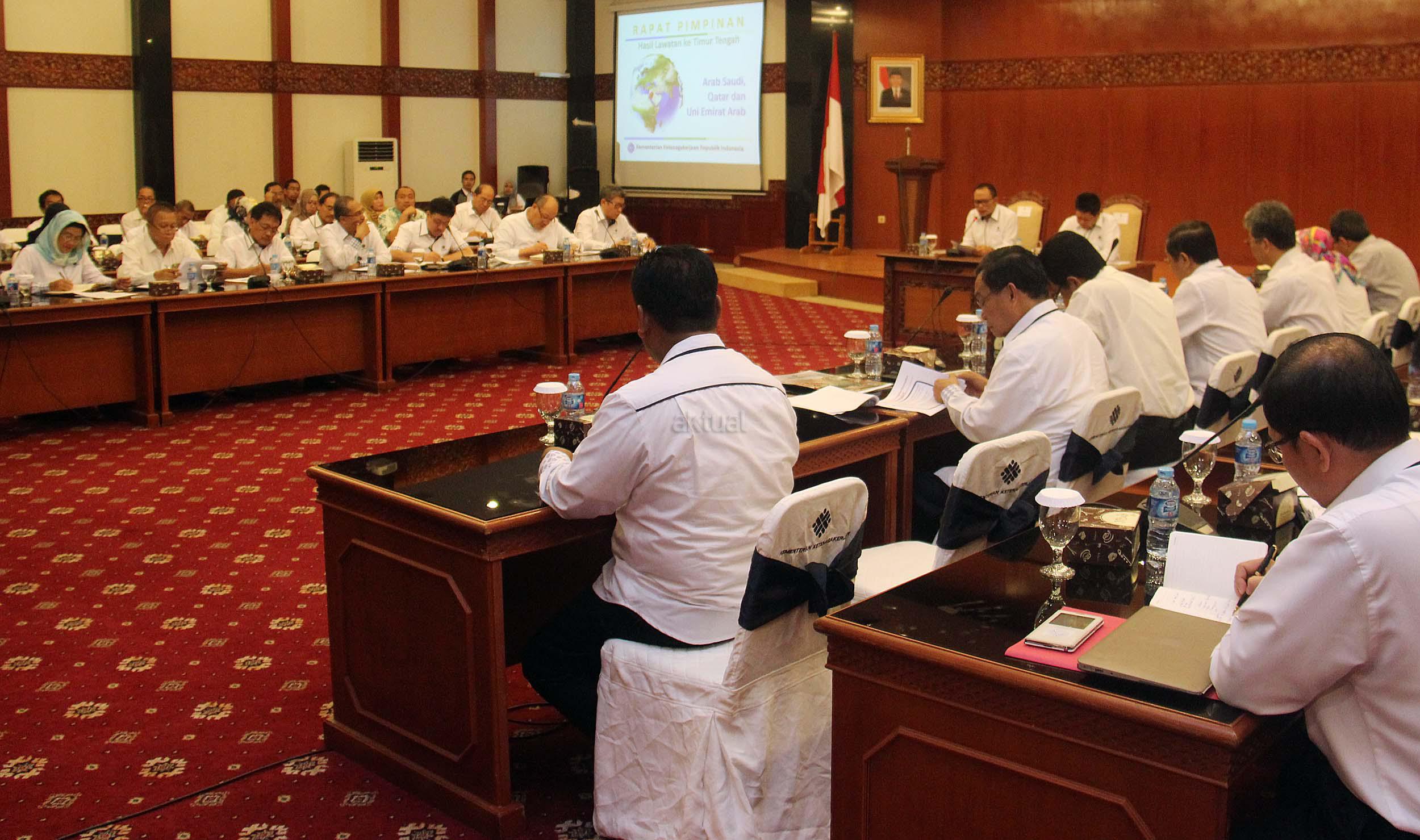 Menteri Ketenagakerjaan Muhammad Hanif Dhakiri, bersama Sekjen Kemnaker Abdul Wahab Bangkona, memimpin rapat pimpinan di Kantor Kementerian Ketenagakerjaan di Jakarta, Rabu (1/6/2016). Rapat membahas tindak lanjut hasil lawatan Menteri ke Timur Tengah, Arab Saudi, Qatar dan Uni Emirat Arab.