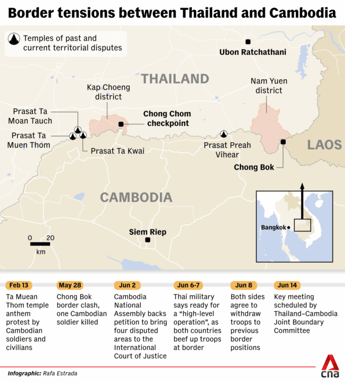 Kamboja menganggap seluruh wilayah di sekitar Kuil Preah Vihear sebagai kuil, jalur akses, dan tanah di sekitarnya adalah wilayahnya. Thailand berpendapat Mahkamah Internasional tidak pernah memutuskan batas wilayah yang tepat, dan mempertahankan posisi militer di dekatnya. Tidak ada pihak yang pernah mundur sepenuhnya.