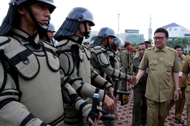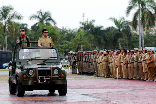 Mendagri Tjahyo Kumolo (kedua kiri) menginspeksi peserta apel Camat dan Satuan Polisi Pamong Praja (Satpol PP) se-Indonesia di Batam, Kepulauan Riau, Jumat (18/9). Apel kesiapan Camat dan Satpol PP se-Indonesia itu dilaksanakan dalam rangka mendukung suksesnya pelaksanaan pilkada serentak pada 9 Desember 2015 mendatang. ANTARA FOTO/M N Kanwa/Spt/15