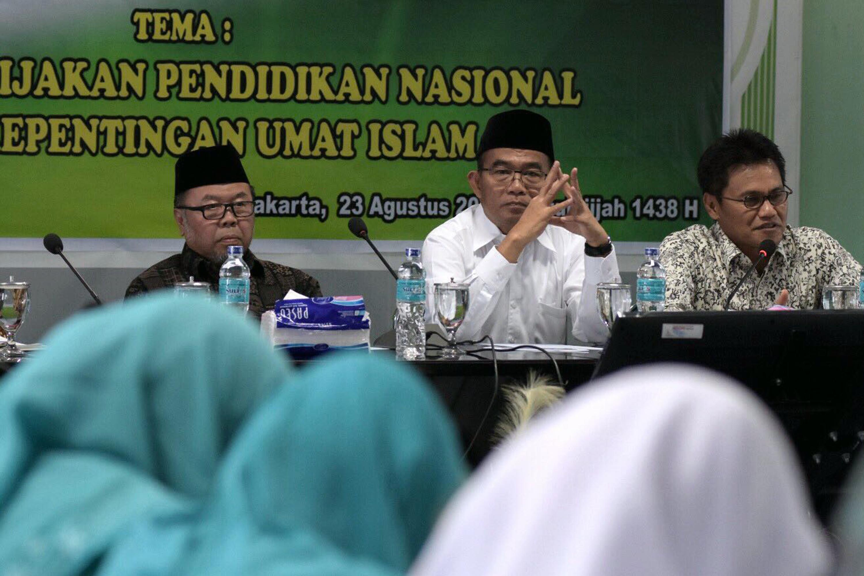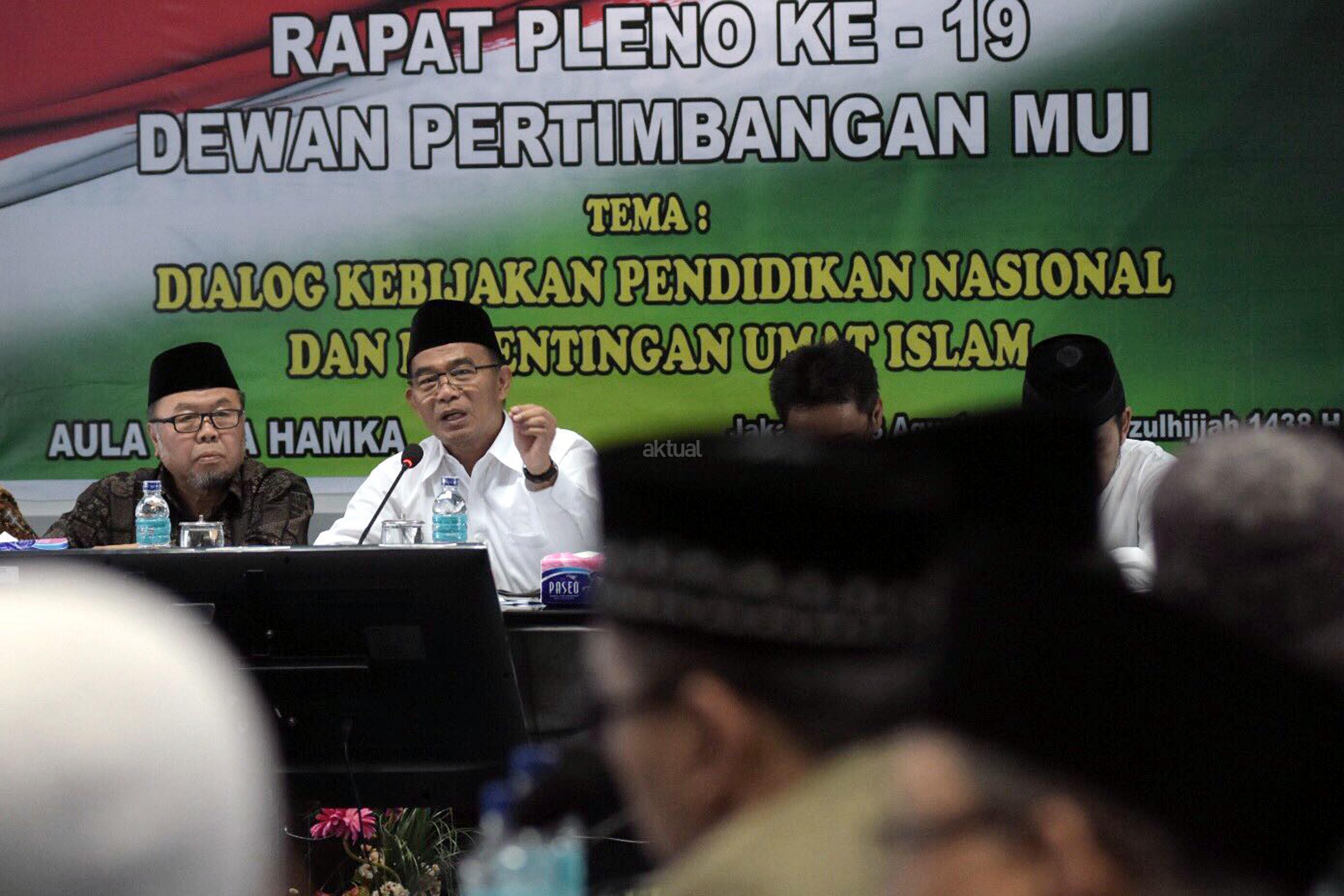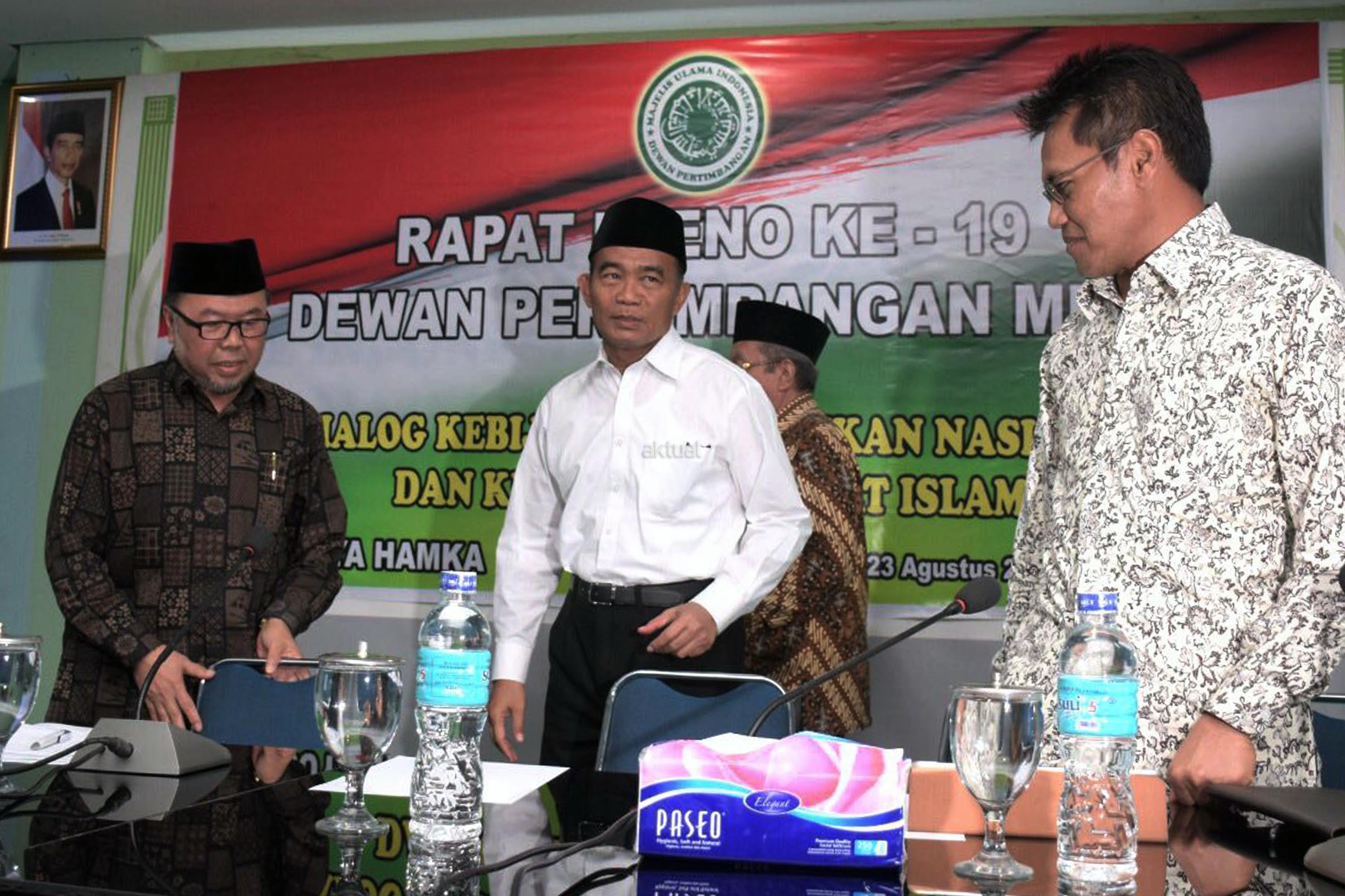 Mendikbud Muhadjir Effendy (tengah) saat menghadiri Rapat Pleno ke-19 Dewan Pertimbangan MUI di Jakarta, Rabu (23/8/2017). Selain rapat juga dilakukan Dialog Kebijakan Pendidikan Nasional dan Kepentingan Umat Islam. AKTUAL/Munzir