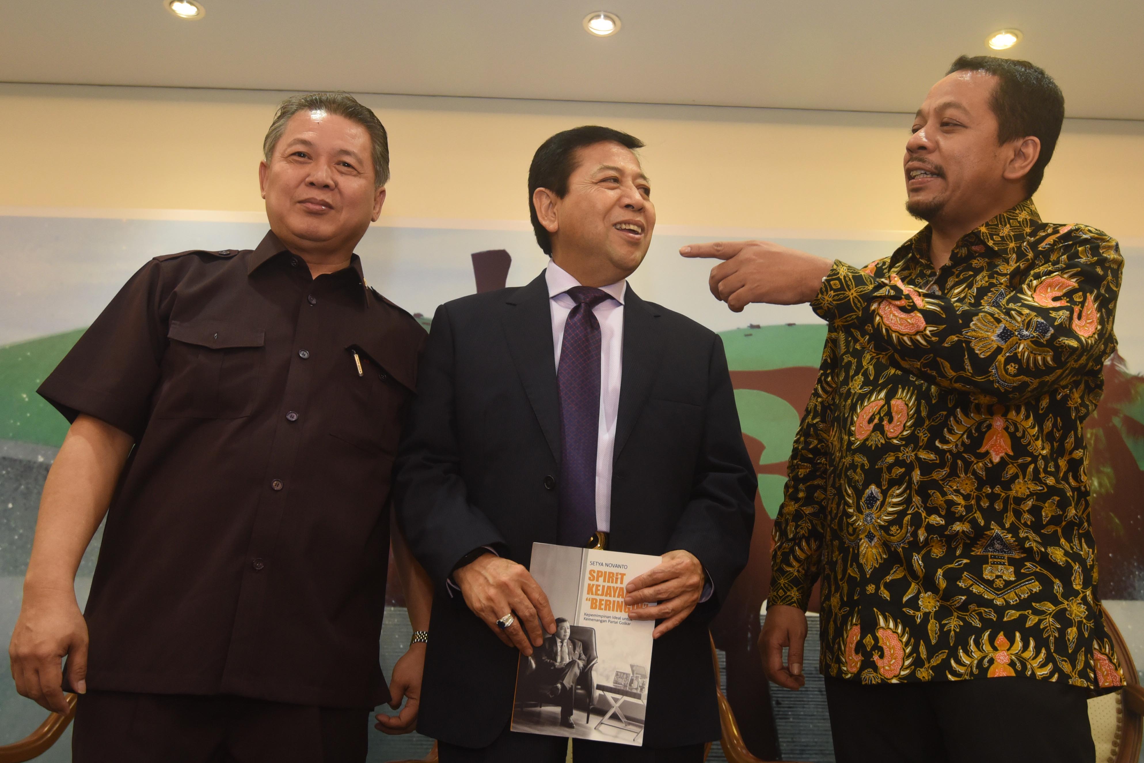 Ketua Umum Partai Golkar Setya Novanto (tengah) berbincang dengan Ketua DPP PDIP Hendrawan Supratikno (kiri) dan Direktur Eksekutif Indo Barometer Muhammad Qodari sebelum berlangsungnya diskusi dialektika demokrasi di Kompleks Parlemen Senayan, Jakarta, Kamis (19/5). Diskusi itu mengangkat tema 'Mengapa pemerintah berebut Golkar'. ANTARA FOTO/Akbar Nugroho Gumay/aww/16.