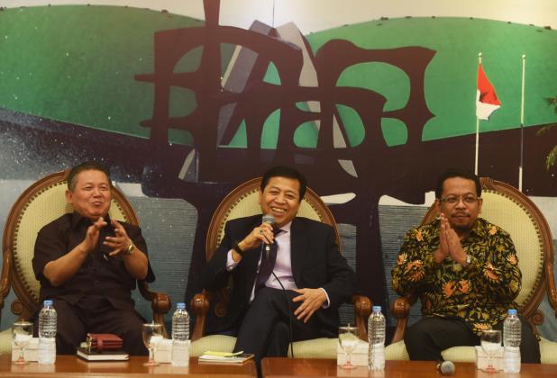 Ketua Umum Partai Golkar Setya Novanto (tengah) menyampaikan pandangannya disaksikan Ketua DPP PDIP Hendrawan Supratikno (kiri) dan Direktur Eksekutif Indo Barometer Muhammad Qodari dalam diskusi dialektika demokrasi di Kompleks Parlemen Senayan, Jakarta, Kamis (19/5). Diskusi itu mengangkat tema 'Mengapa pemerintah berebut Golkar'. ANTARA FOTO/Akbar Nugroho Gumay/aww/16.