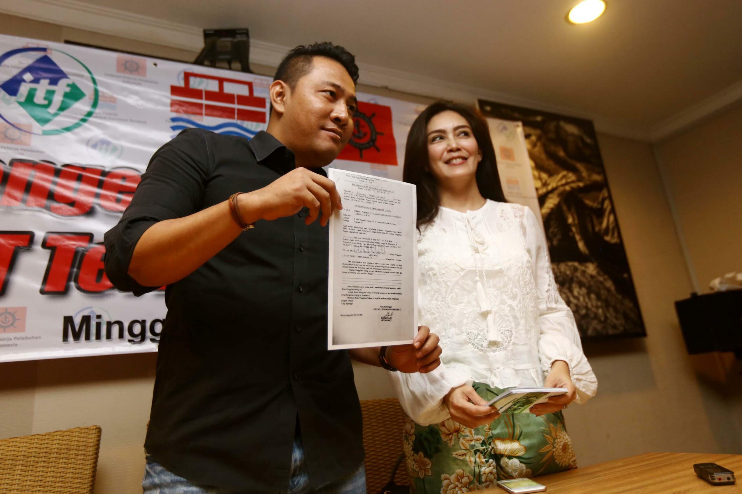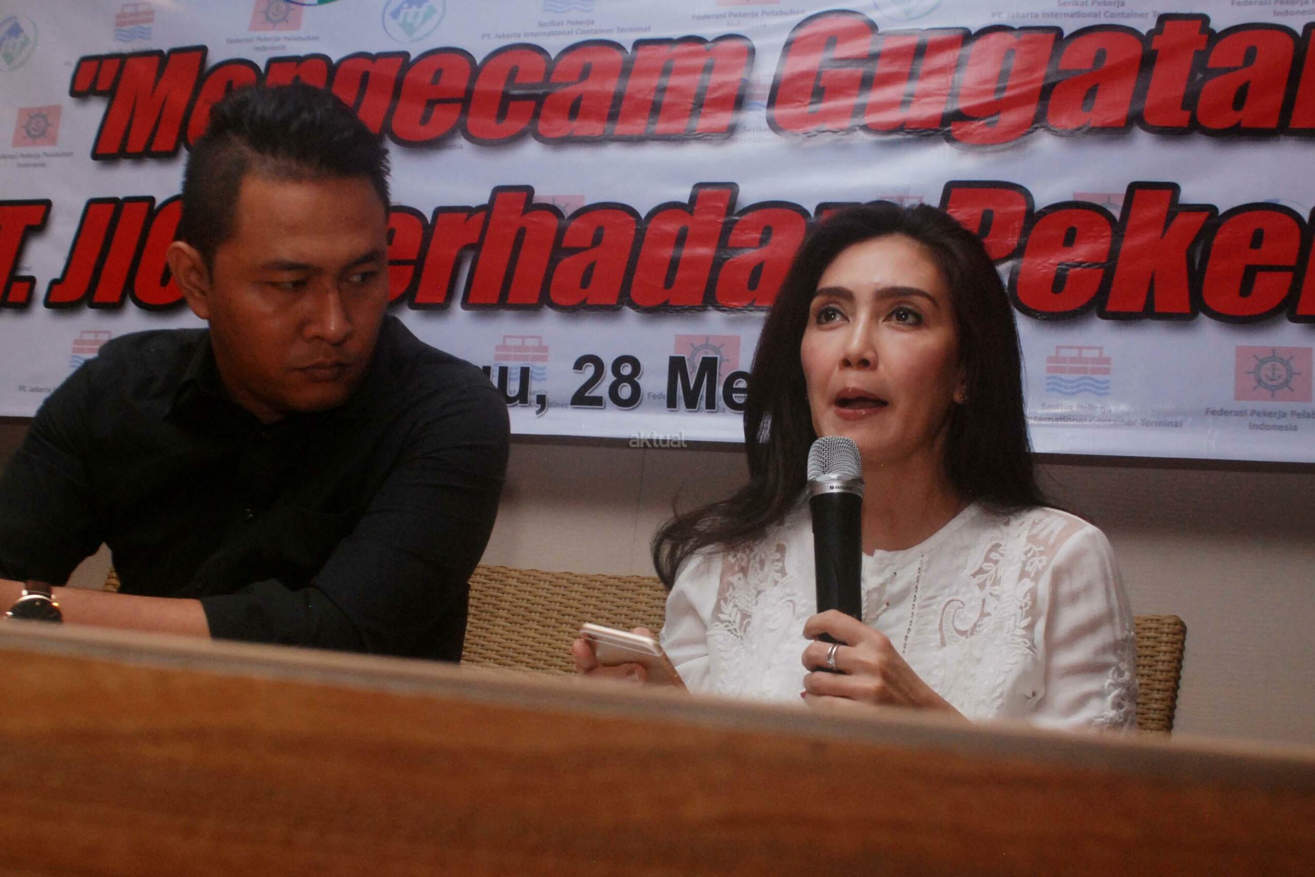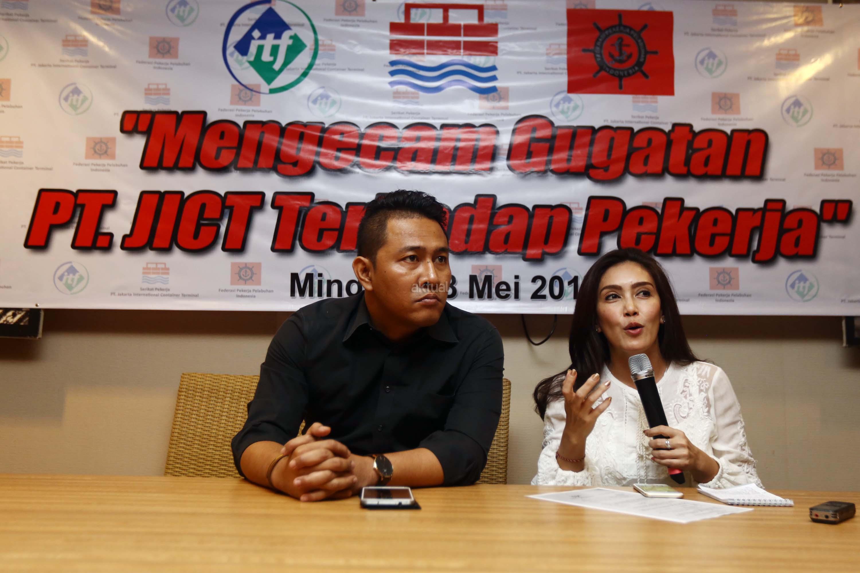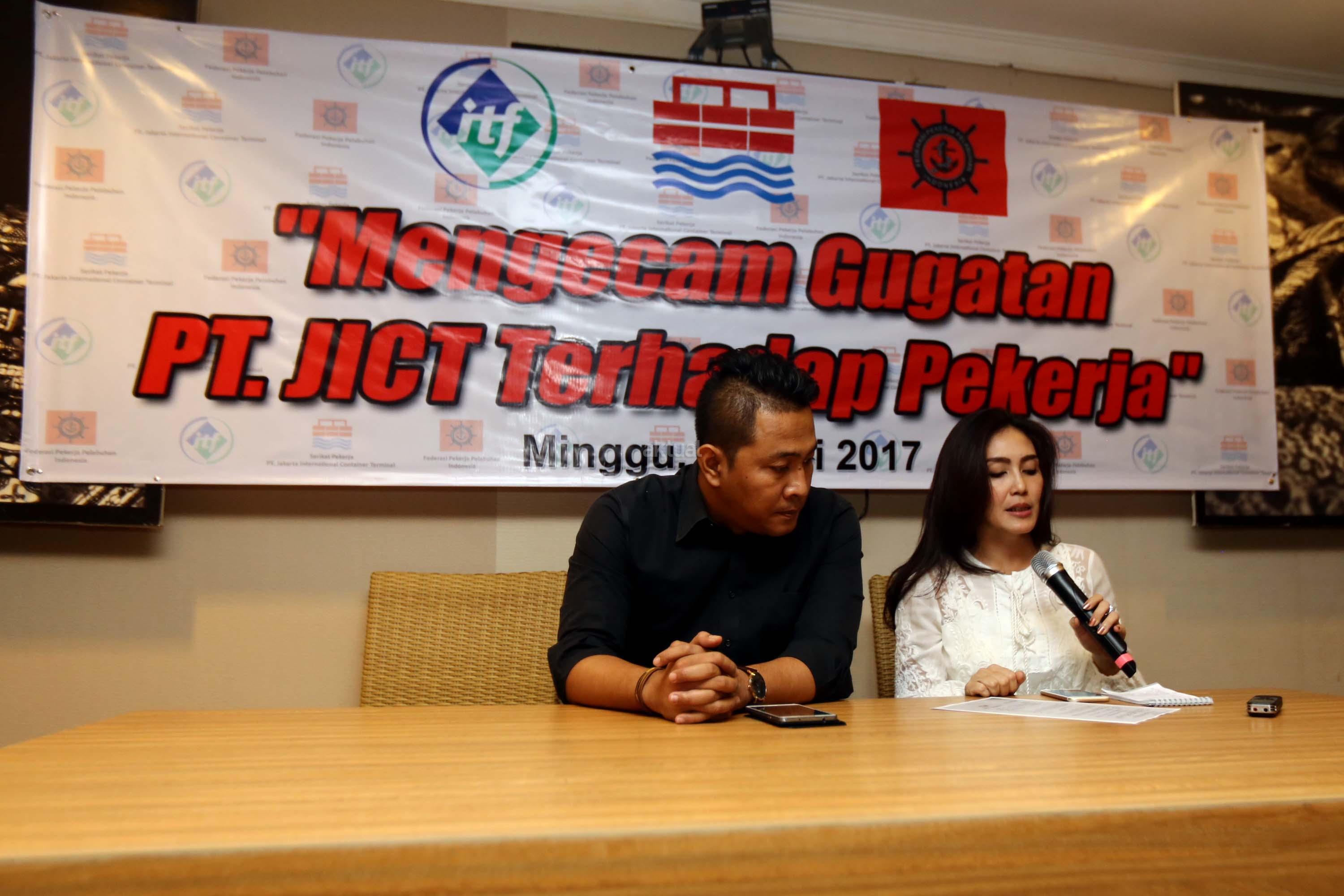 Ketua Serikat Pekerja JICT Nova Sofyan Hakim (kiri), Anggota Komisi VI DPR Rieke Diah Pitaloka(kanan) saat menggelar jumpa pers terkait gugatan PT.JICT terhadap karyawannya, di Jakarta, Minggu (28/5/2017). Dalam jumpa persnya SP JICT mengecam Direksi perusahaan yang menggugat Serikat bersama 4 duty manager dan koperasi PT JICT. PT JICT menggugat 4 duty manager dan Serikat Pekerja berserta Koperasi senilai Rp. 136 milyar atas tuduhan menghapus ploting karyawan perbantuan alat bantu RTGC Pelindo II di JICT. AKTUAL/Munzir