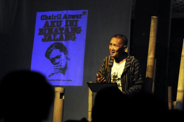 Seorang seniman membacakan puisi pada pementasan teater dan puisi di Bekasi, Jawa Barat, Jumat (29/4) malam. Pementasan digelar untuk mengenang 67 tahun penyair pelopor angkatan 1945 Chairil Anwar. ANTARA FOTO/Suwandy/pd/16