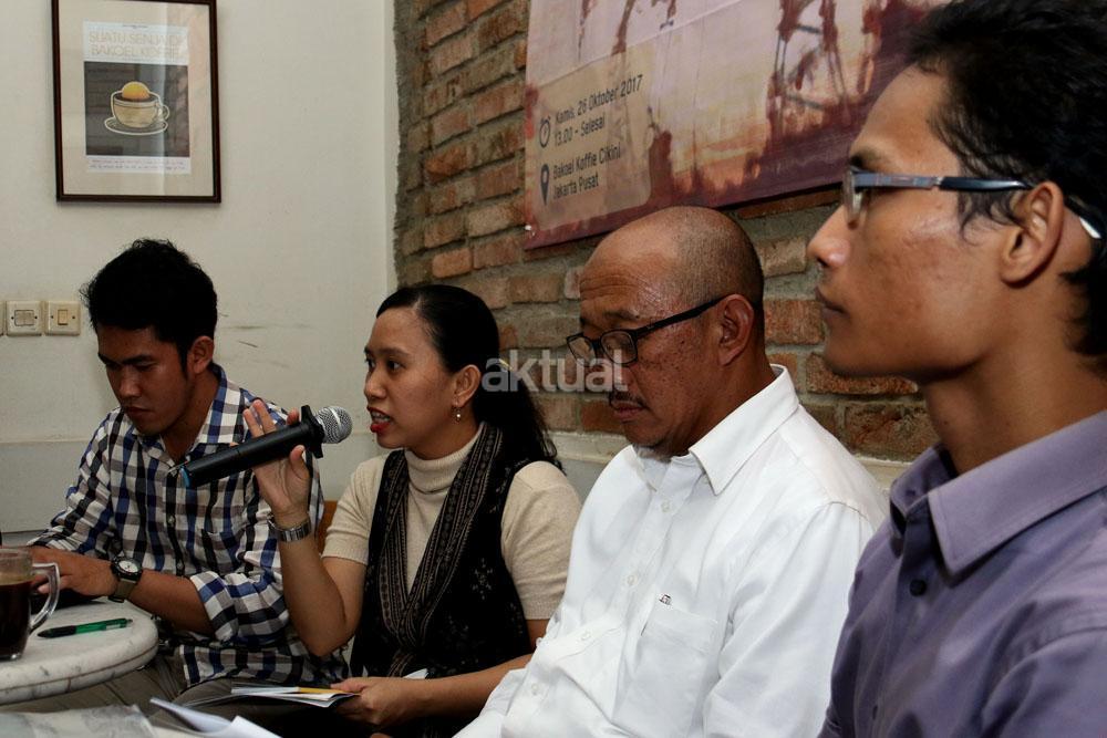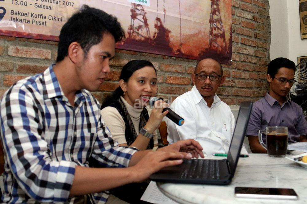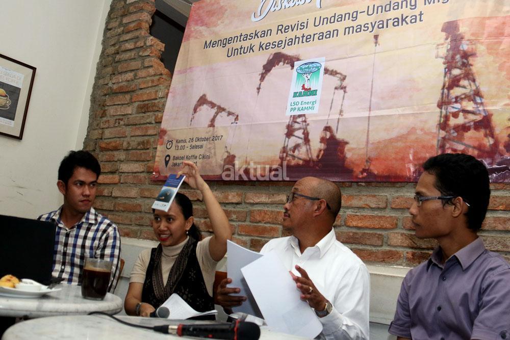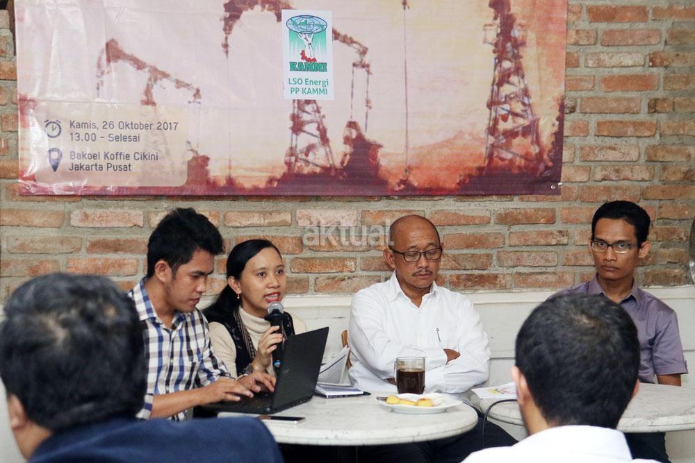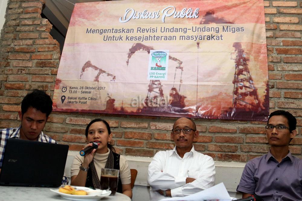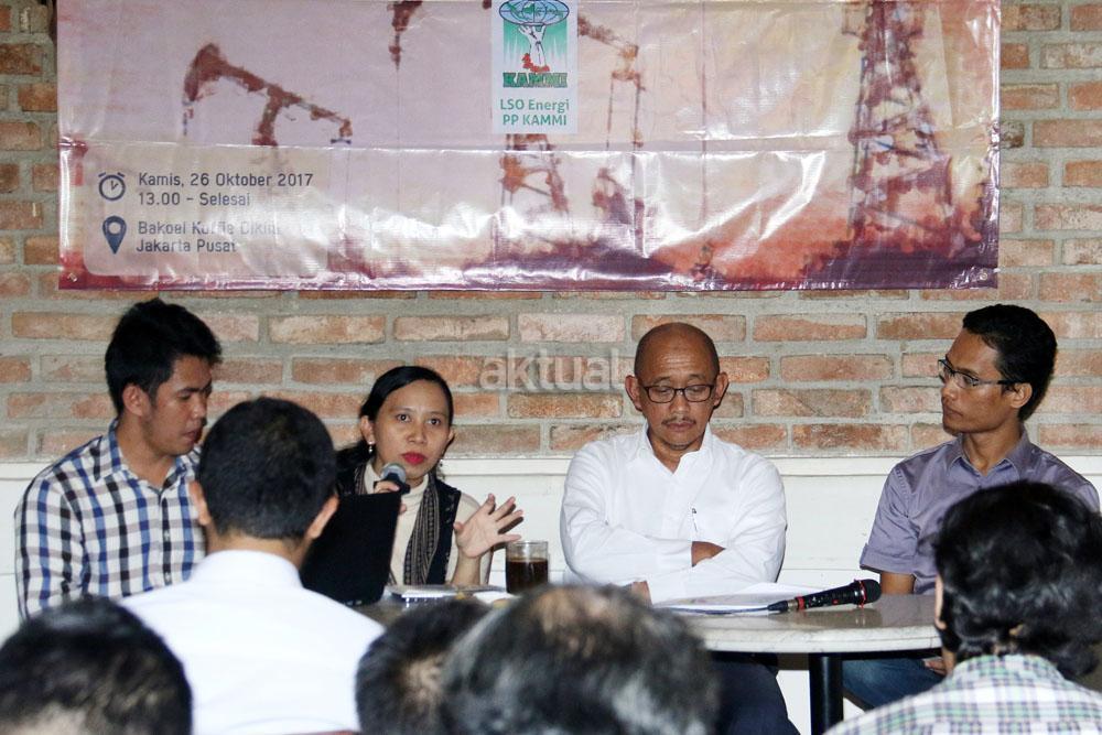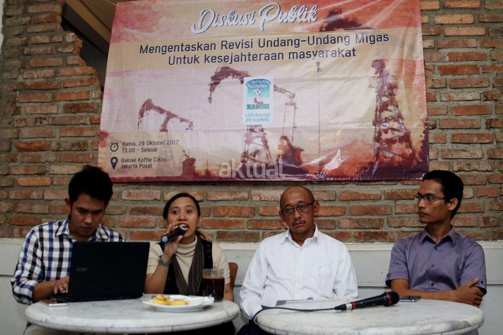 Kiri-kanan ; Dir LSO Hukum PP KAMMI Irawan Malebra, PWYP Indonesia Meliana Lumbatoruan, Dewan Pembina Serikat Pekerja SKK Migas Elan Biantoro, Dir LSO Energi PP KAMMI Barri Pratama saat menjadi pembicara diskusi Migas di Jakarta, Kamis (26/10/2017). Diskusi yang diselenggarakan oleh Pimpinan Pusat Kesatuan Aksi Mahasiswa Muslim Indonesia (PP KAMMI ) dalam tema ” Mengentaskan Revisi Undang-Undang Migas Untuk Kesejahteraan Masyarakat”. AKTUAL/Munzir