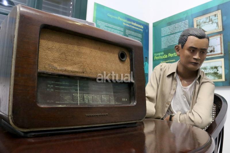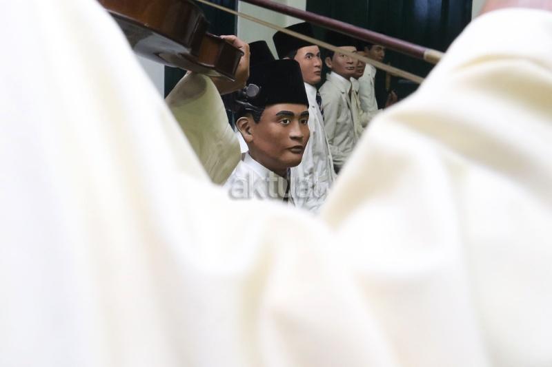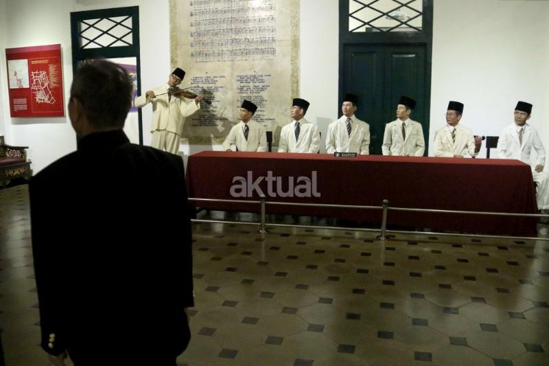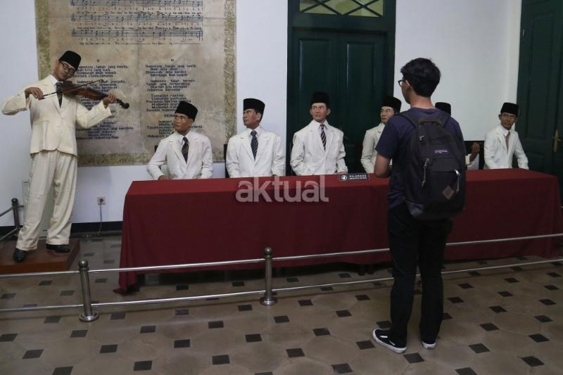 Seorang pengunjung saat melihat patung diorama W.R.Supratman di Museum Sumpah Pemud, Jalan Kramat Raya, Jakarta Pusat, Jumat (28/10/2017). Peringatan Sumpah Pemuda ke-89 pada 28 Oktober 2017 menjadi momentum bagi seluruh elemen bangsa untuk mengenang kembali tekad pemuda Indonesia yang mengikrarkan komitmen persatuan dan kesatuan Indonesia. AKTUAL/Munzir