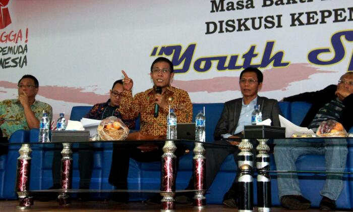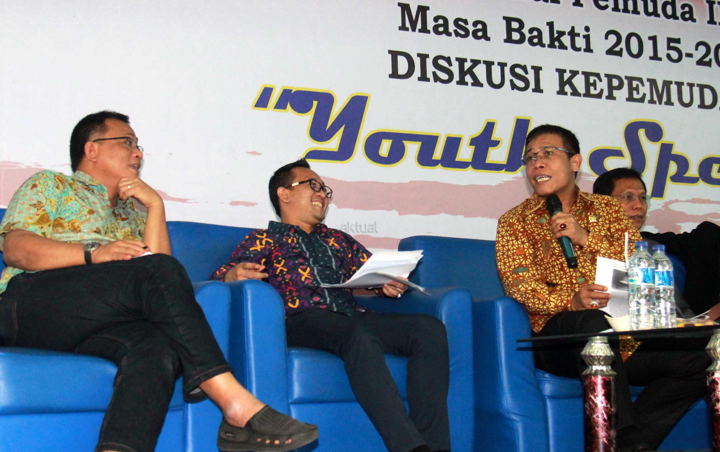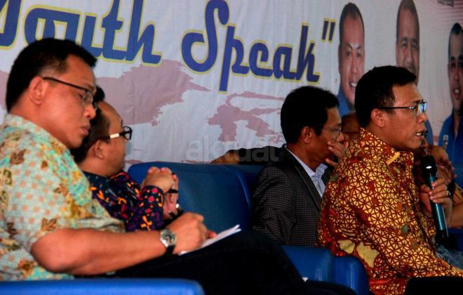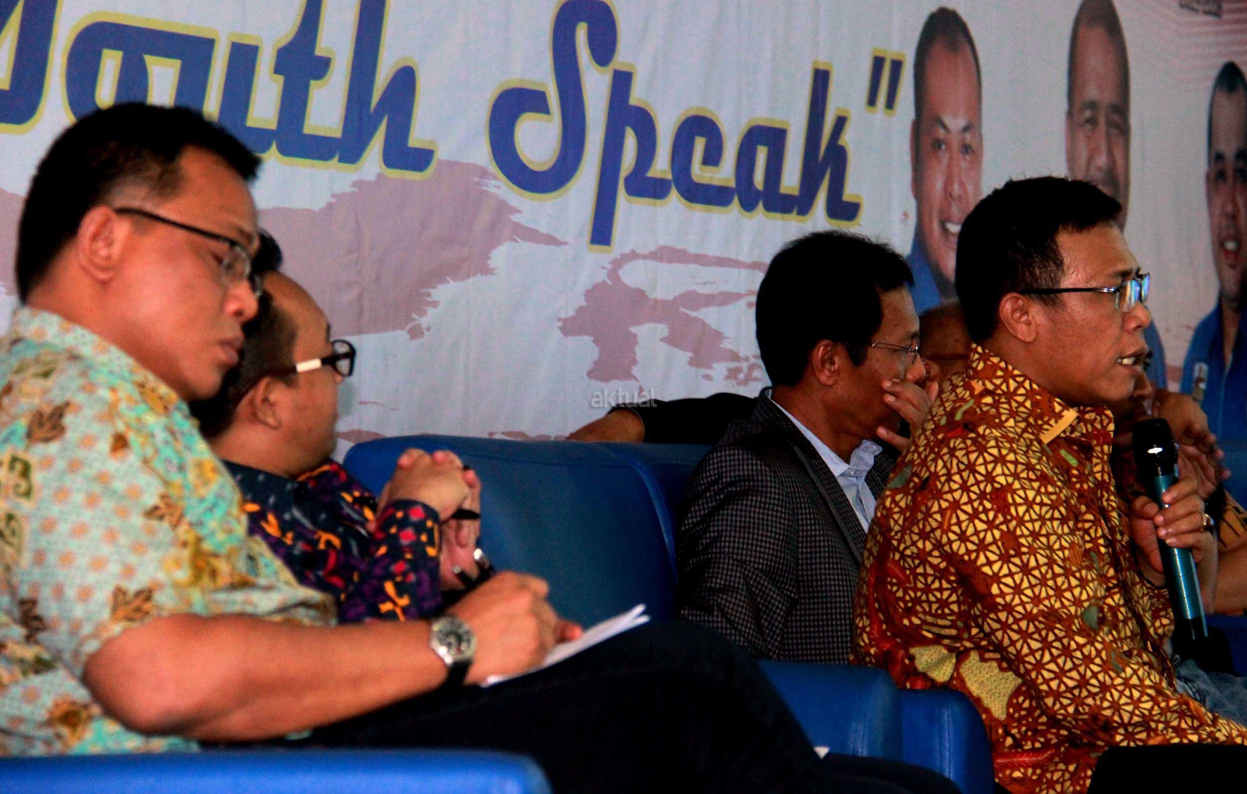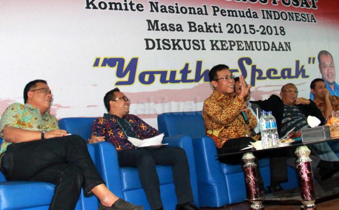 Kika ; Aktivis Pergerakan Moh.Jumhur Hidayat, Mantan Aktivis Mahasiswa Giofedi Rauf, Anggota Komisi III DPR RI Masinton Pasaribu, Mantan Direktur Tindak Pidana Ekonomi Khusus Bareskrim Polri Brigjen (Purn) Victor Edison Simanjuntak, Praktisi Hukum Eggi Sudjana, Ketua SP JICT Nova Sofyan Hakim dalam diskusi DPP KNPI, di Gedung Pemuda/DPP KNPI, Jakarta, Selasa (13/10/2015). Tema diskusi DPP KNPI "Mengurai Benang Kusut Korupsi Pelindo II"