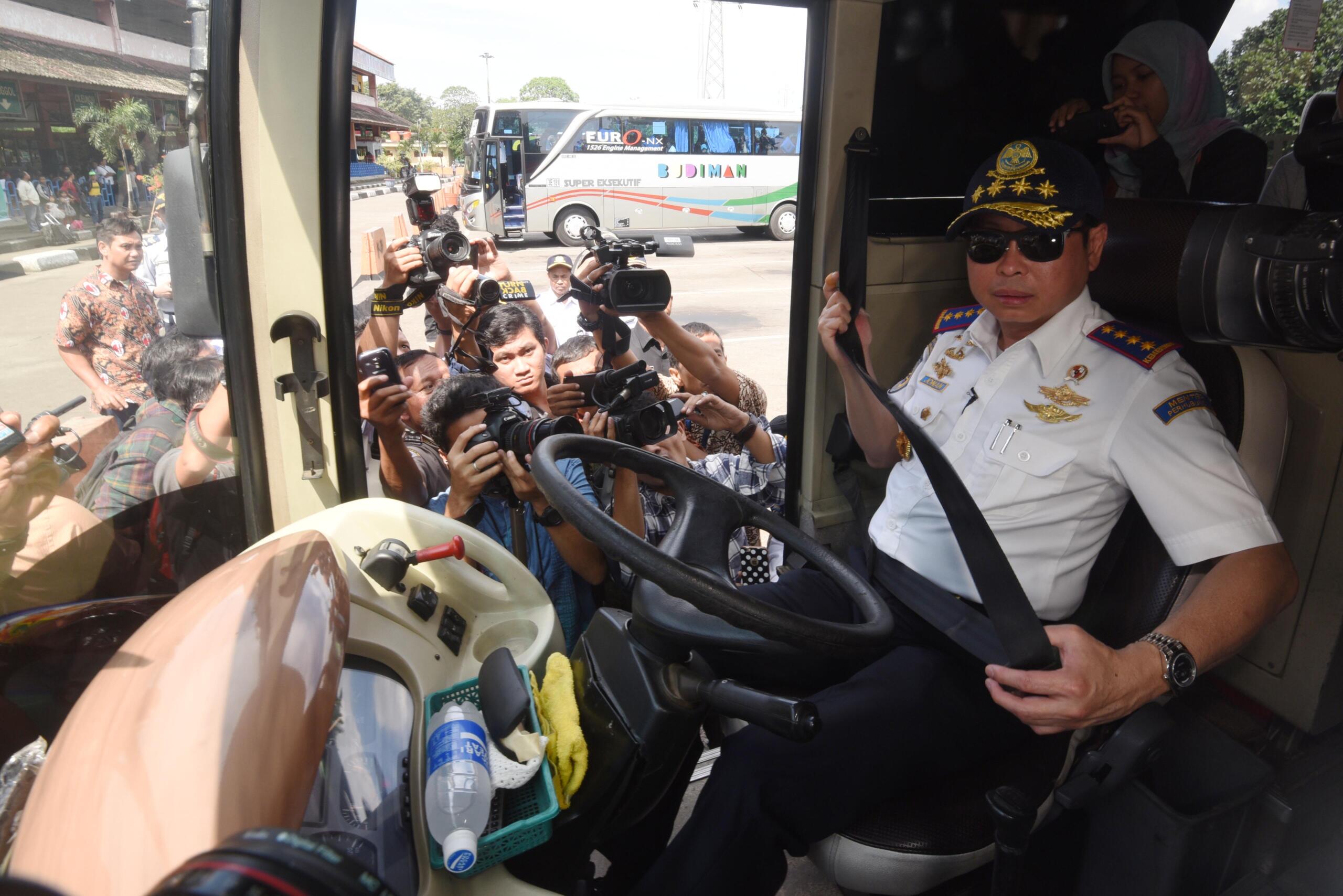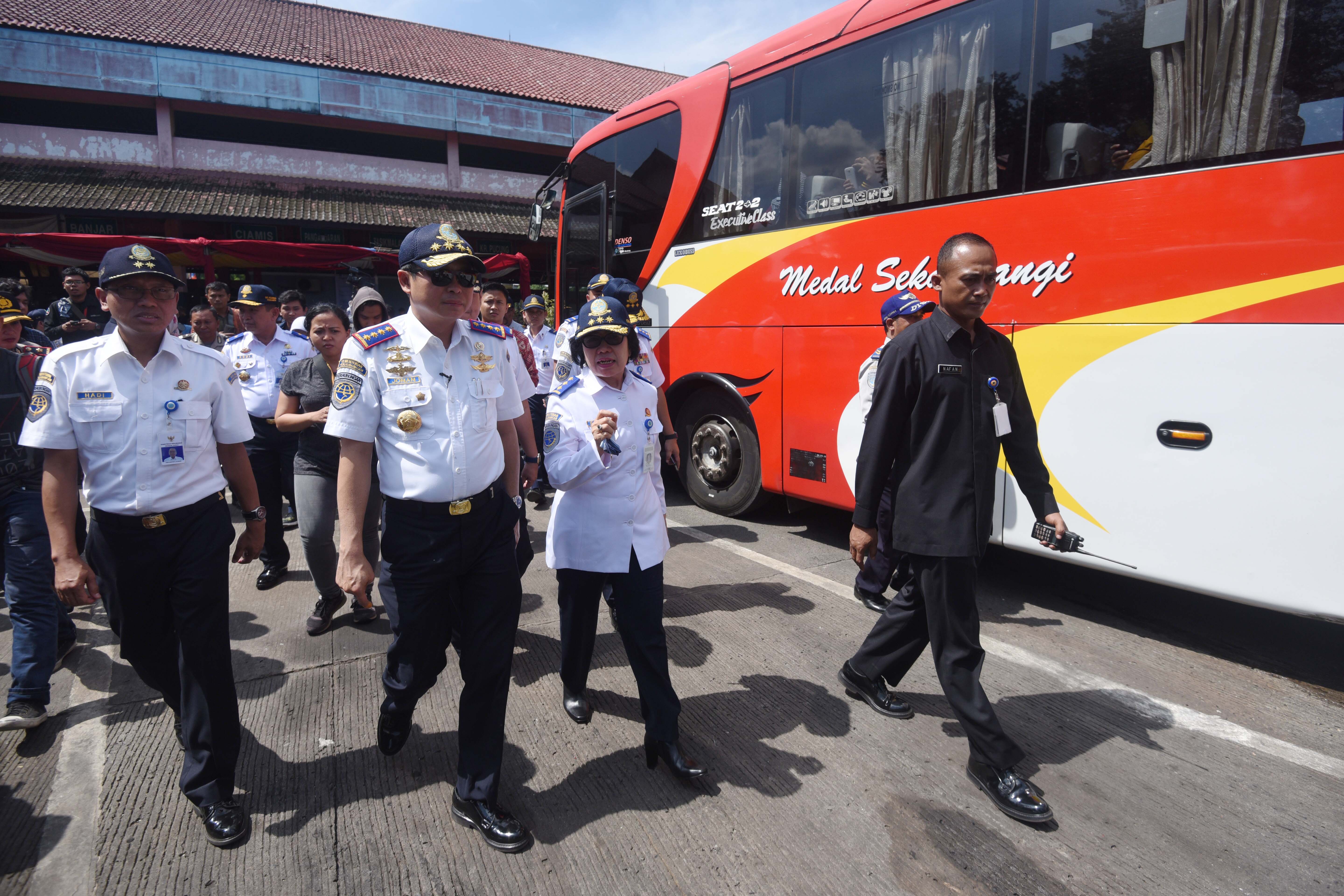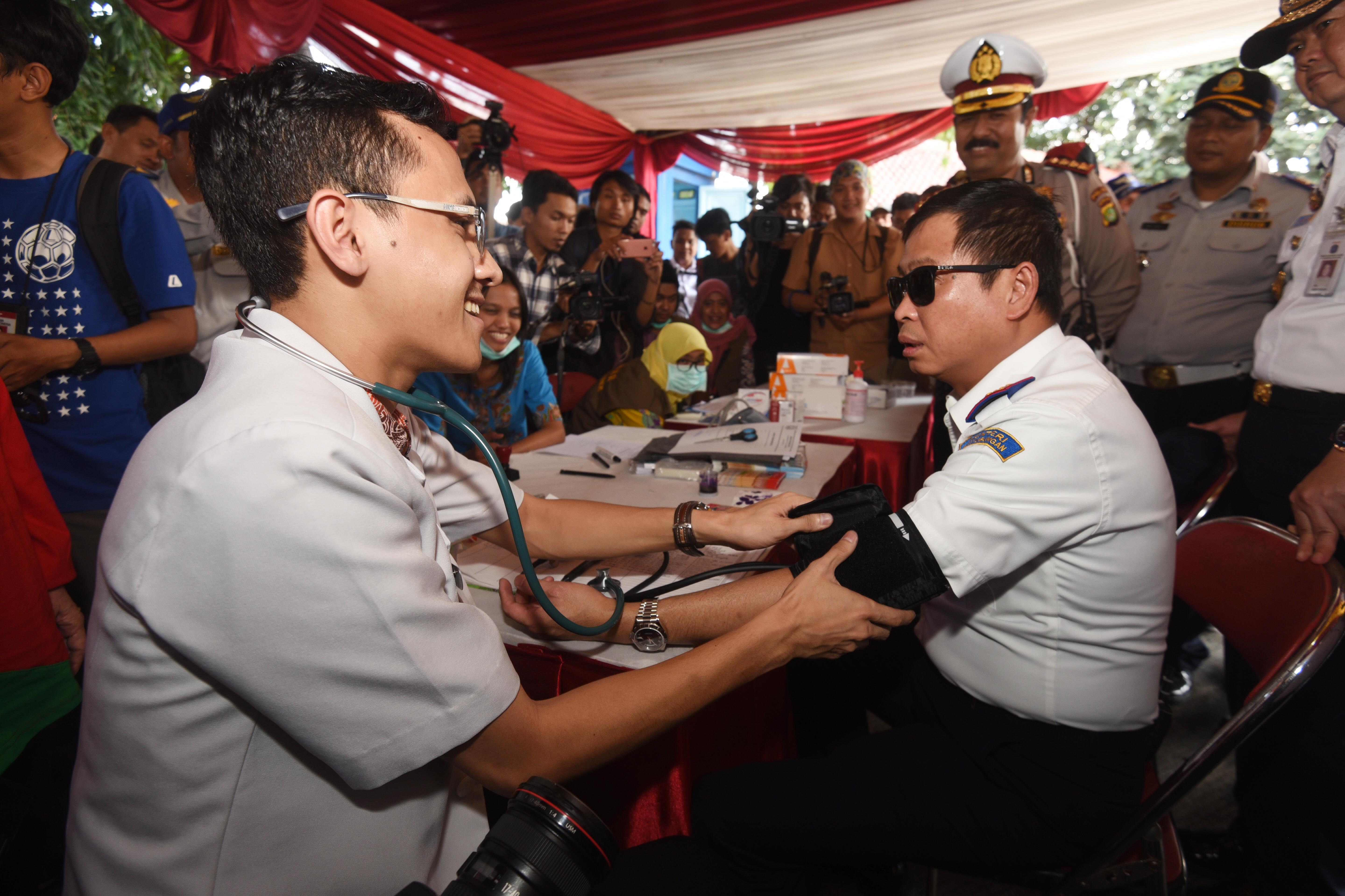 Menteri Perhubungan Ignasius Jonan diperiksa kesehatannya saat melakukan inspeksi di Terminal Kampung Rambutan, Jakarta, Jumat (24/6). Inspeksi itu bertujuan untuk mengetahui kesiapan moda transportasi jelang masa arus mudik Ramadan. ANTARA FOTO/Akbar Nugroho Gumay/pd/16