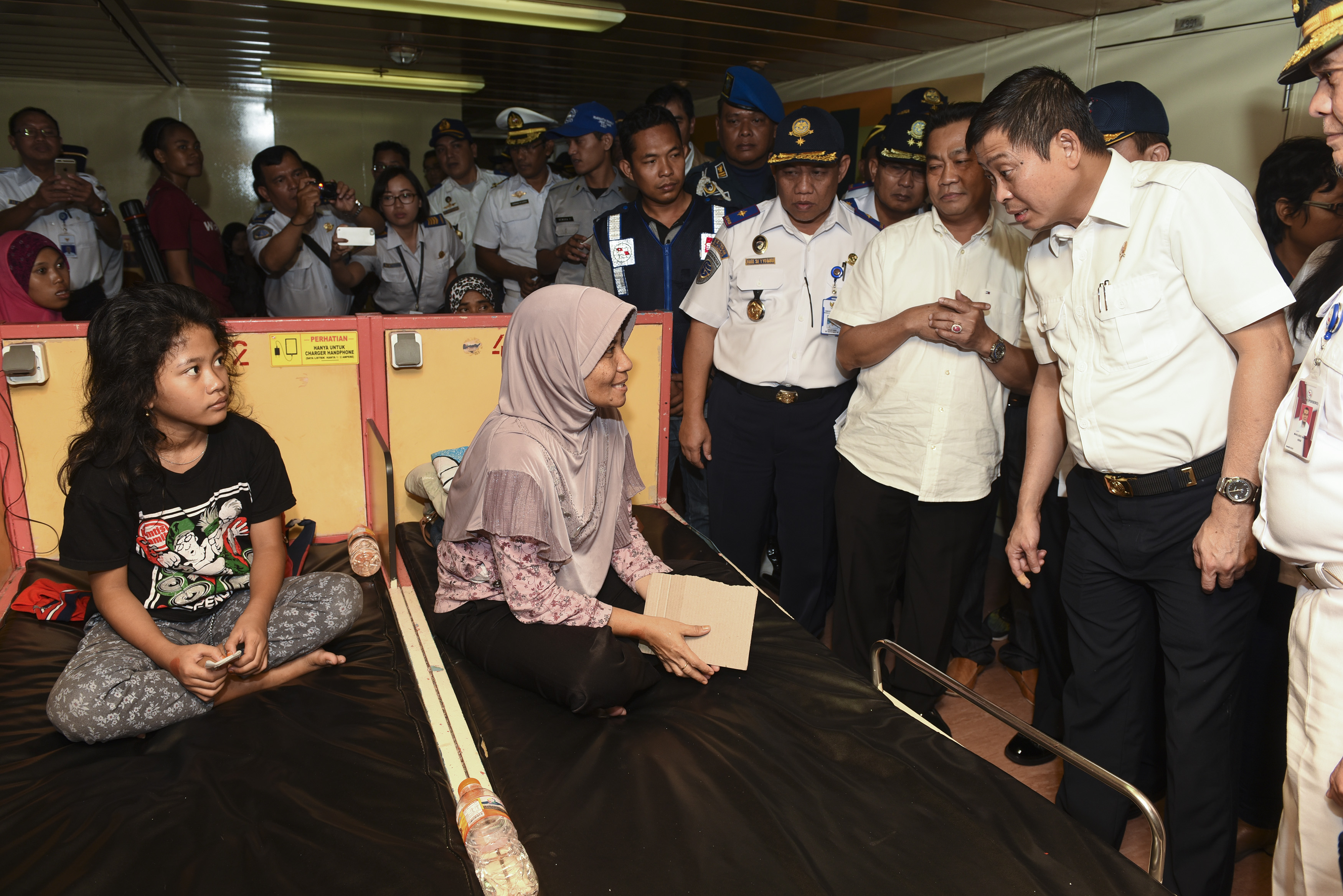 Menteri Perhubungan Ignasius Jonan (kanan) berbincang dengan penumpang kapal Pelni Sinabung yang bersandar di Dermaga Surya, Pelabuhan Tanjung Perak, Surabaya, Jawa Timur, Sabtu (25/6). Kunjungan tersebut bertujuan untuk memantau persiapan armada laut dalam rangka pelayanan arus mudik dan balik Lebaran. ANTARA FOTO/Zabur Karuru/ama/16