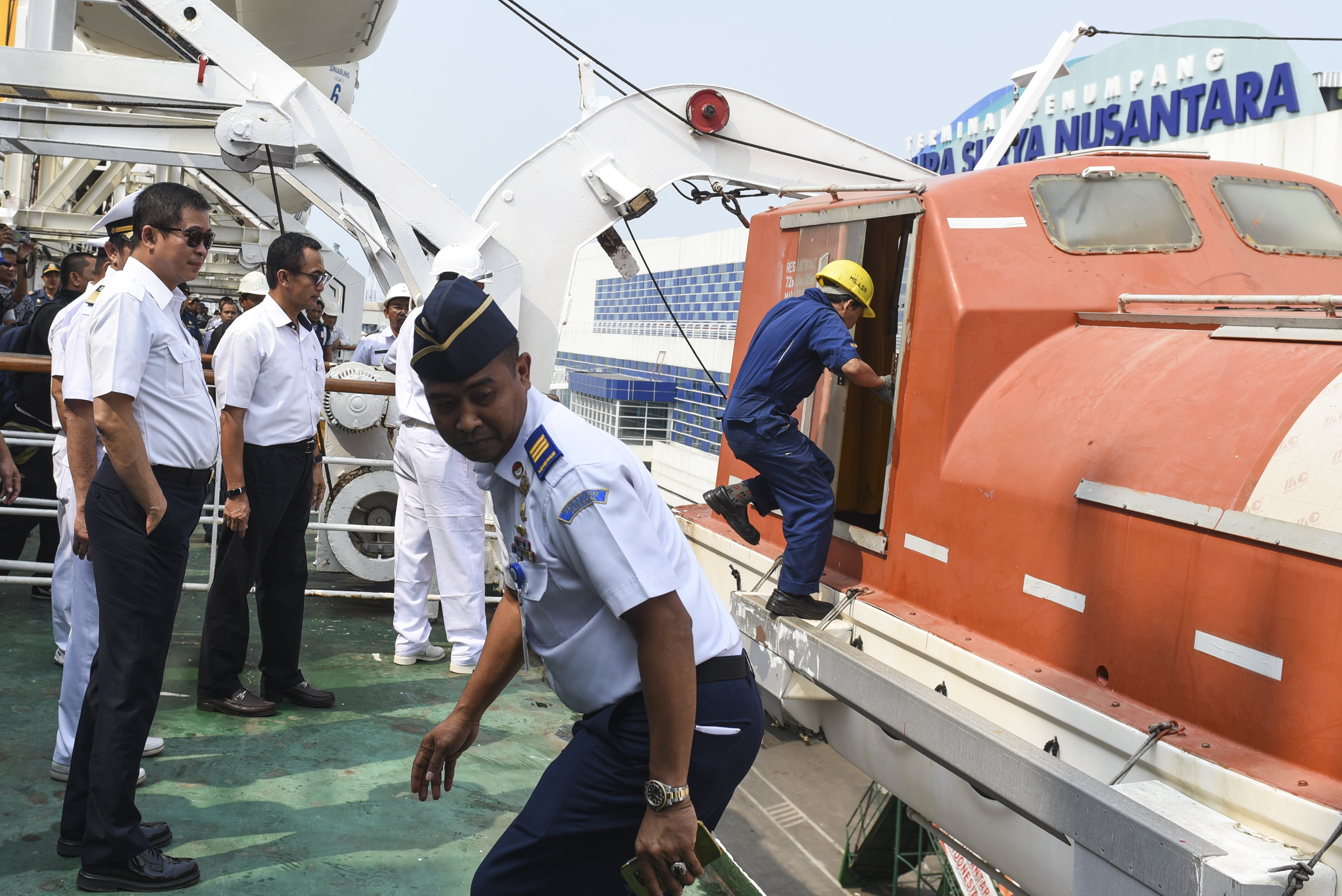 Menteri Perhubungan Ignasius Jonan (kiri) mengamati petugas sedang memeriksa kondisi sekoci kapal Pelni Sinabung yang bersandar di Dermaga Surya, Pelabuhan Tanjung Perak, Surabaya, Jawa Timur, Sabtu (25/6). Kunjungan tersebut bertujuan untuk memantau persiapan armada laut dalam rangka pelayanan arus mudik dan balik Lebaran. ANTARA FOTO/Zabur Karuru/ama/16