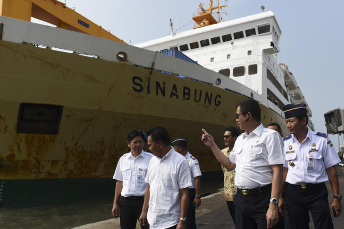 Menteri Perhubungan Ignasius Jonan (kiri) mengamati kapal Pelni Sinabung yang bersandar di Dermaga Surya, Pelabuhan Tanjung Perak, Surabaya, Jawa Timur, Sabtu (25/6). Kunjungan tersebut bertujuan untuk memantau persiapan armada laut dalam rangka pelayanan arus mudik dan balik Lebaran. ANTARA FOTO/Zabur Karuru/ama/16