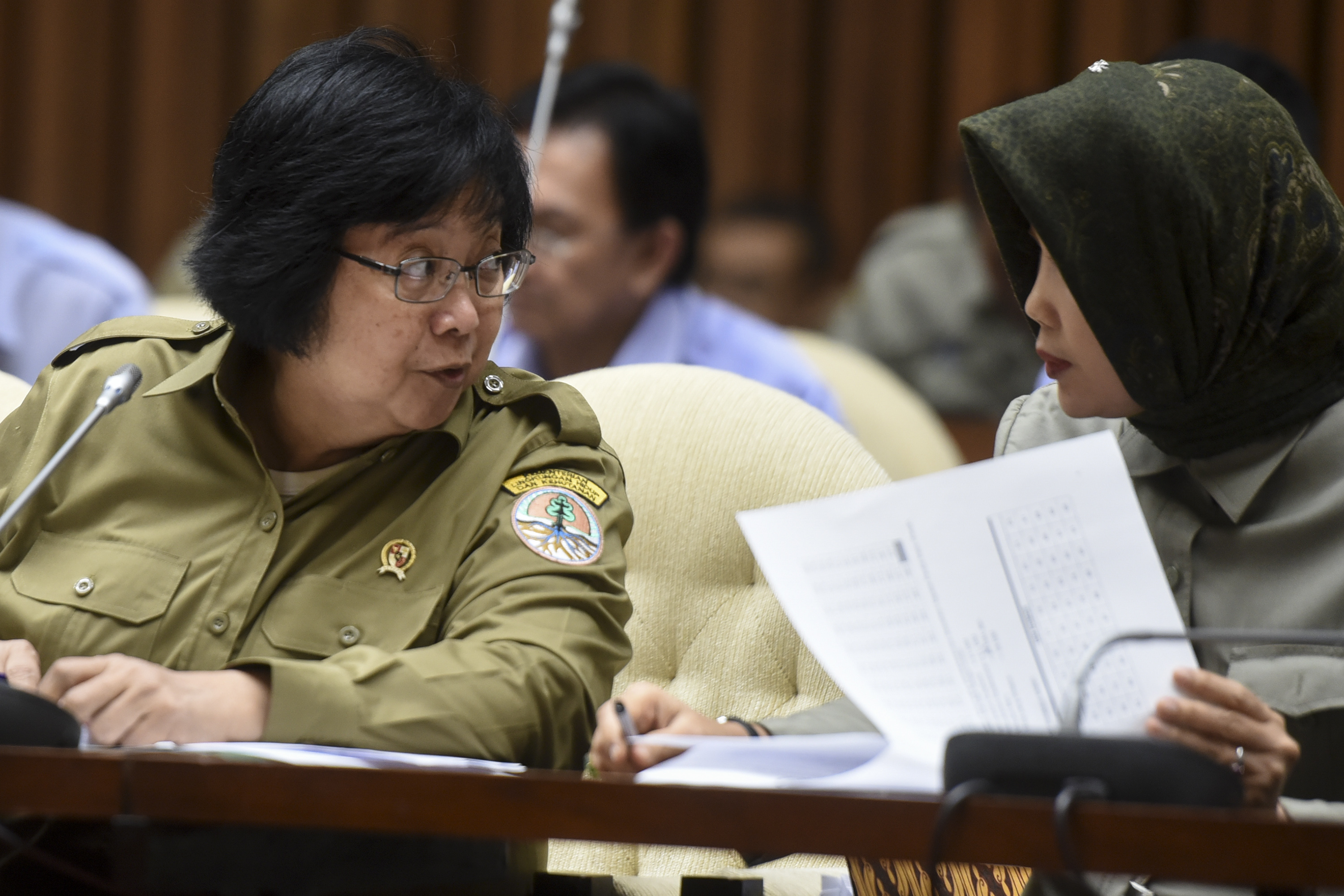 Menteri Kehutanan dan Lingkungan Hidup Siti Nurbaya (kiri) mengikuti rapat kerja dengan Komisi IV DPR di Kompleks Parlemen, Senayan, Jakarta, Senin (27/6). Rapat tersebut membahas daftar inventaris masalah serta pembentukan panitia kerja (panja) RUU tentang Karantina Hewan, Ikan dan Tumbuhan. ANTARA FOTO/Hafidz Mubarak A./pd/16