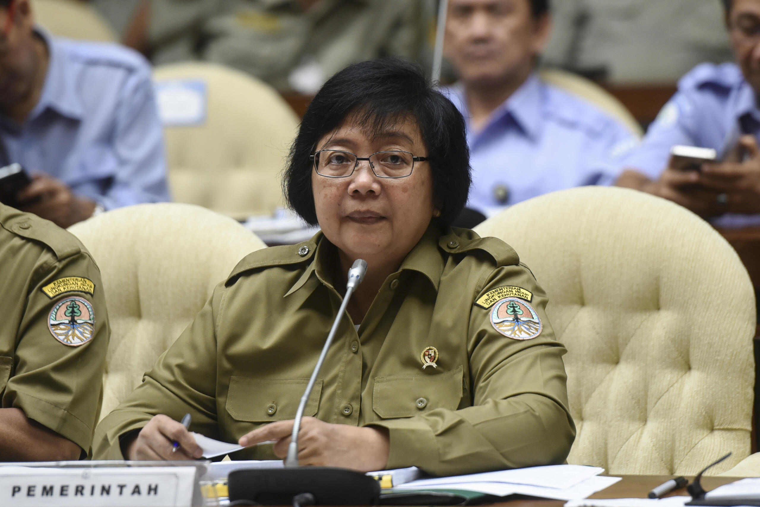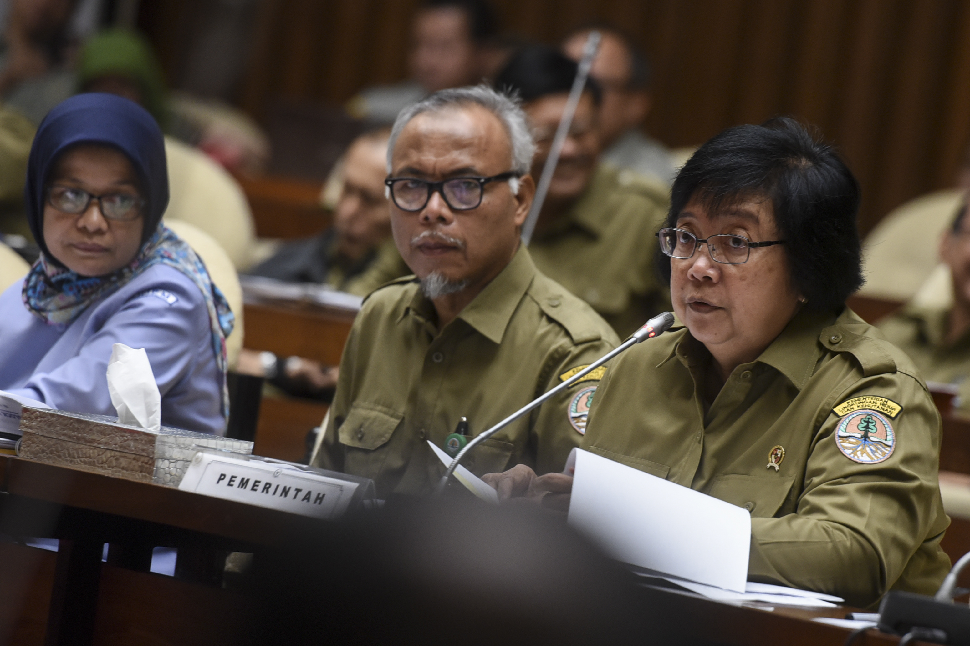 Menteri Kehutanan dan Lingkungan Hidup Siti Nurbaya mengikuti rapat kerja dengan Komisi IV DPR di Kompleks Parlemen, Senayan, Jakarta, Senin (27/6). Rapat tersebut membahas daftar inventaris masalah serta pembentukan panitia kerja (panja) RUU tentang Karantina Hewan, Ikan dan Tumbuhan. ANTARA FOTO/Hafidz Mubarak A./pd/16