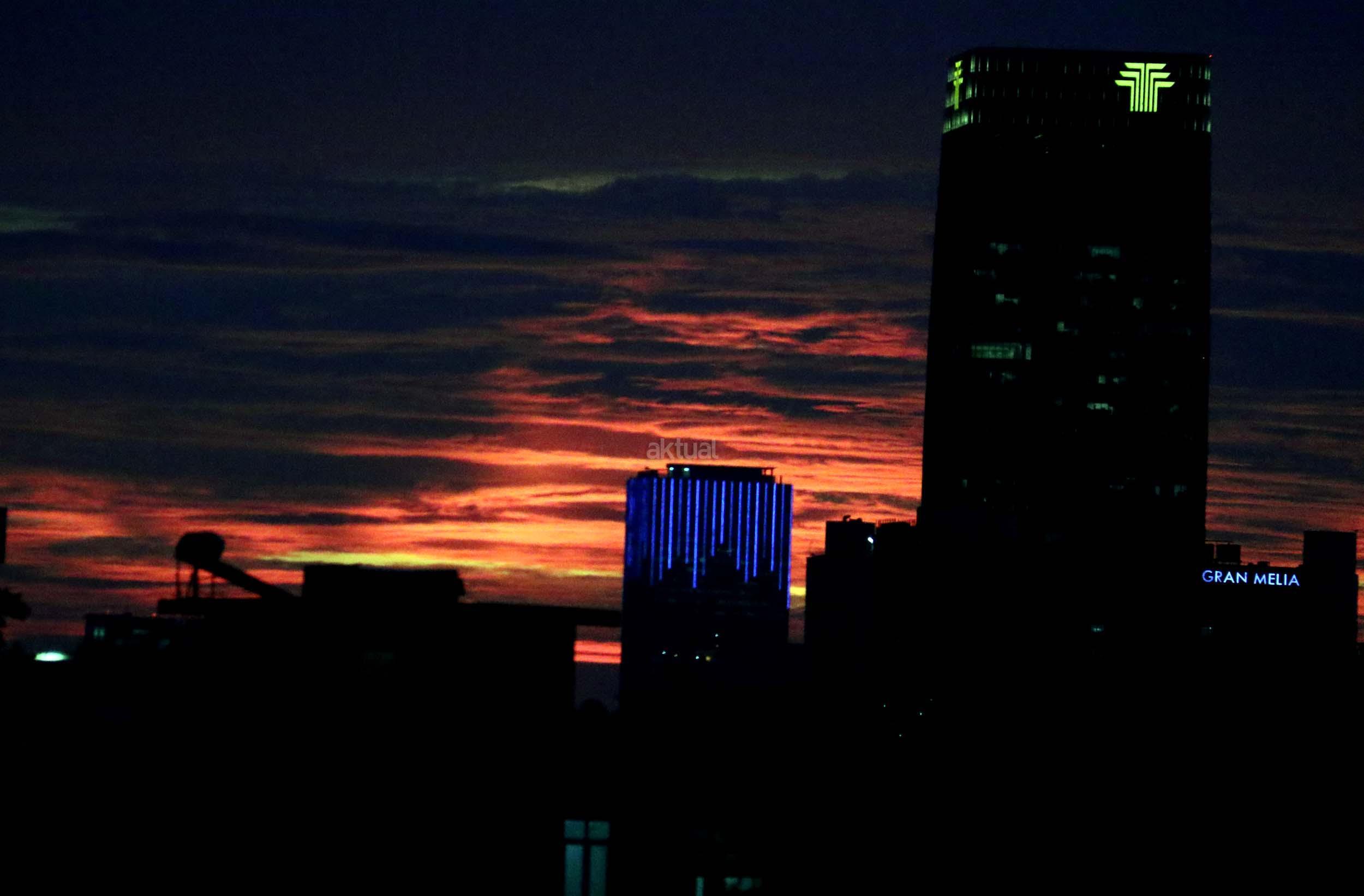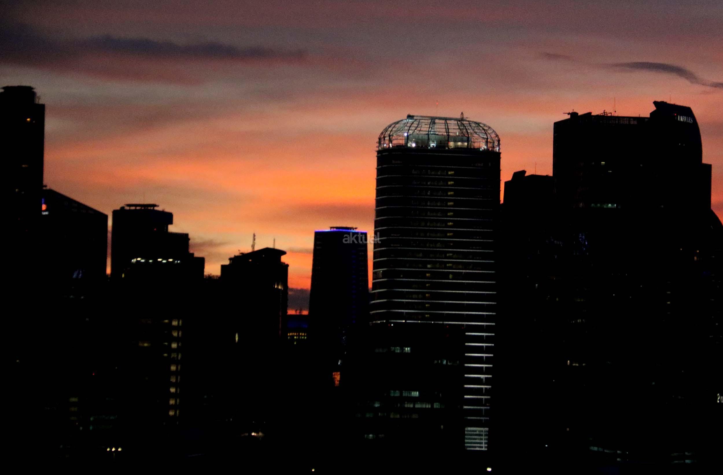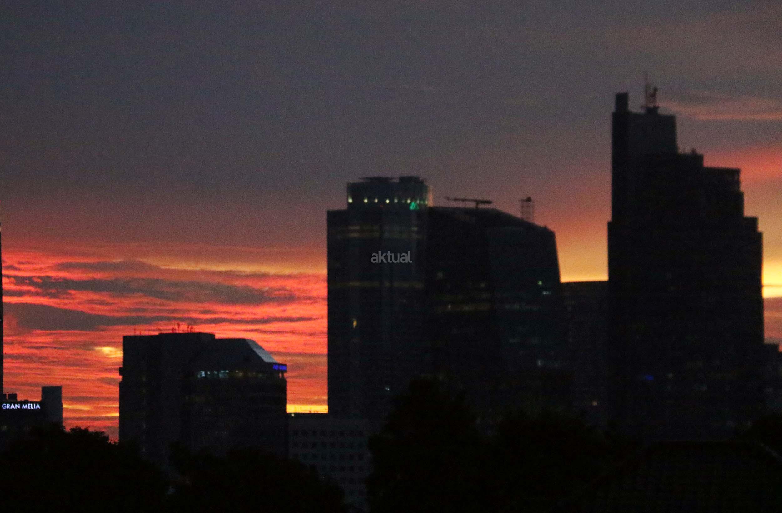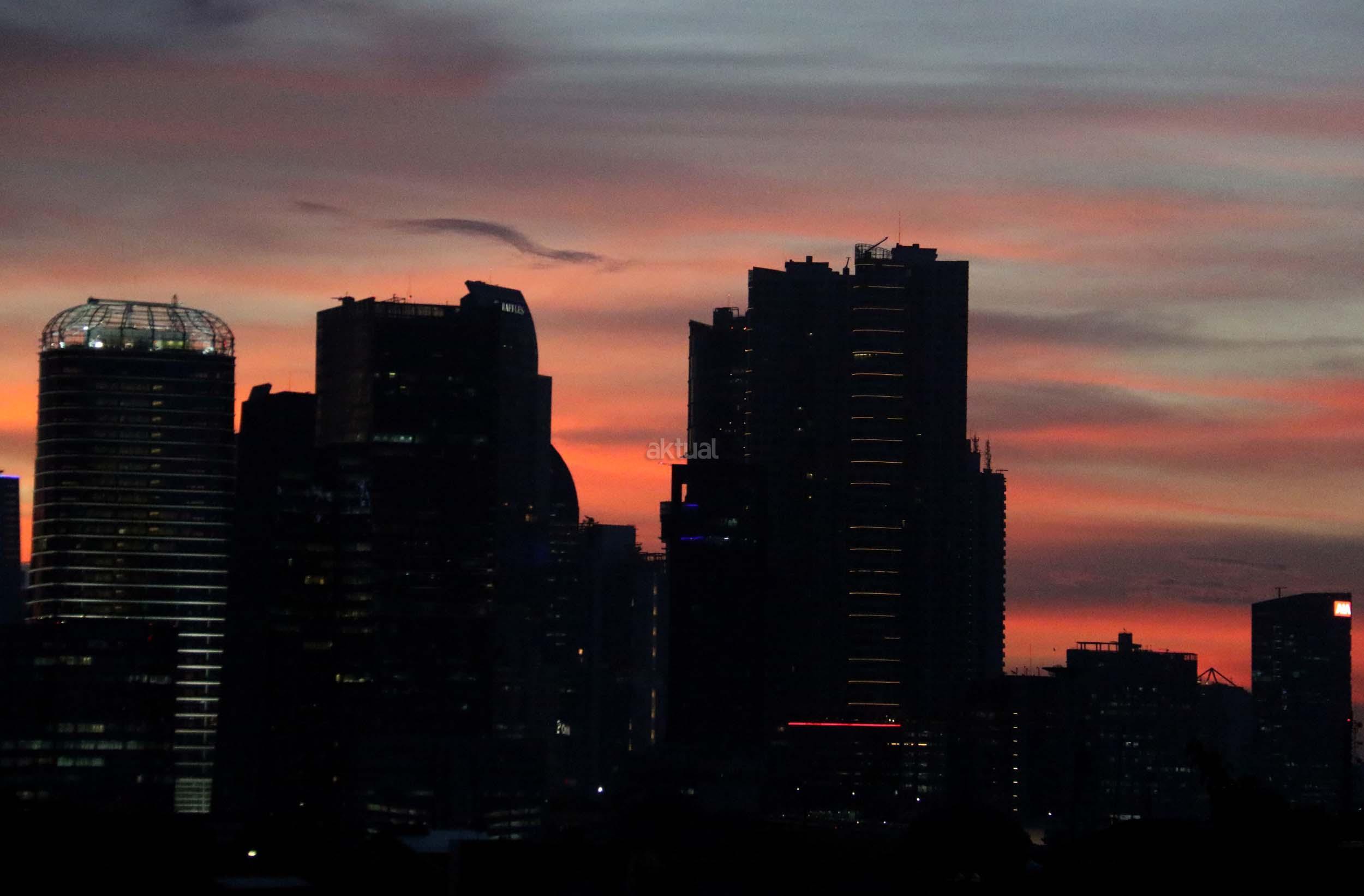 Suasana indahnya matahari tenggelam diantara gedung-gedung pencakar langit menghiasi langit Jakarta seperti yang terlihat di atas salah satu gedung di Jakarta, Jumat (20/1/2017). Matahari tenggelam jarang sekali terlihat di langit kota Jakarta yang setiap harinya selalu diselimuti oleh langit yang pekat dari asap polusi. AKTUAL/Munzir