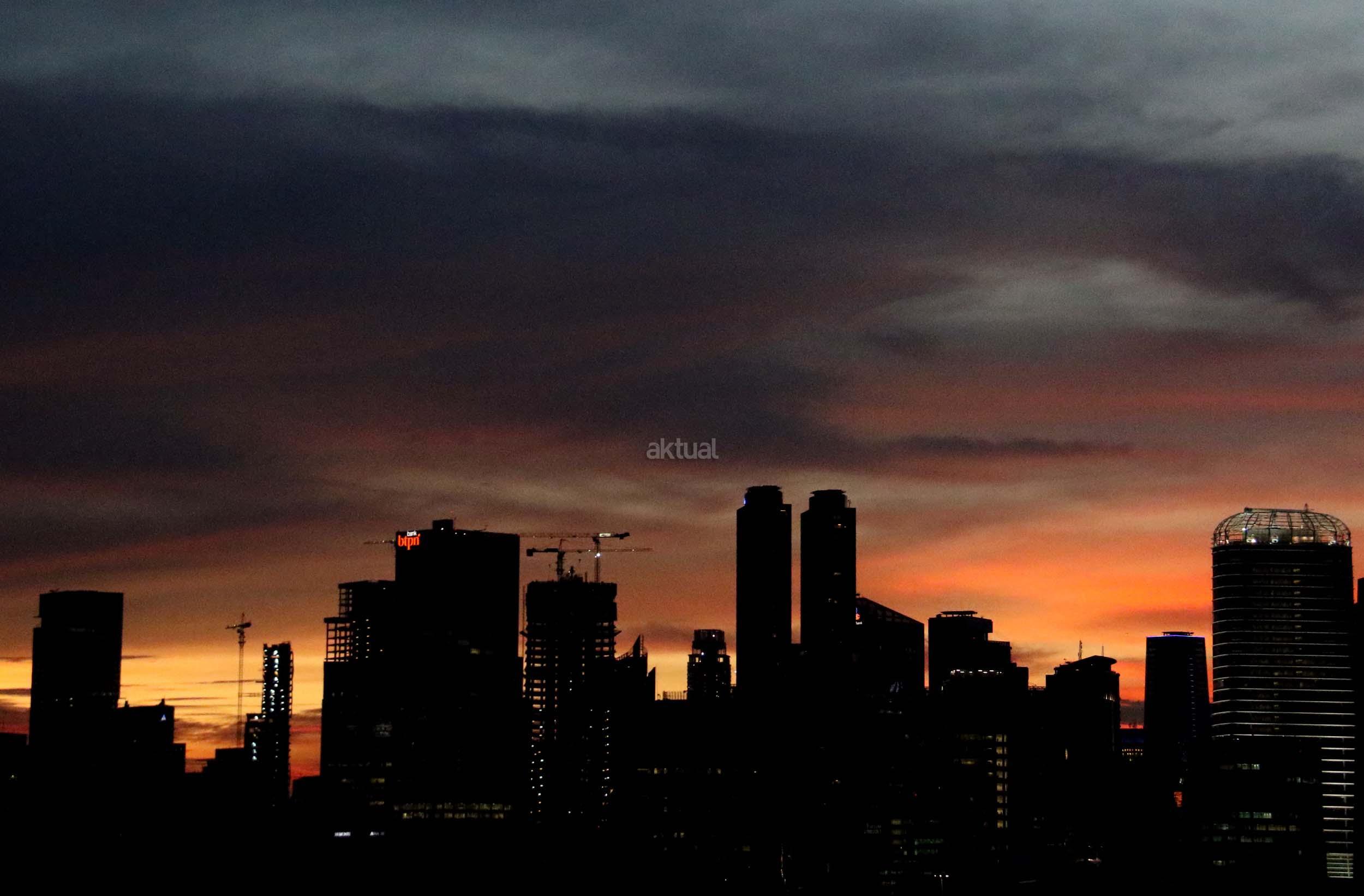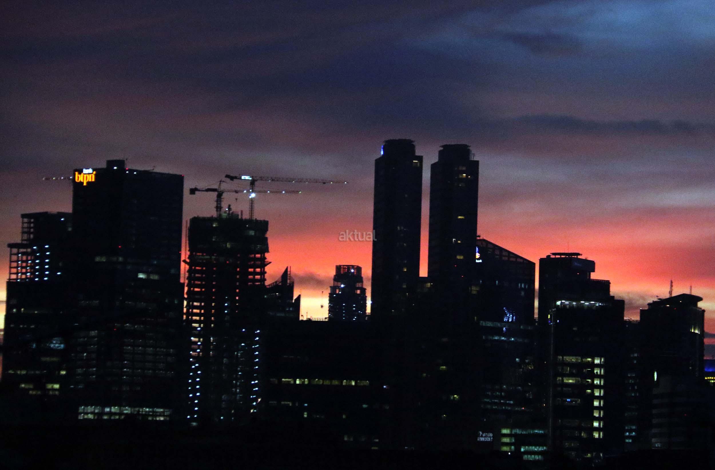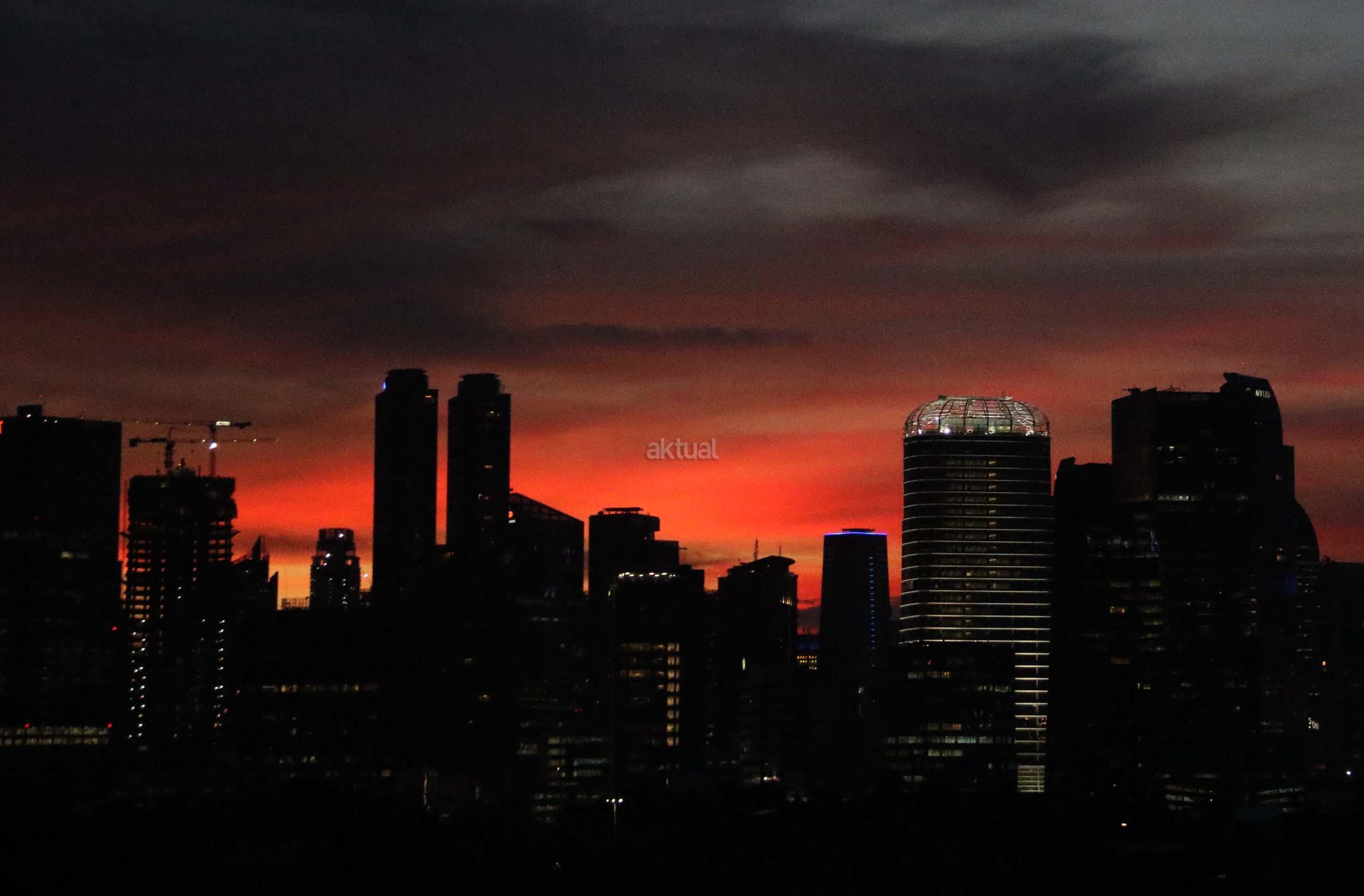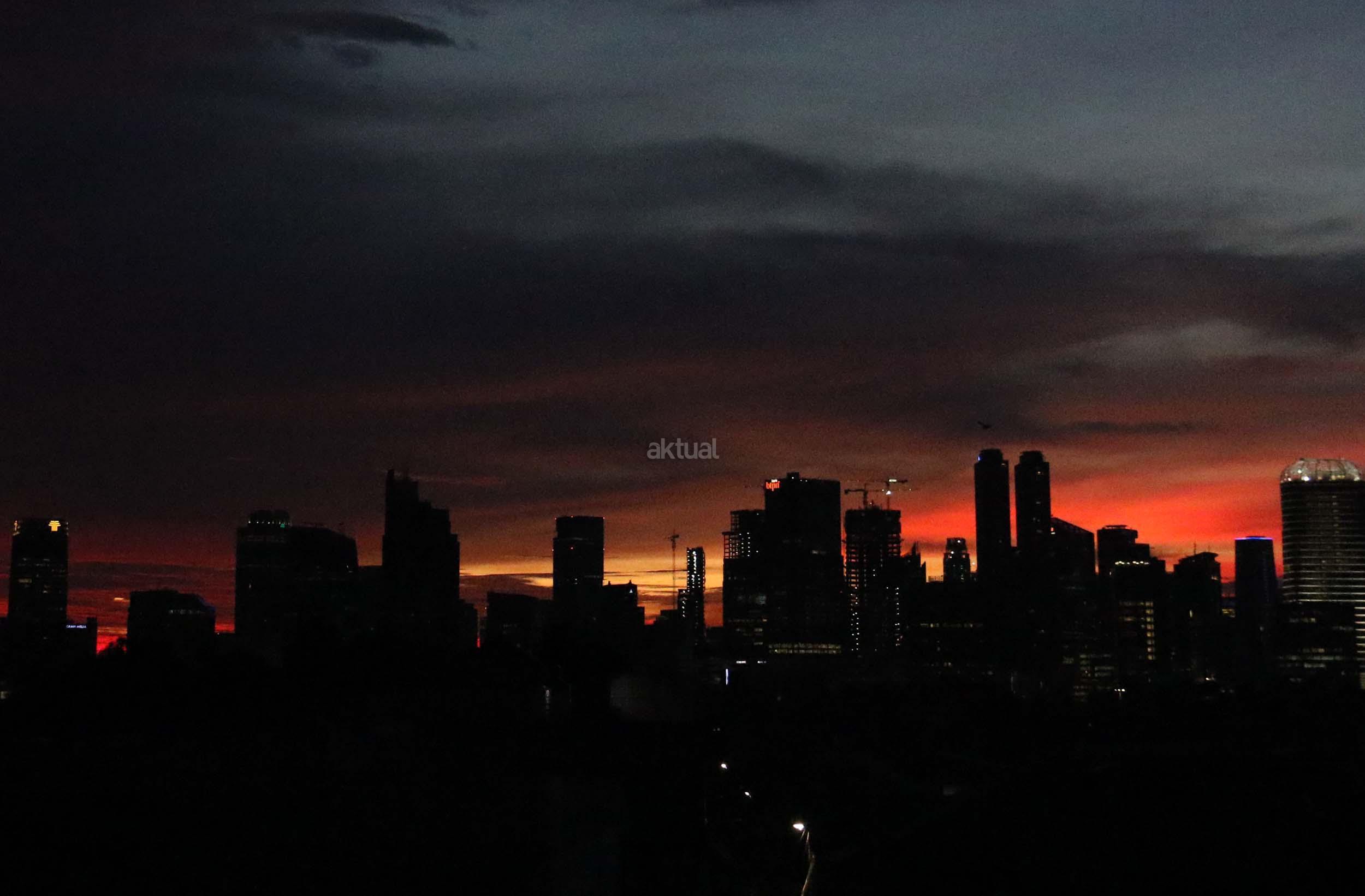 Suasana indahnya matahari tenggelam diantara gedung-gedung pencakar langit menghiasi langit Jakarta seperti yang terlihat di atas salah satu gedung di Jakarta, Jumat (20/1/2017). Matahari tenggelam jarang sekali terlihat di langit kota Jakarta yang setiap harinya selalu diselimuti oleh langit yang pekat dari asap polusi. AKTUAL/Munzir