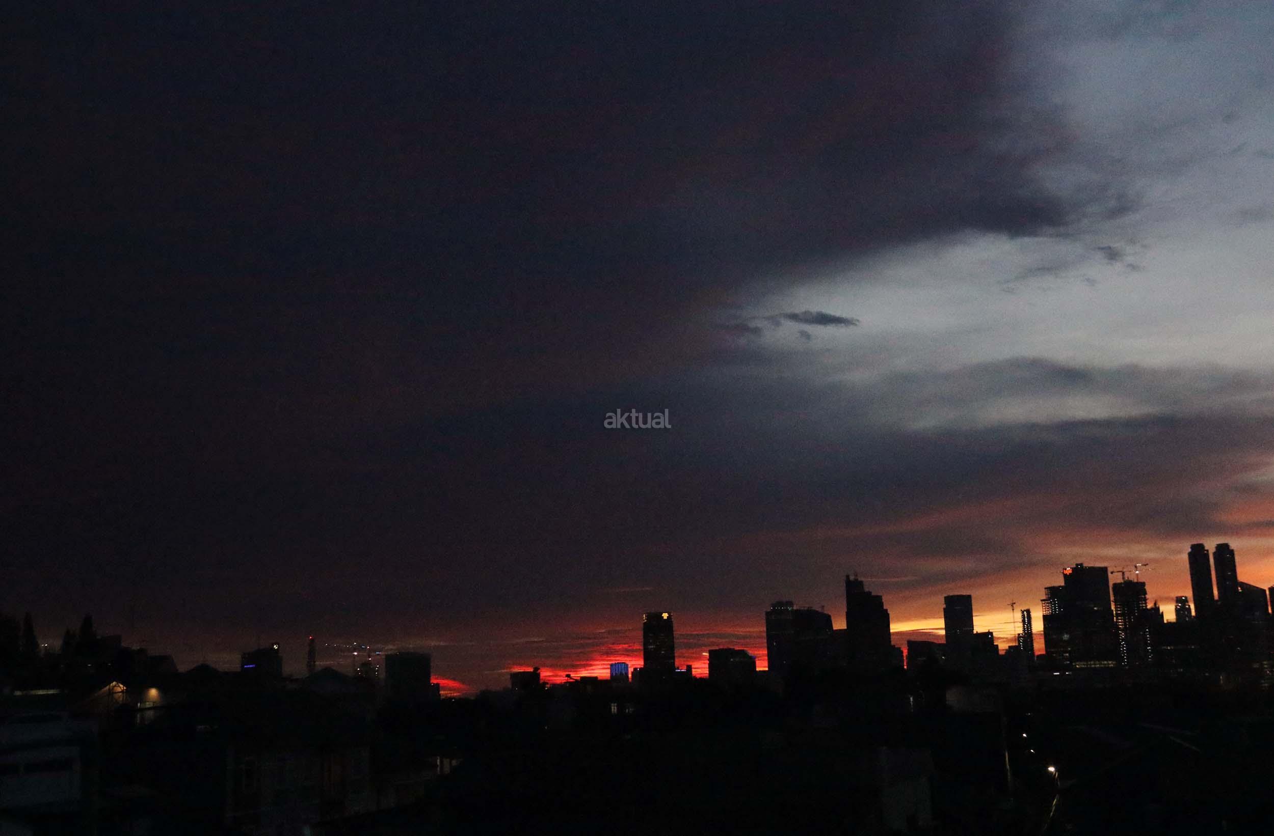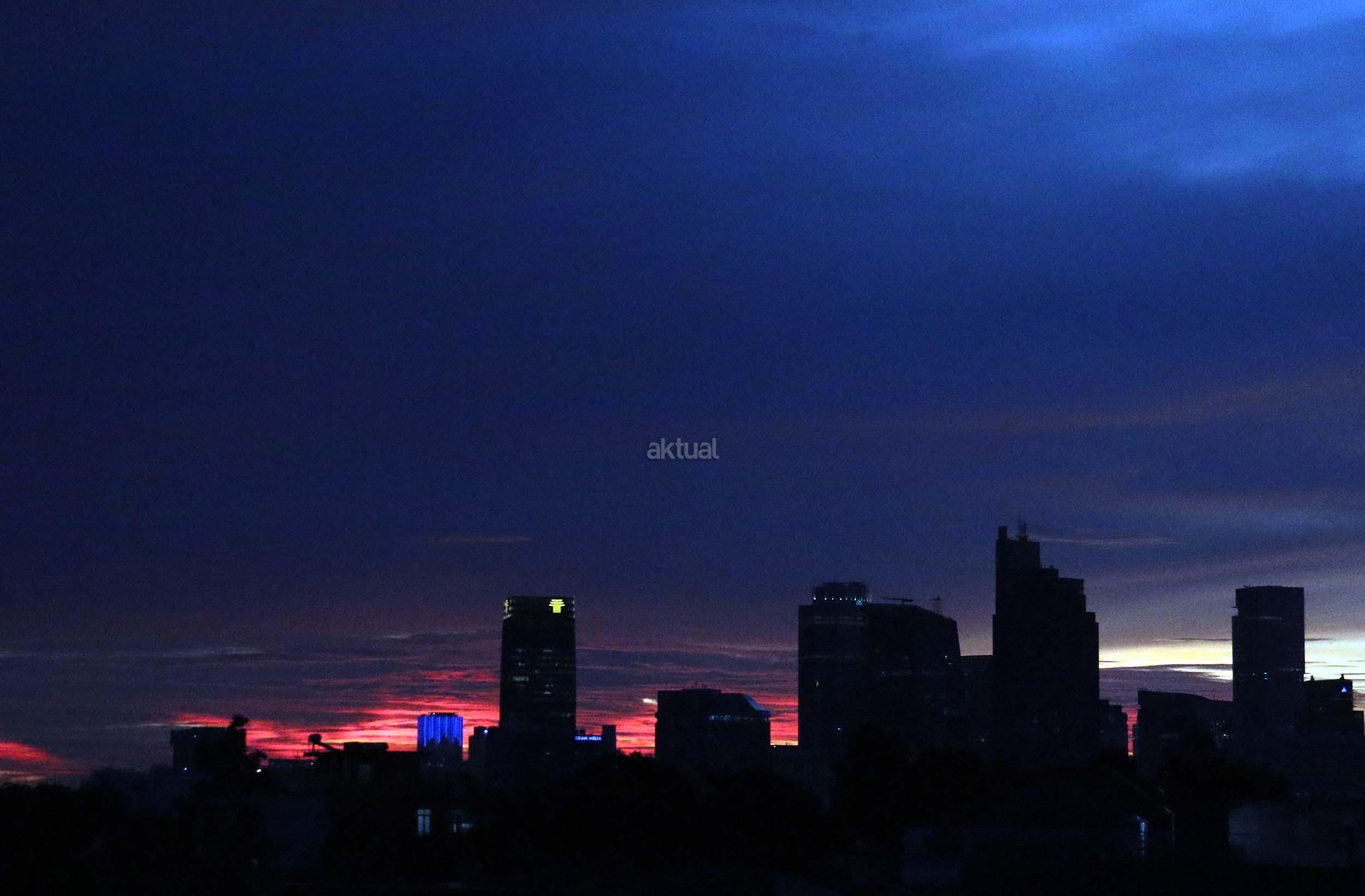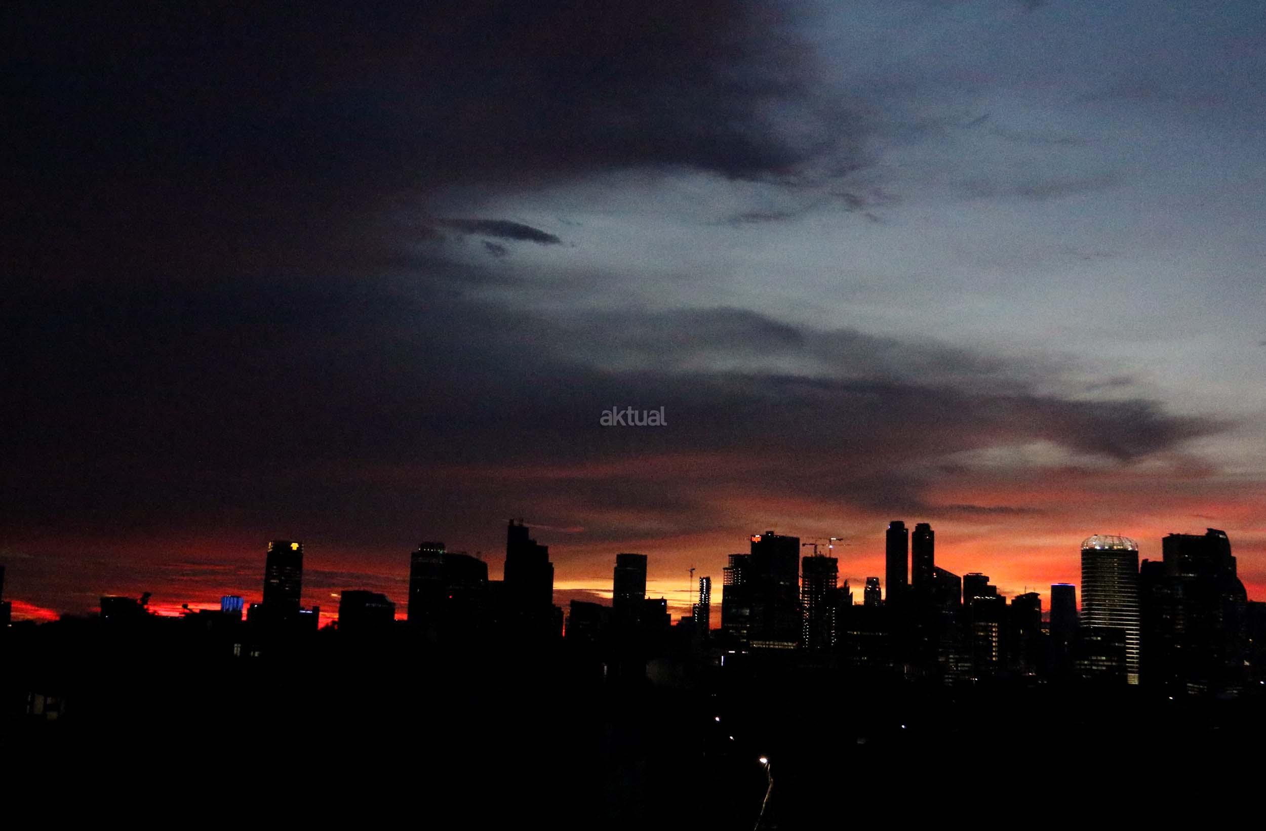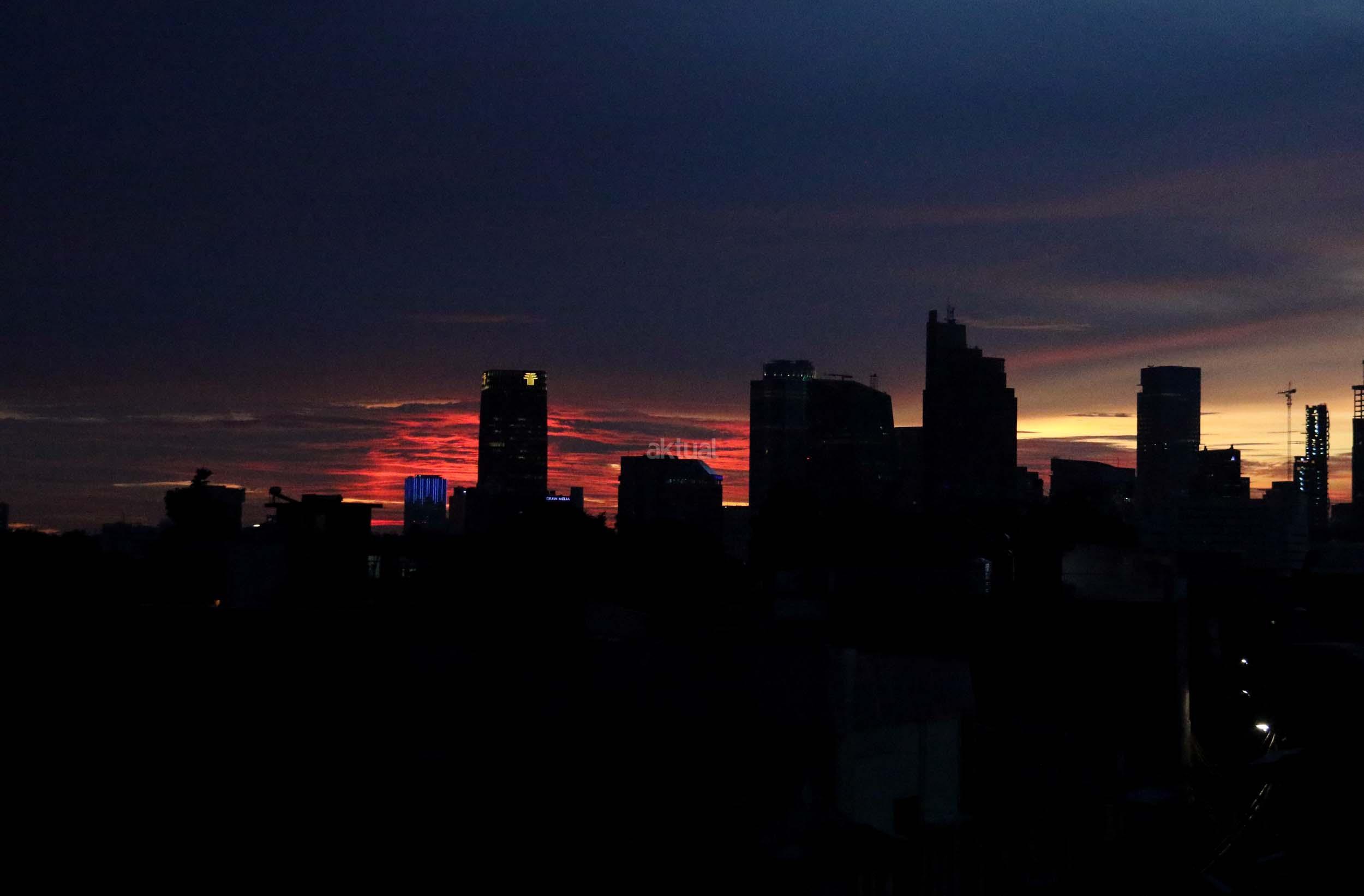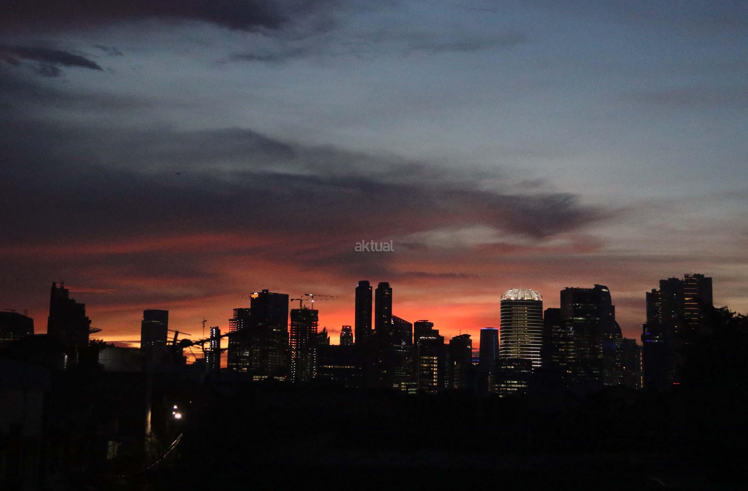 Suasana indahnya matahari tenggelam diantara gedung-gedung pencakar langit menghiasi langit Jakarta seperti yang terlihat di atas salah satu gedung di Jakarta, Jumat (20/1/2017). Matahari tenggelam jarang sekali terlihat di langit kota Jakarta yang setiap harinya selalu diselimuti oleh langit yang pekat dari asap polusi. AKTUAL/Munzir