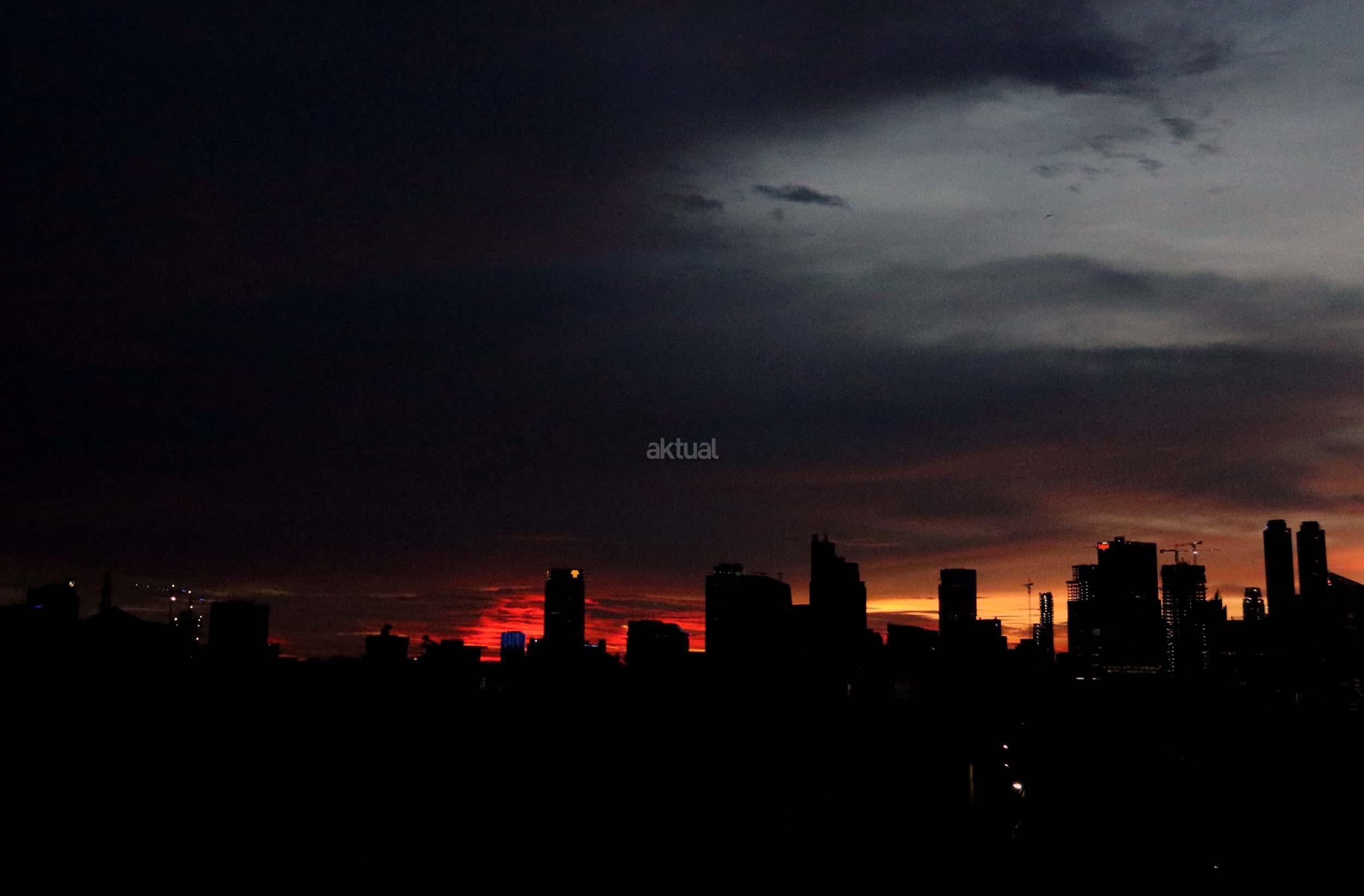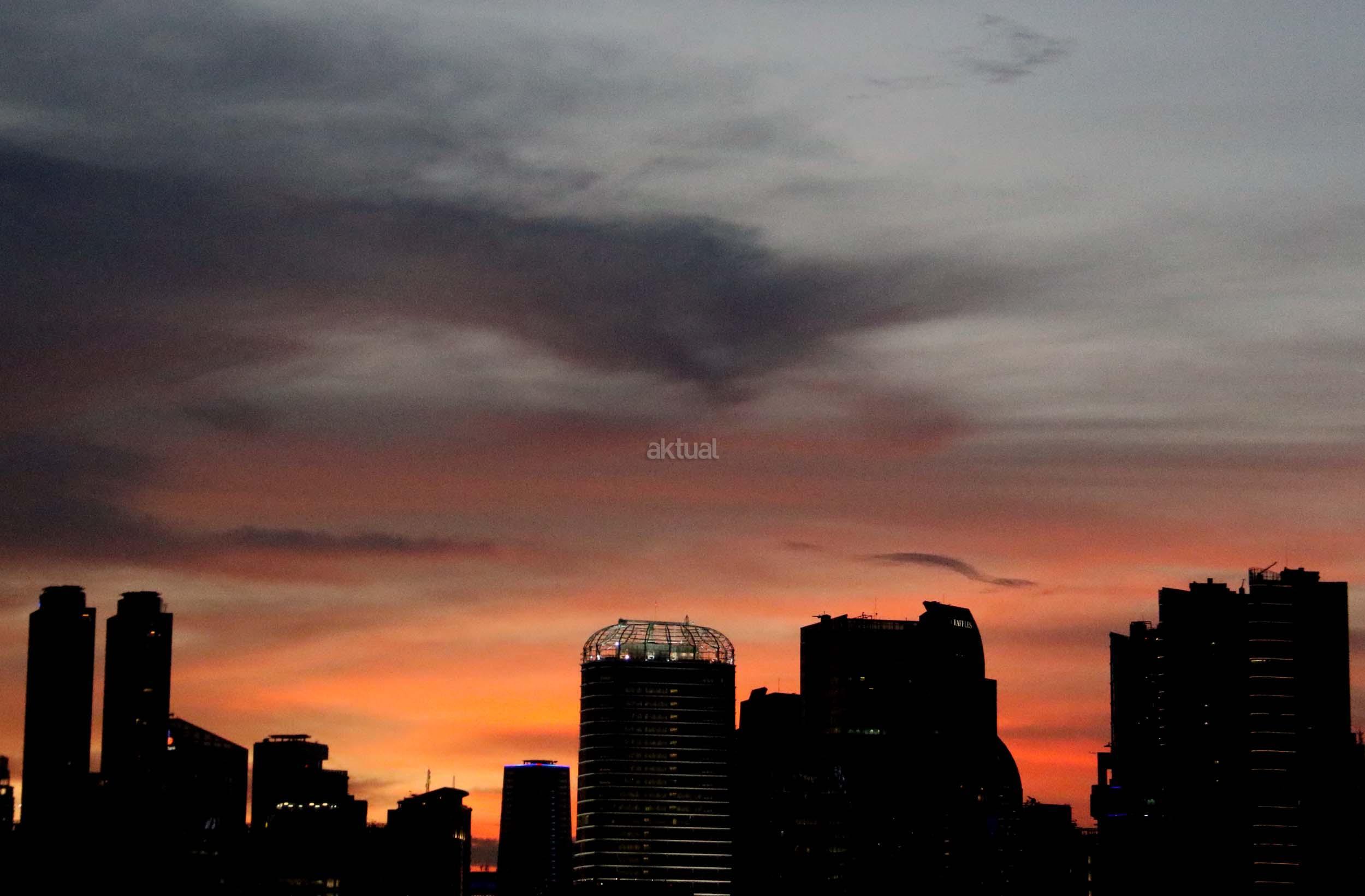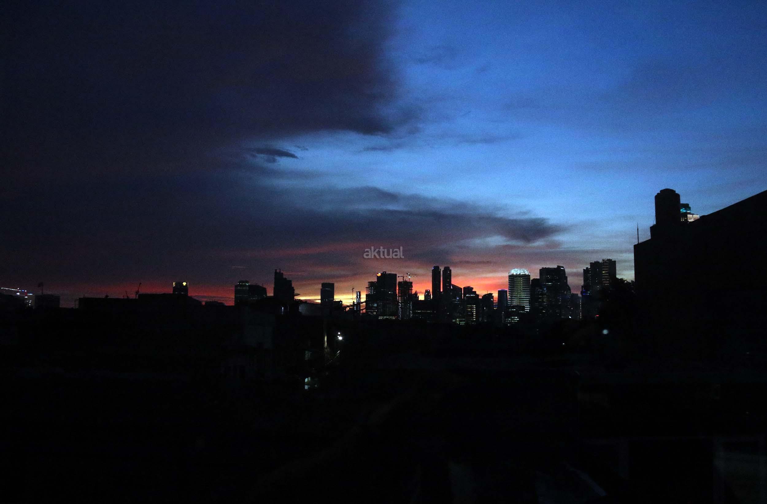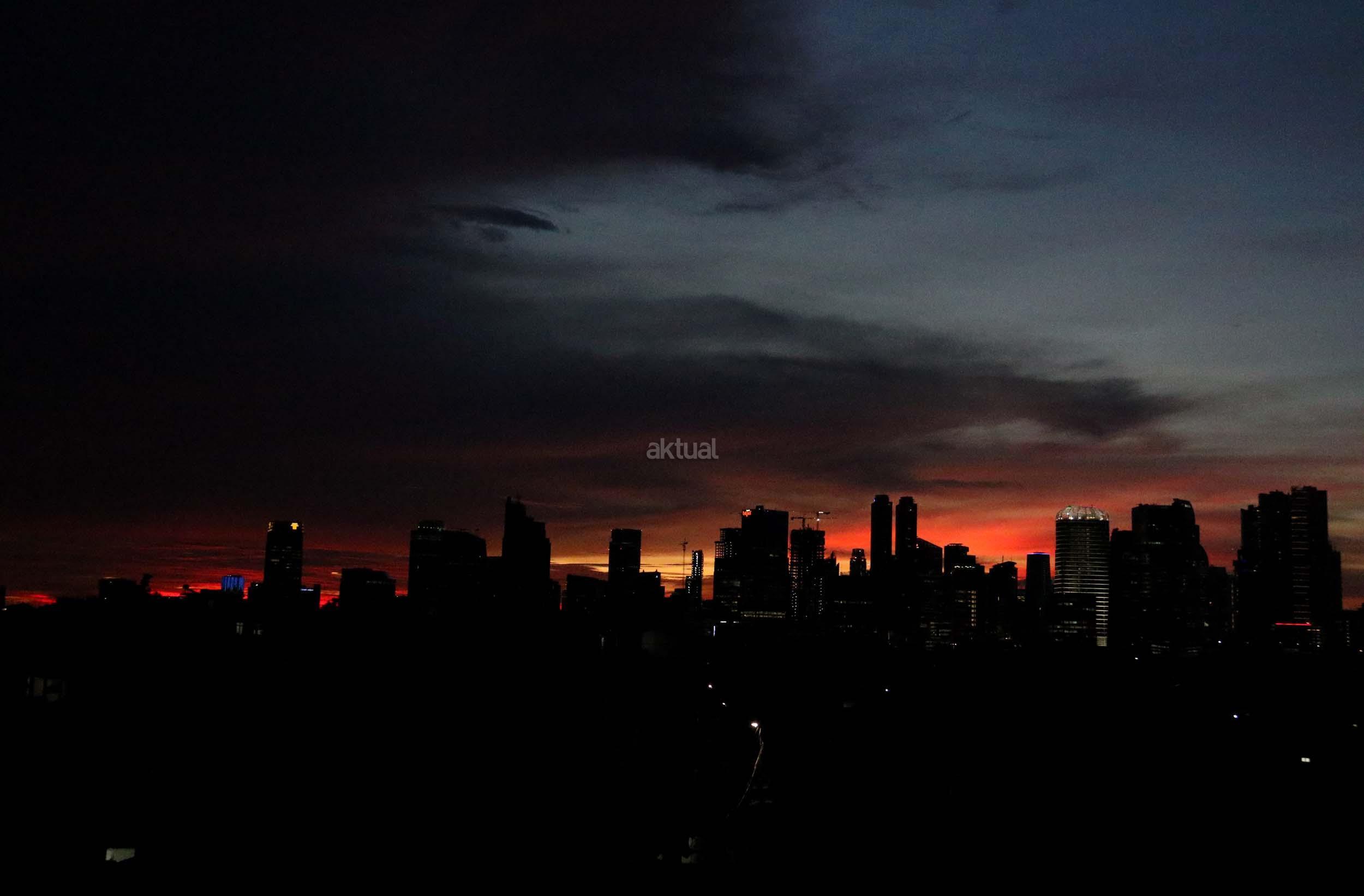 Suasana indahnya matahari tenggelam diantara gedung-gedung pencakar langit menghiasi langit Jakarta seperti yang terlihat di atas salah satu gedung di Jakarta, Jumat (20/1/2017). Matahari tenggelam jarang sekali terlihat di langit kota Jakarta yang setiap harinya selalu diselimuti oleh langit yang pekat dari asap polusi. AKTUAL/Munzir