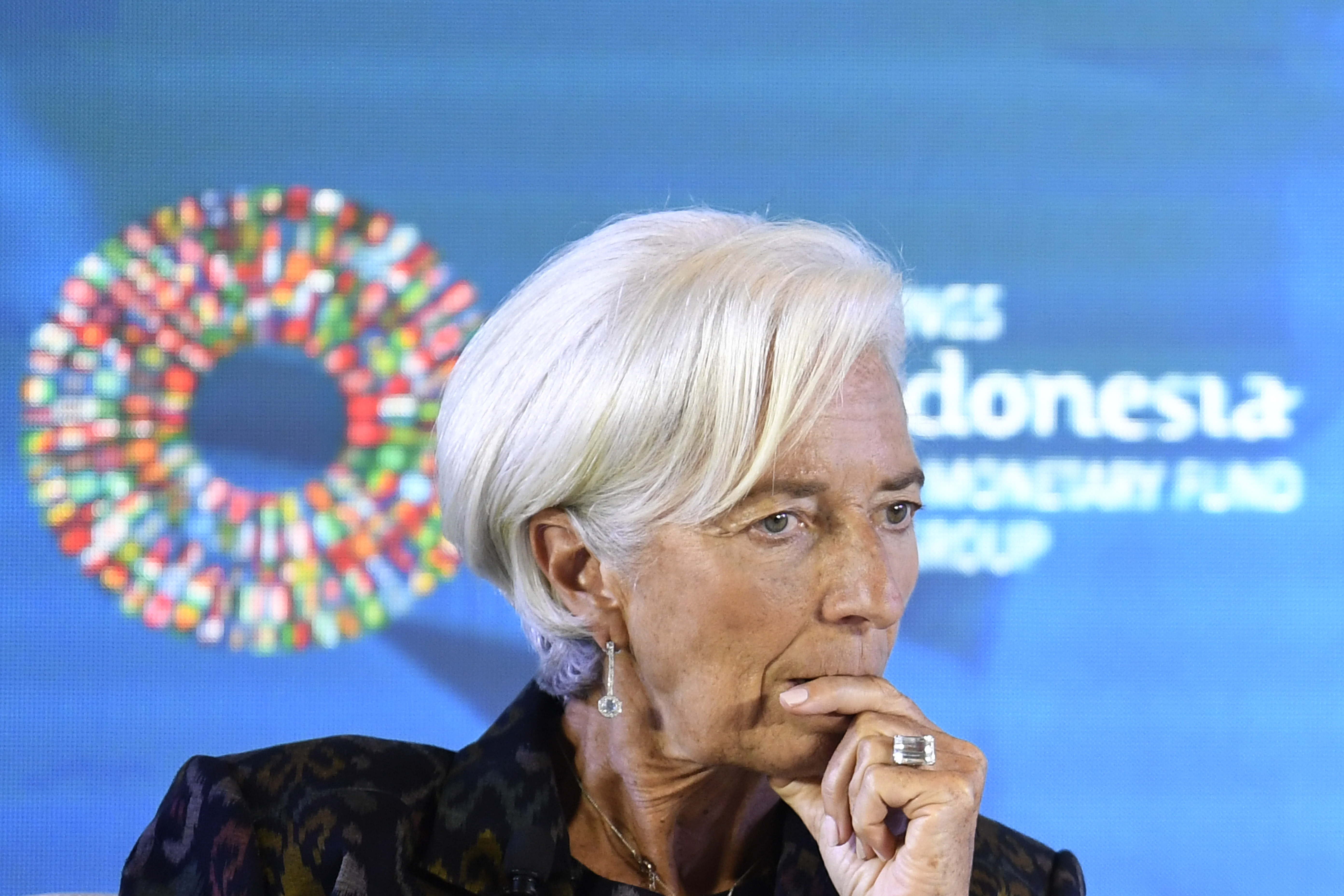 Direktur Pelaksana International Monetary Fund (IMF) Christine Lagarde menyimak diskusi Pemberdayaan Wanita di Dunia Kerja pada rangkaian Pertemuan Tahunan IMF World Bank Group 2018 di Bali International Convention Center (BICC), Nusa Dua, Bali, Selasa (9/10). Seminar tersebut membahas kebijakan untuk meningkatkan partisipasi wanita dalam dunia kerja dan penguasaan teknologi. ICom/AM IMF-WBG/Puspa Perwitasari/hp/2018