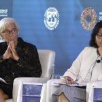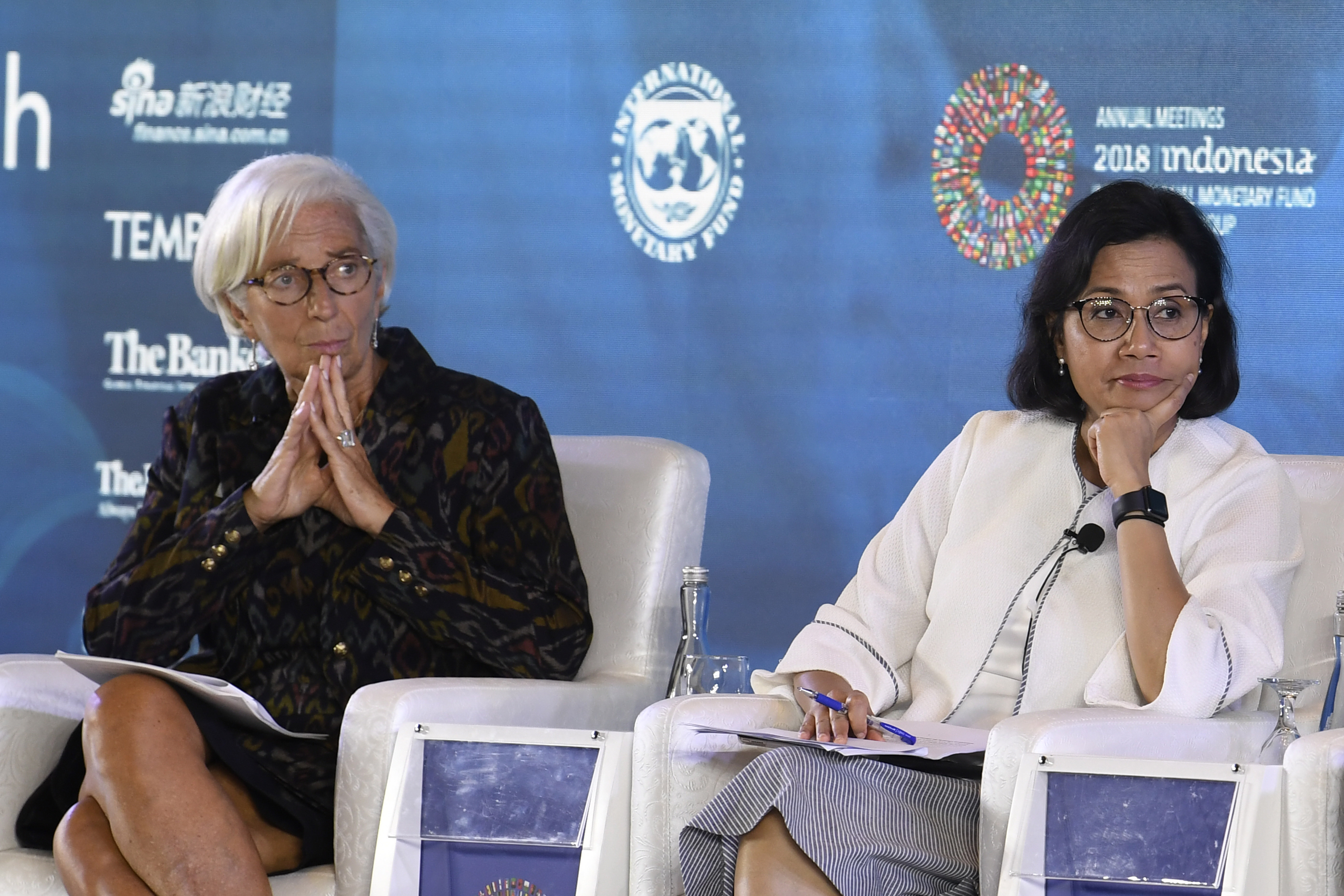 Menteri Keuangan Sri Mulyani (kanan) bersama Direktur Pelaksana International Monetary Fund (IMF) Christine Lagarde (kiri) menghadiri seminar Pemberdayaan Wanita di Dunia Kerja pada rangkaian Pertemuan Tahunan IMF World Bank Group 2018 di Bali International Convention Center (BICC), Nusa Dua, Bali, Selasa (9/10). Seminar tersebut membahas kebijakan untuk meningkatkan partisipasi wanita dalam dunia kerja dan penguasaan teknologi. ICom/AM IMF-WBG/Puspa Perwitasari/hp/2018
