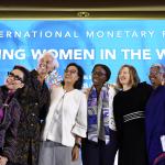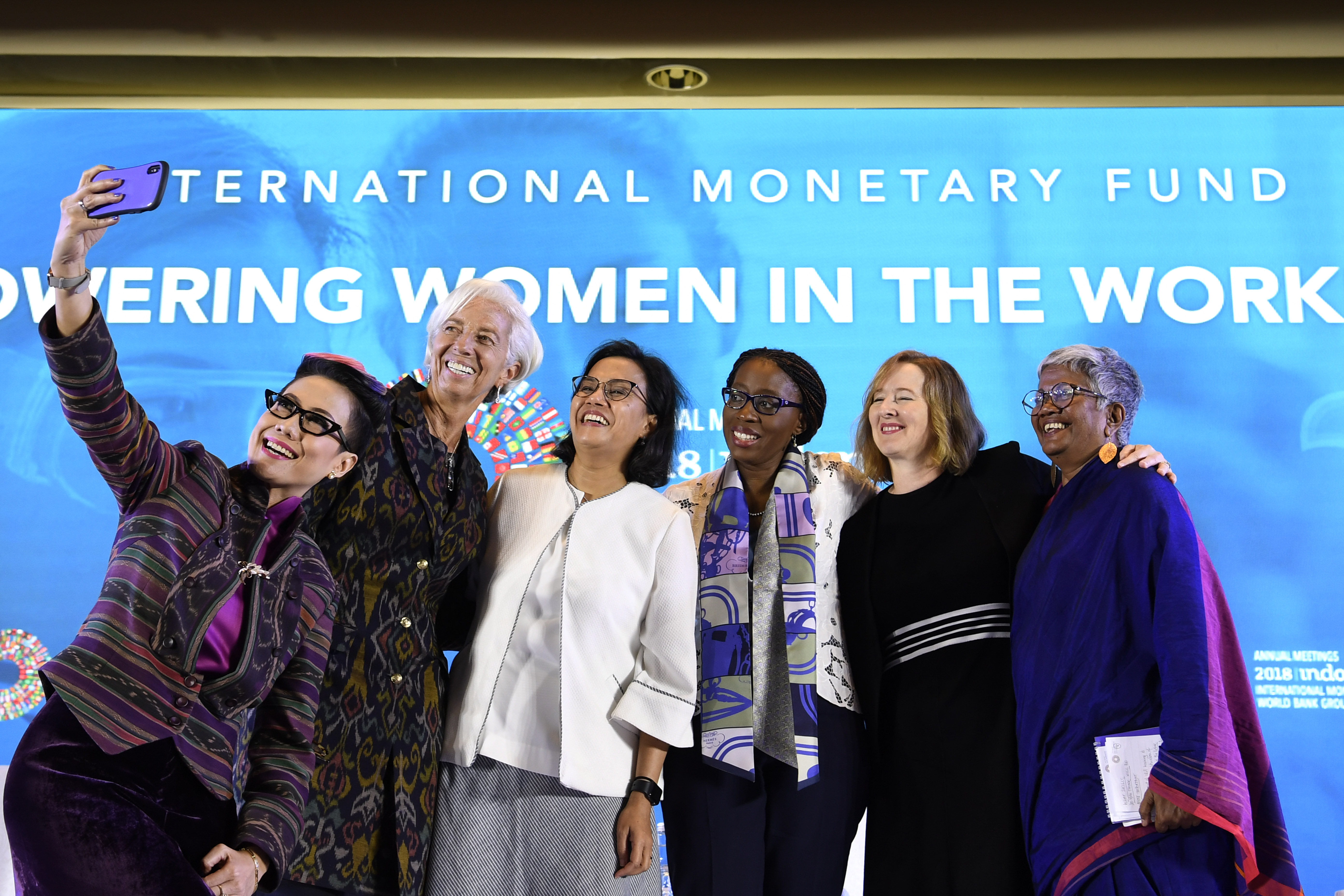 Menteri Keuangan Sri Mulyani (ketiga kiri) bersama Direktur Pelaksana International Monetary Fund (IMF) Christine Lagarde (kedua kiri), Direktur Eksekutif International Womens Rights Action Watch Asia Pasific Priyanthi Fernando (kanan), Deputi Gubernur Senior Bank of Canada Carolyn Wilkins (kedua kanan), Executive Secretary United Nation (UN) Economic Commision untuk Afrika Vera Songwe (ketiga kanan) dan moderator Rosiana Silalahi (kiri) berswafoto usai diskusi tentang Pemberdayaan Wanita di Dunia Kerja pada rangkaian Pertemuan Tahunan IMF World Bank Group 2018 di Bali International Convention Center (BICC), Nusa Dua, Bali, Selasa (9/10). Seminar tersebut membahas kebijakan untuk meningkatkan partisipasi wanita dalam dunia kerja dan penguasaan teknologi. ICom/AM IMF-WBG/Puspa Perwitasari/hp/2018