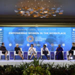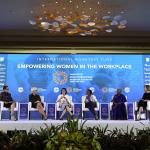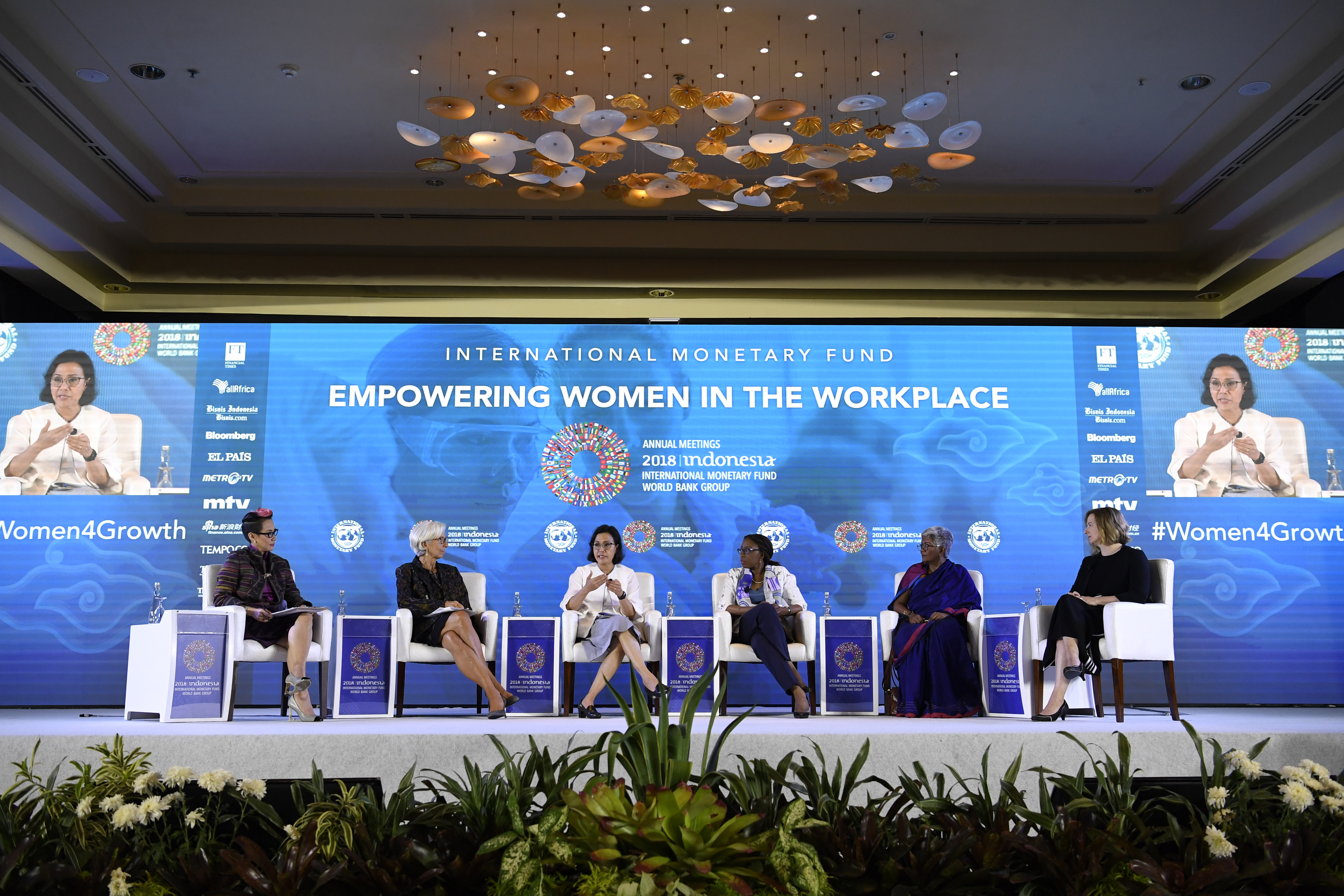 Menteri Keuangan Sri Mulyani (ketiga kiri) bersama Direktur Pelaksana International Monetary Fund (IMF) Christine Lagarde (kedua kiri), Executive Secretary United Nation (UN) Economic Commision untuk Afrika Vera Songwe (ketiga kanan), Direktur Eksekutif International Womens Rights Action Watch Asia Pasific Priyanthi Fernando (kedua kanan), Deputi Gubernur Senior Bank of Canada Carolyn Wilkins (kanan) saat diskusi tentang Pemberdayaan Wanita di Dunia Kerja pada rangkaian Pertemuan Tahunan IMF World Bank Group 2018 di Bali International Convention Center (BICC), Nusa Dua, Bali, Selasa (9/10). Seminar tersebut membahas kebijakan untuk meningkatkan partisipasi wanita dalam dunia kerja dan penguasaan teknologi. ICom/AM IMF-WBG/Puspa Perwitasari/hp/2018