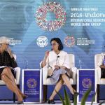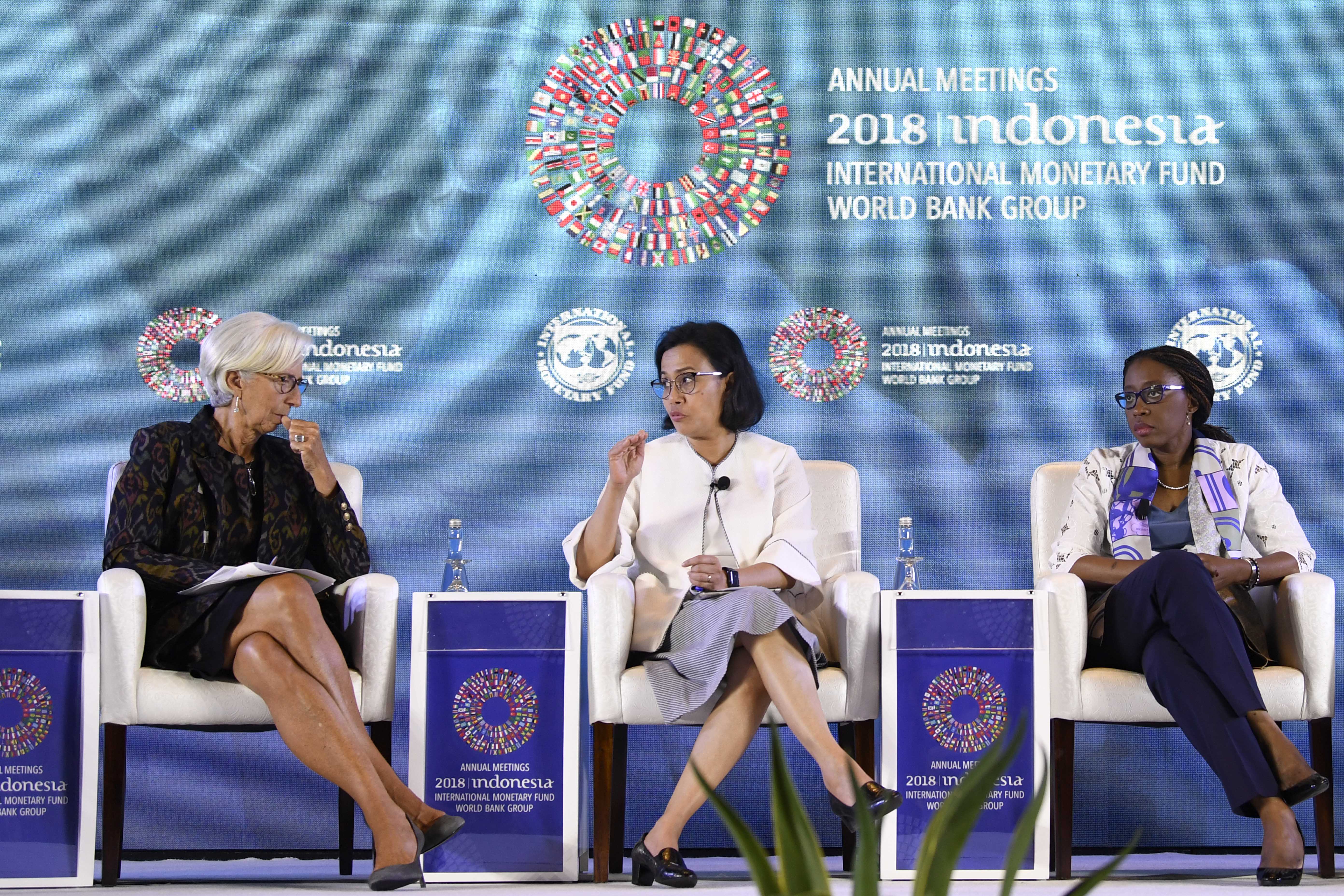 Menteri Keuangan Sri Mulyani (tengah) bersama Direktur Pelaksana International Monetary Fund (IMF) Christine Lagarde (kiri) dan Executive Secretary United Nation (UN) Economic Commision untuk Afrika Vera Songwe (kanan) saat diskusi Pemberdayaan Wanita di Dunia Kerja pada rangkaian Pertemuan Tahunan IMF World Bank Group 2018 di Bali International Convention Center (BICC), Nusa Dua, Bali, Selasa (9/10). Seminar tersebut membahas kebijakan untuk meningkatkan partisipasi wanita dalam dunia kerja dan penguasaan teknologi. ICom/AM IMF-WBG/Puspa Perwitasari/hp/2018