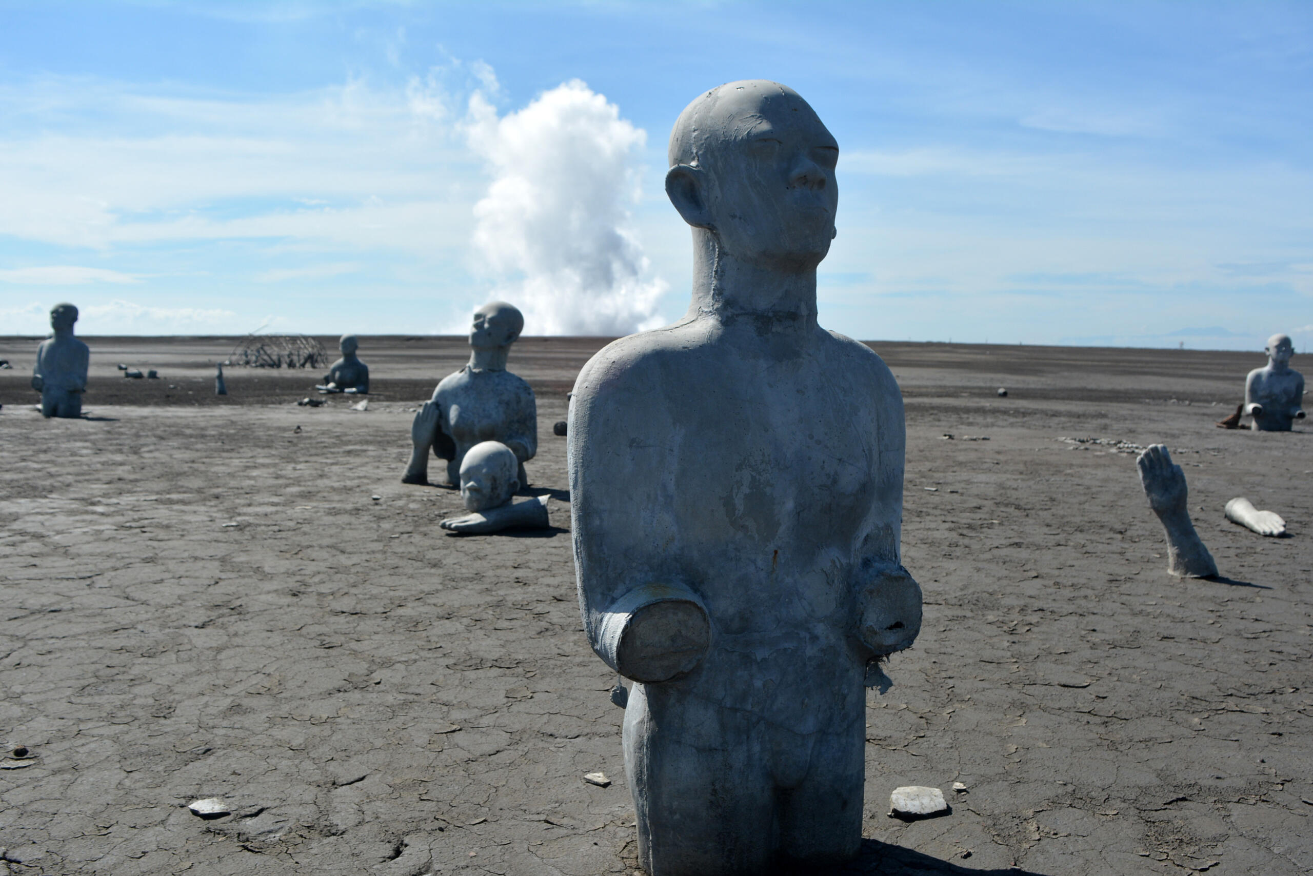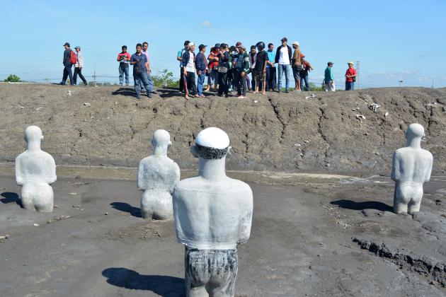 Sejumlah wisatawan melihat patung-patung sisa peringatan 8 Tahun Semburan Lumpur Lapindo di area tanggul penahan lumpur di Porong, Sidoarjo, Jawa Timur, Sabtu (28/5). Sepuluh tahun setelah semburan lumpur terjadi, pembayaran ganti rugi terhadap warga yang terkena dampak dari lumpur belum seluruhnya tuntas, meskipun Lapindo telah mengeluarkan dana senilai Rp8 triliun dan mendapat pinjaman dari pemerintah senilai Rp781 miliar. ANTARA FOTO/Umarul Faruq/16
