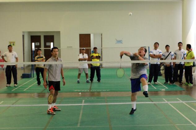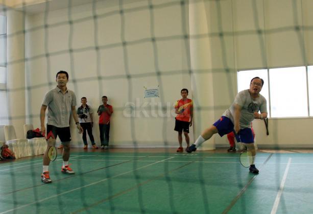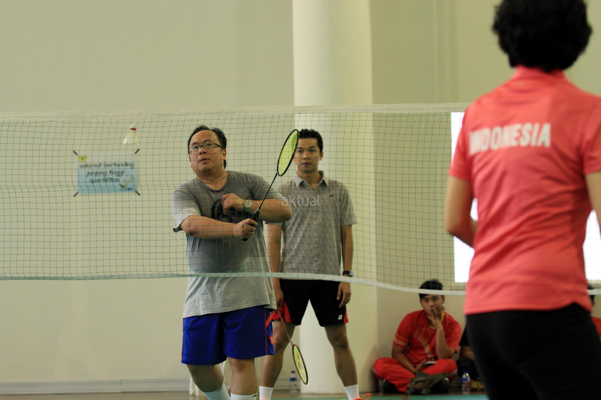 Menteri Keuangan Bambang Brodjonegoro bermain bulu tangkis di Kantor Dijen Bea Cukai Rawamangun, Jakarta, Minggu (9/8). Bambang Brodjonegoro menyempatkan diri untuk menyalurkan hobi olahraganya tersebut disela - sela kesibukannya sebagai menteri. AKTUAL/EKO S HILMAN