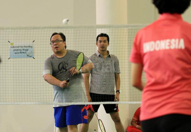 Menteri Keuangan Bambang Brodjonegoro (kanan) bermain bulu tangkis bersama atlet bulutangkis nasional Taufik Hidayat di Kantor Dijen Bea Cukai Rawamangun, Jakarta, Minggu (9/8). Bambang Brodjonegoro menyempatkan diri untuk menyalurkan hobi olahraganya tersebut disela - sela kesibukannya sebagai menteri. AKTUAL/EKO S HILMAN