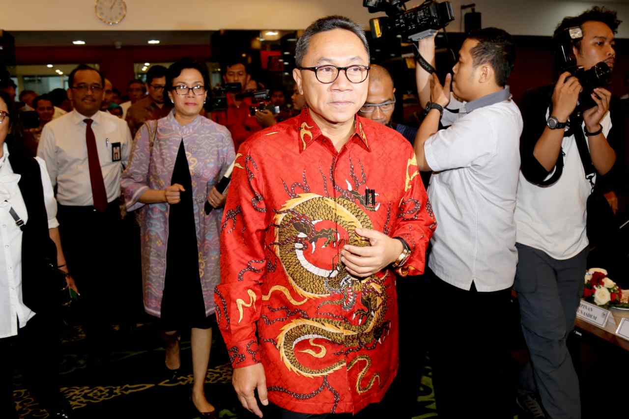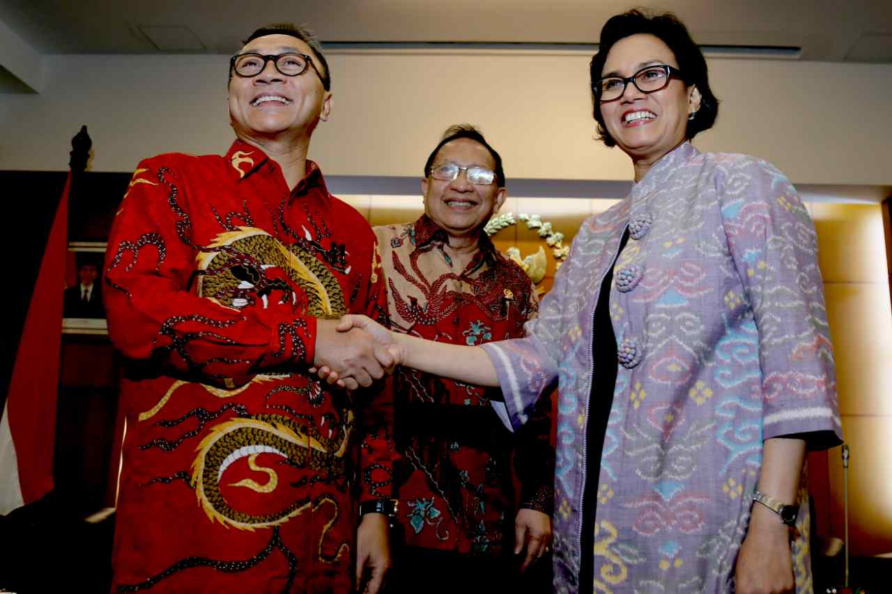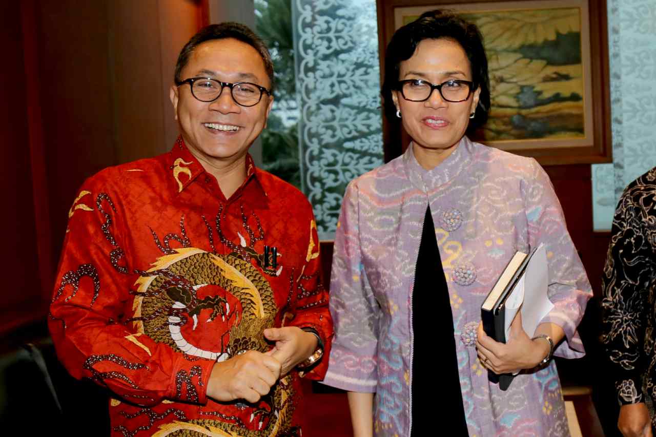 Ketua MPR Zulkifli Hasan (kiri) berbincang dengan Menkeu Sri Mulyani sebelum dalam rapat konsultasi di Kompleks Parlemen Senayan, Jakarta, Senin (15/8). Rapat itu membahas APBN dan perkembangan perekonomian global serta pengaruhnya terhadap keuangan negara. AKTUAL/TINO OKTAVIANO