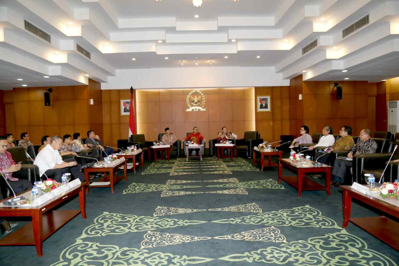 Ketua MPR Zulkifli Hasan (kiri) didampingi Wakil Ketua Hidayat Nur Wahid (kedua kiri) dan EE Mangindaan (ketiga kiri) berbincang dengan Menkeu Sri Mulyani dalam rapat konsultasi di Kompleks Parlemen Senayan, Jakarta, Senin (15/8). Rapat itu membahas APBN dan perkembangan perekonomian global serta pengaruhnya terhadap keuangan negara. AKTUAL/TINO OKTAVIANO