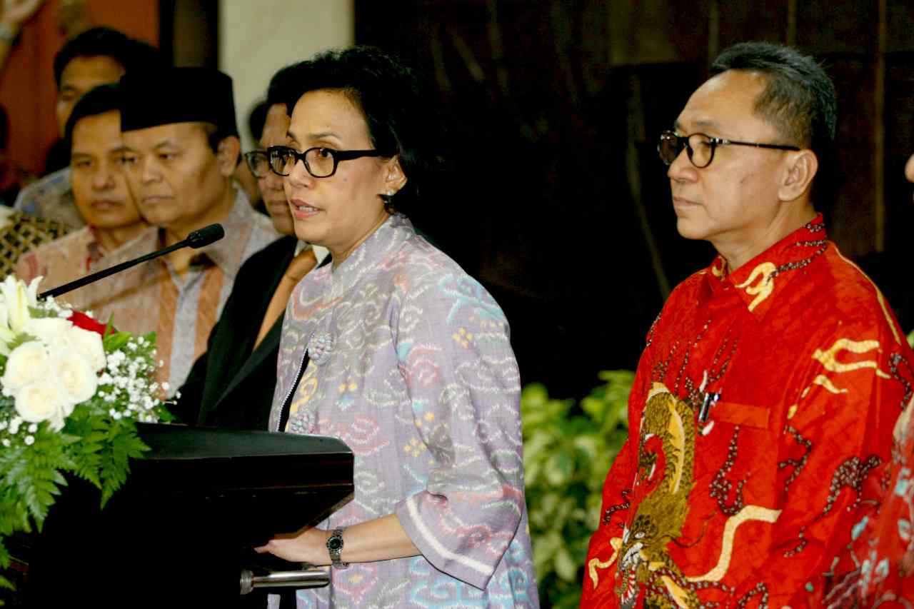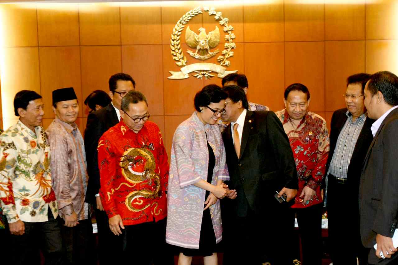 Menkeu Sri Mulyani berbincang dengan Wakil Ketua MPR Osman Sapta disaksikan Ketua MPR Zulkifli Hasan, Wakil Ketua Hidayat Nur Wahid dan EE Mangindaan saat konferensi pers usai rapat konsultasi di Kompleks Parlemen Senayan, Jakarta, Senin (15/8). Rapat itu membahas APBN dan perkembangan perekonomian global serta pengaruhnya terhadap keuangan negara. AKTUAL/TINO OKTAVIANO