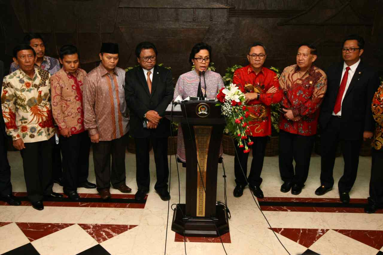 Menteri Keuangan Sri Mulyani didampingi Ketua MPR Zulkifli Hasan, Wakil Ketua Hidayat Nur Wahid dan EE Mangindaan menjawab pertanyaan wartawan usai rapat konsultasi di Kompleks Parlemen Senayan, Jakarta, Senin (15/8). Rapat itu membahas APBN dan perkembangan perekonomian global serta pengaruhnya terhadap keuangan negara. AKTUAL/TINO OKTAVIANO