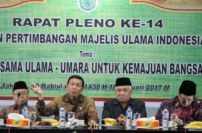 Menko Polhukam Wiranto, didampingi Ketua Dewan Pertimbangan MUI Din Syamsuddin, menghadiri rapat pleno Dewan Pertimbangan Majelis Ulama Indonesia (MUI) di Jakarta, Rabu (18/1/2017). Dewan Pertimbangan Majelis Ulama Indonesia (MUI) menggelar rapat pleno ke-14. Rapat pleno sendiri akan membahas kerjasama ulama dan umaro untuk kemajuan bangsa. AKTUAL/Munzir