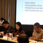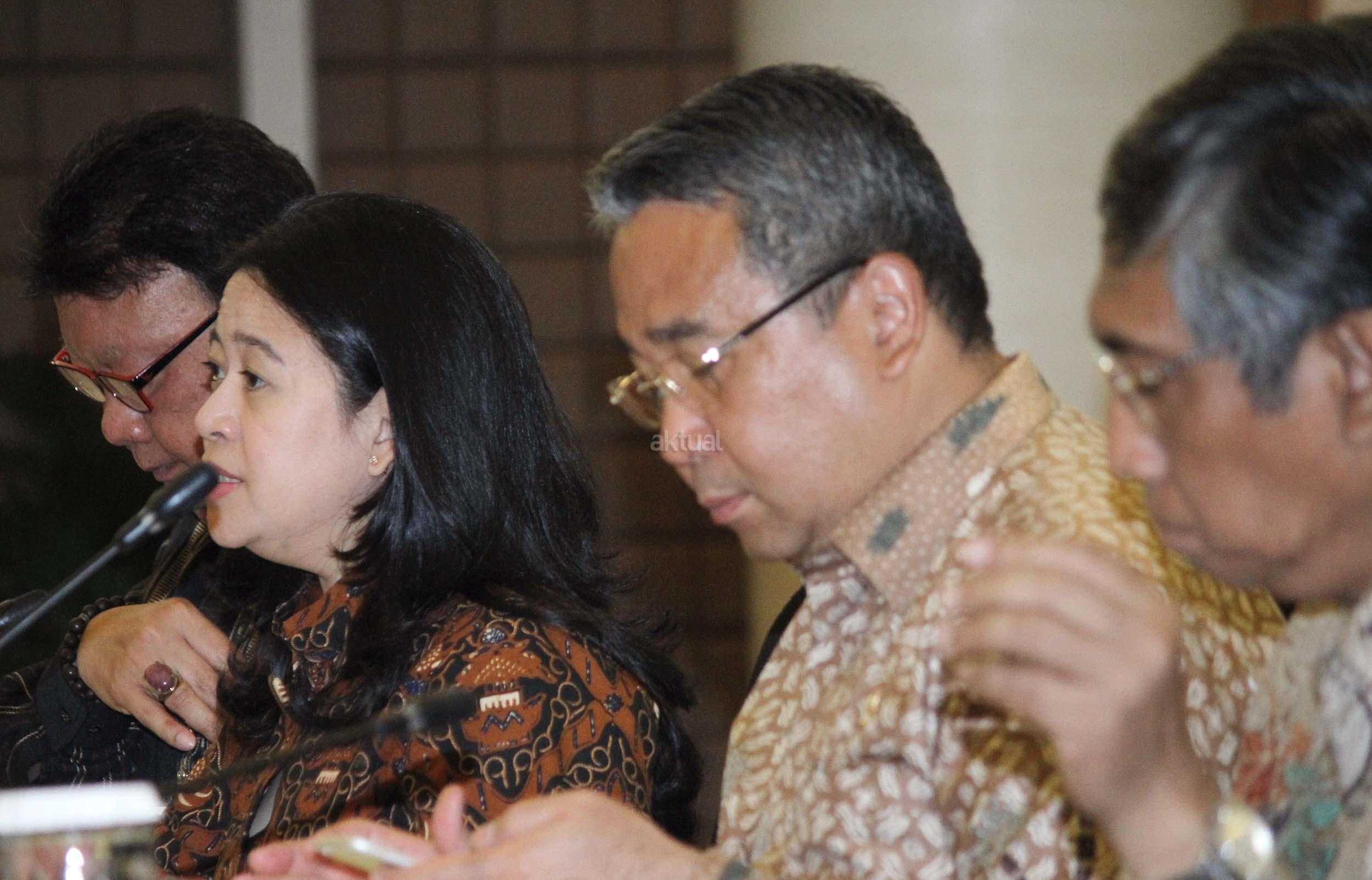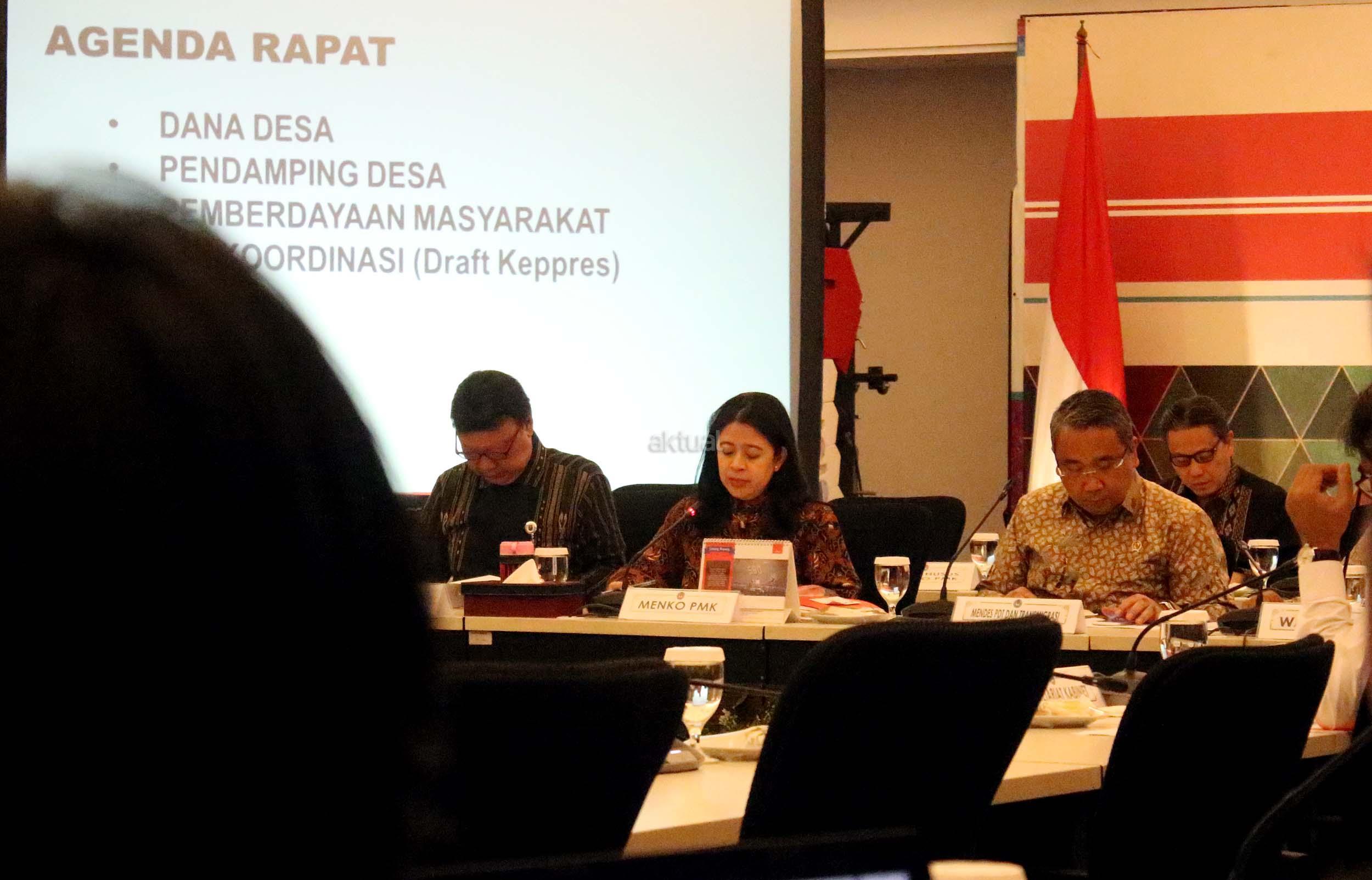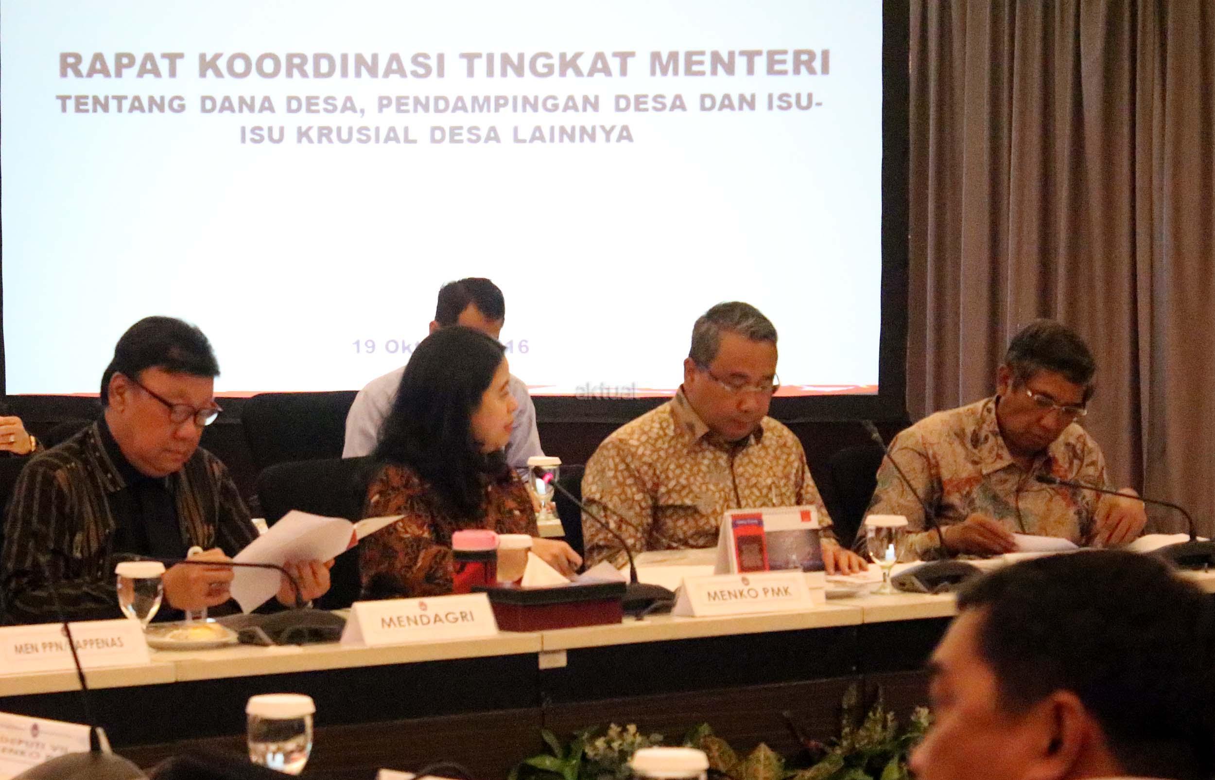 Menko Bidang Pembangunan Manusia dan Kebudayaan Puan Maharani (tengah) didampingi Mendagri Tjahjo Kumolo (kiri) dan Menteri Desa, Pembangunan Daerah Tertinggal dan Transmigrasi Eko Putro Sanjoyo dan Wamenkeu Mardiasmo memimpin rakor tingkat menteri di Kantor Kemenko PMK, Jakarta, Rabu (19/10/2016). Rakor itu membahas tentang dana desa, pendamping desa, dan pemberdayaan masyarakat serta tentang tim koordinasi monitoring dana desa.