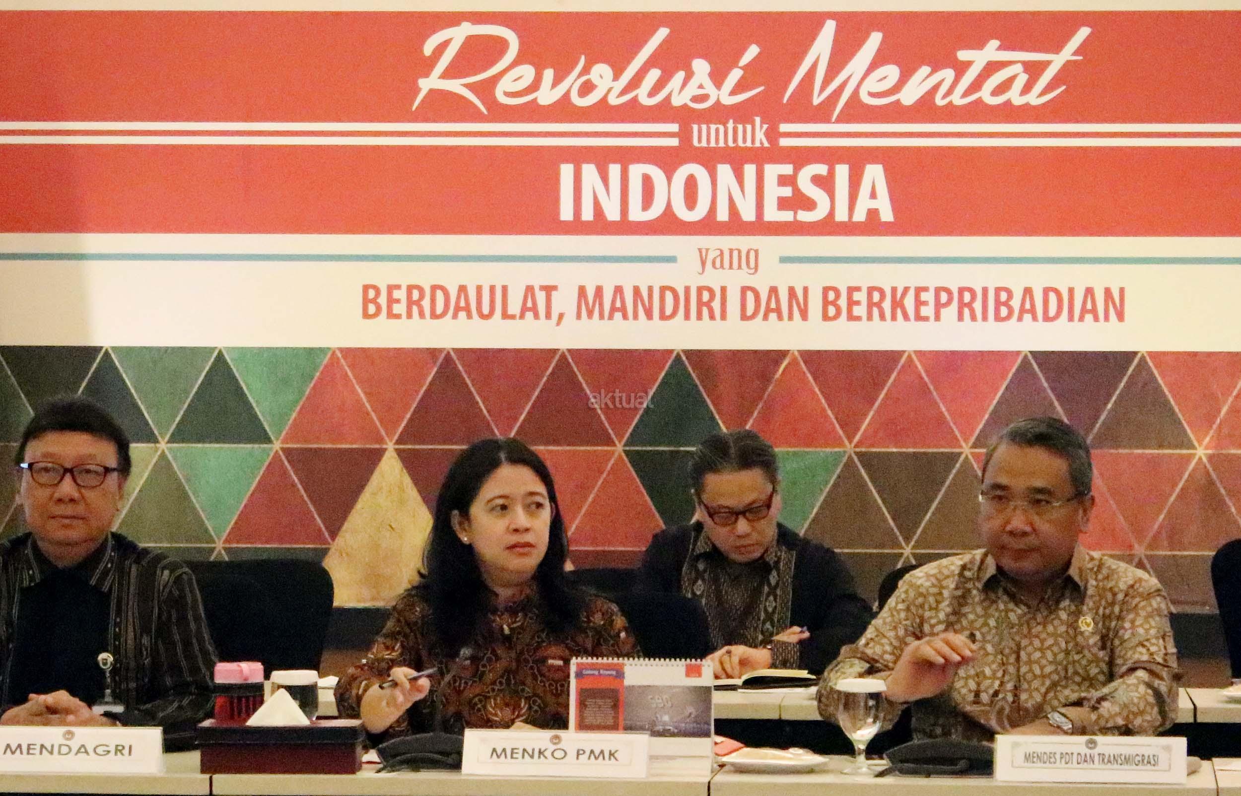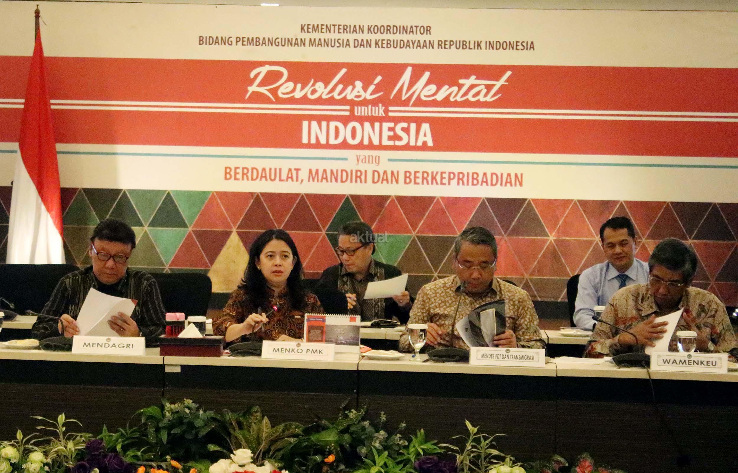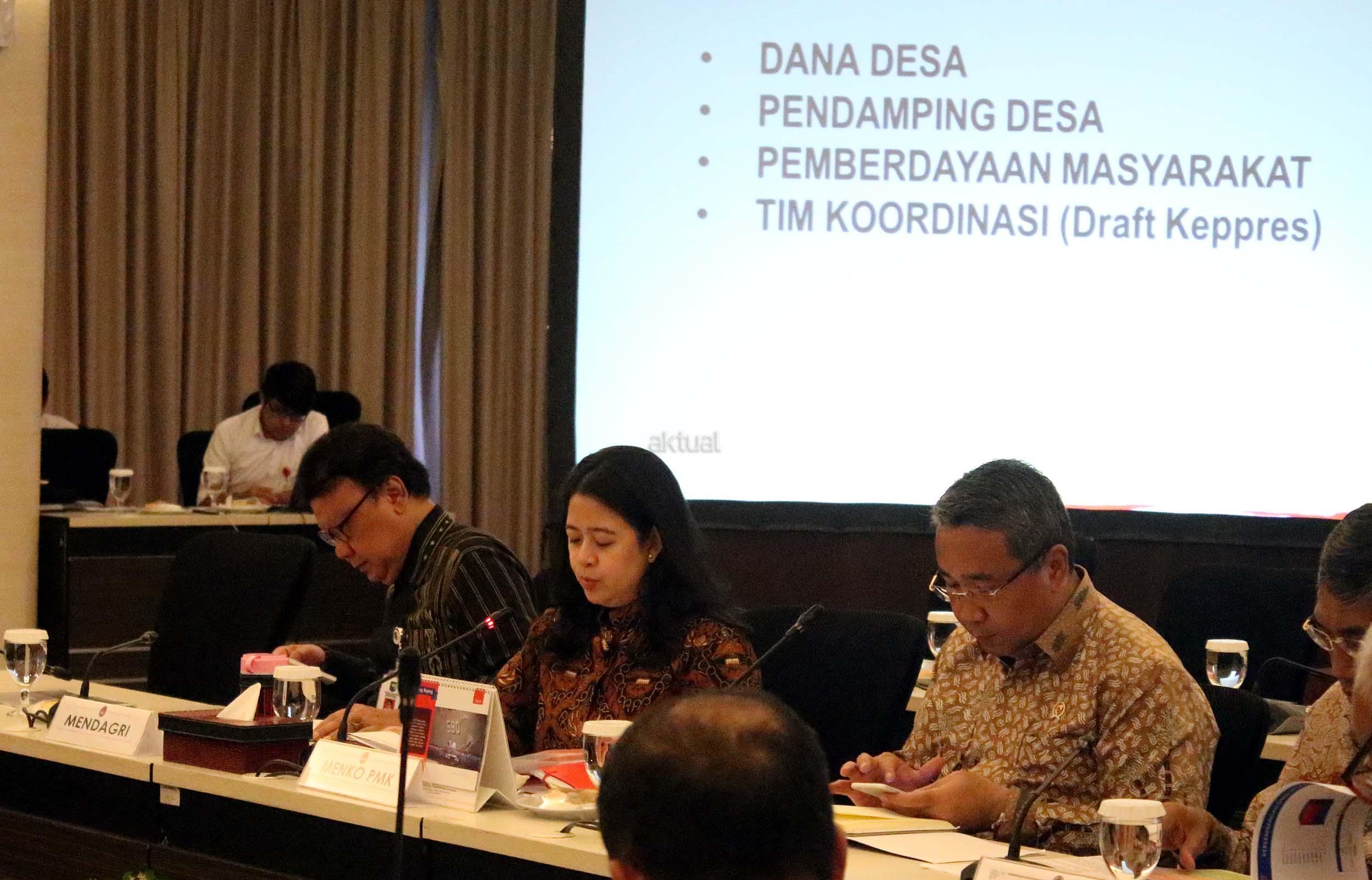 Menko Bidang Pembangunan Manusia dan Kebudayaan Puan Maharani (tengah) didampingi Mendagri Tjahjo Kumolo (kiri) dan Menteri Desa, Pembangunan Daerah Tertinggal dan Transmigrasi Eko Putro Sanjoyo dan Wamenkeu Mardiasmo memimpin rakor tingkat menteri di Kantor Kemenko PMK, Jakarta, Rabu (19/10/2016). Rakor itu membahas tentang dana desa, pendamping desa, dan pemberdayaan masyarakat serta tentang tim koordinasi monitoring dana desa. AKTUAL/Munzir