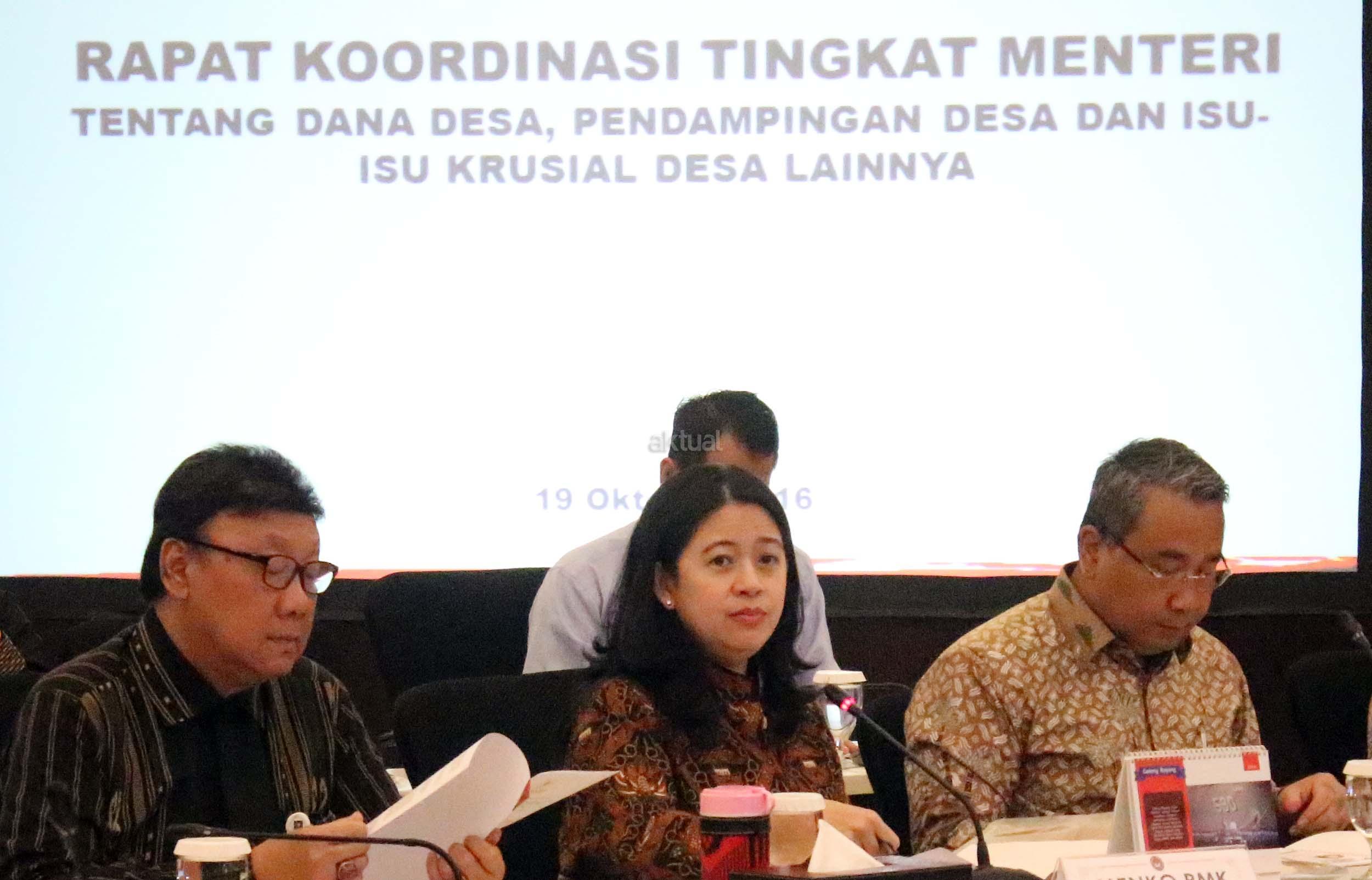 Menko Bidang Pembangunan Manusia dan Kebudayaan Puan Maharani (tengah) didampingi Mendagri Tjahjo Kumolo (kiri) dan Menteri Desa, Pembangunan Daerah Tertinggal dan Transmigrasi Eko Putro Sanjoyo memimpin rakor tingkat menteri di Kantor Kemenko PMK, Jakarta, Rabu (19/10/2016). Rakor itu membahas tentang dana desa, pendamping desa, dan pemberdayaan masyarakat serta tentang tim koordinasi monitoring dana desa.