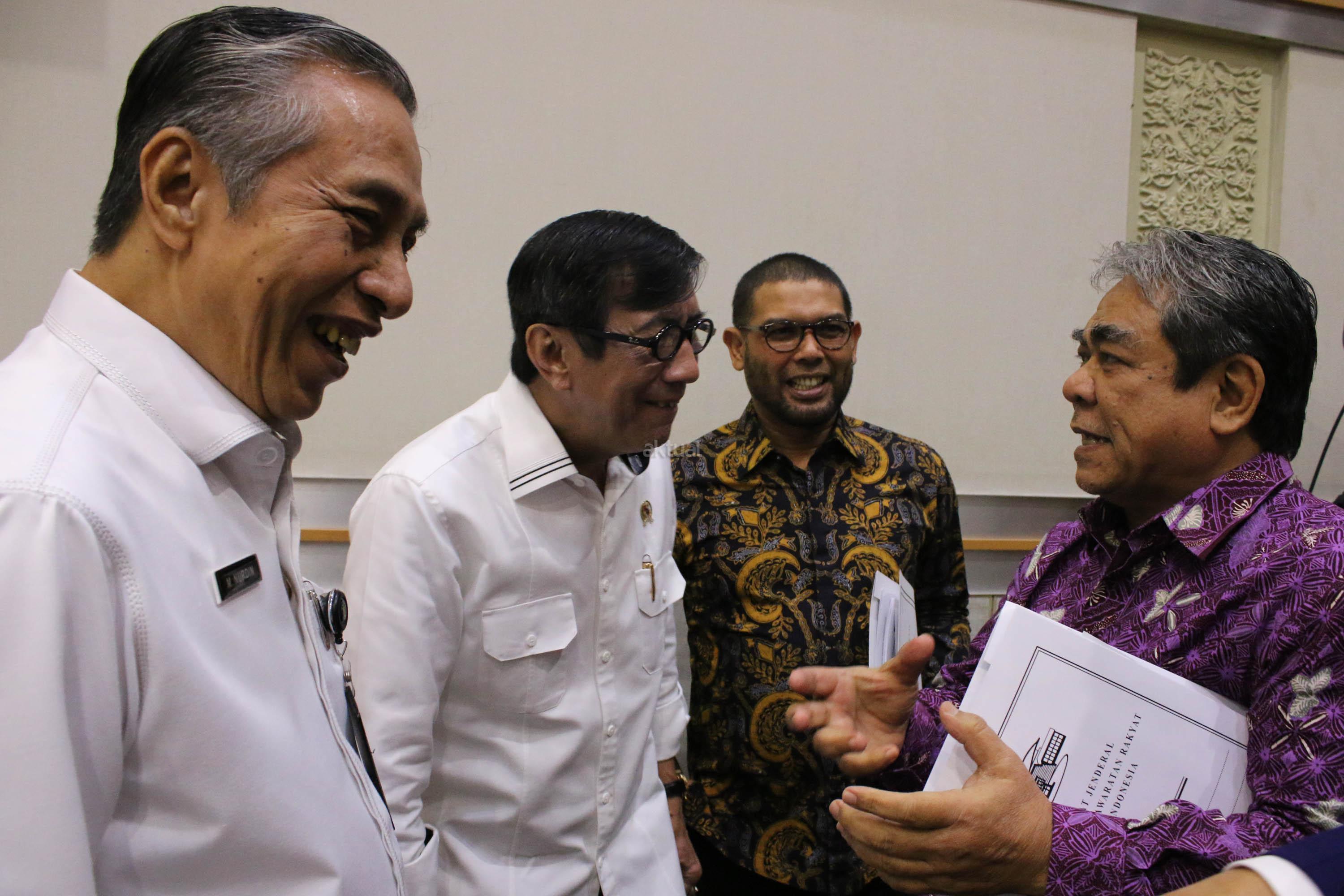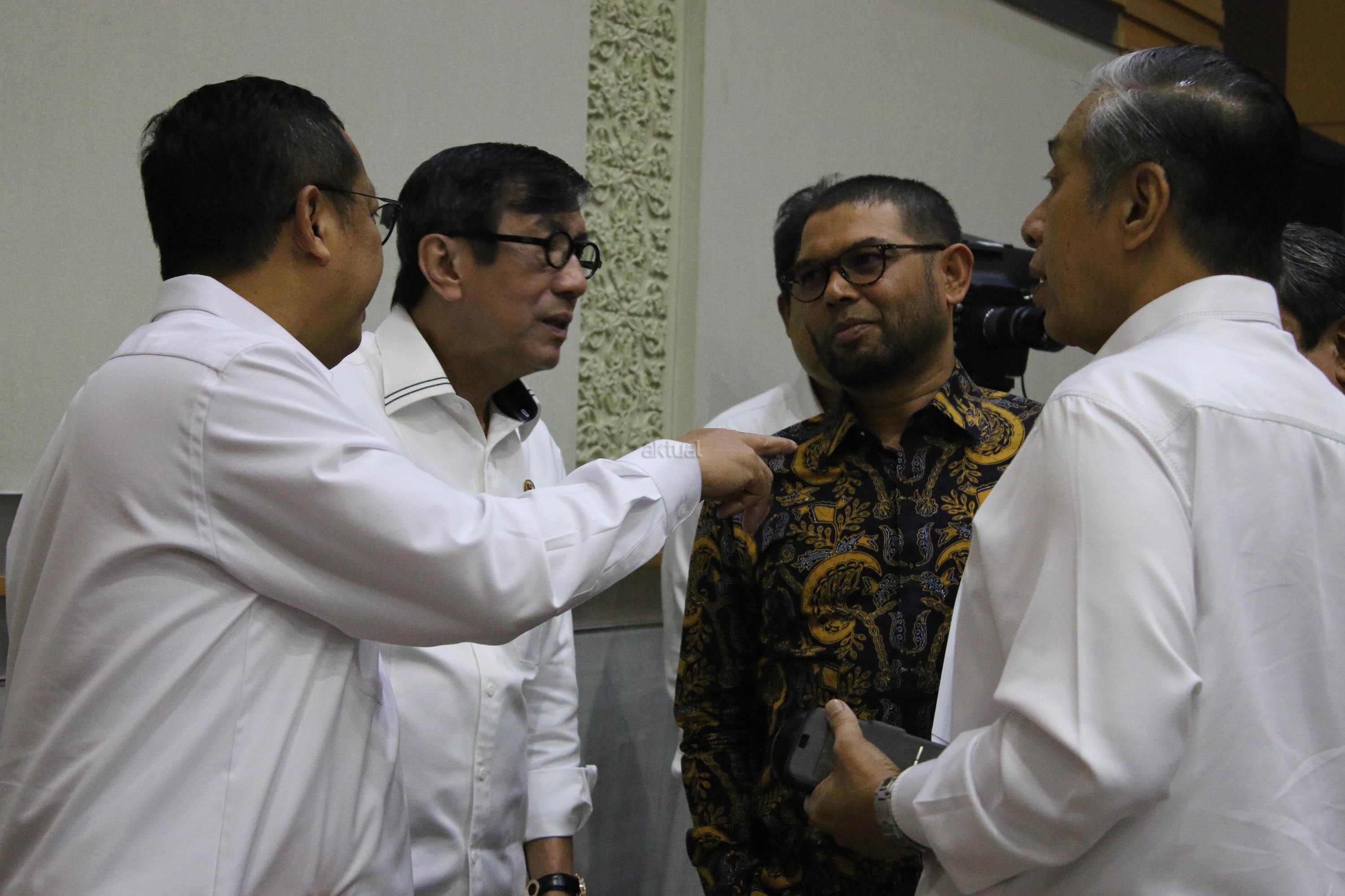 Menteri Hukum dan HAM Yasonna Laoly (kedua dari kiri) didampingi Staff Khusus Menteri Hukum dan HAM M. Nurdin (kiri) berbincang dengan anggota Komisi III Fraksi PKS Soenmandjaja (kanan), Nasir Djamil (kedua dari kanan) , saat menghadiri Rapat Kerja dengan Komisi III DPR di Gedung Nusantara II, Kompleks Parlemen, Jakarta, Rabu (12/7). Rapat kerja tersebut membahas pemanfaatan teknologi terkait pengawasan orang asing, pelaksanaan perlindungan hak kekayaan intelektual, dan program-program kerja prioritas tahun 2018 serta target yang akan dicapai. AKTUAL/Tino Oktaviano