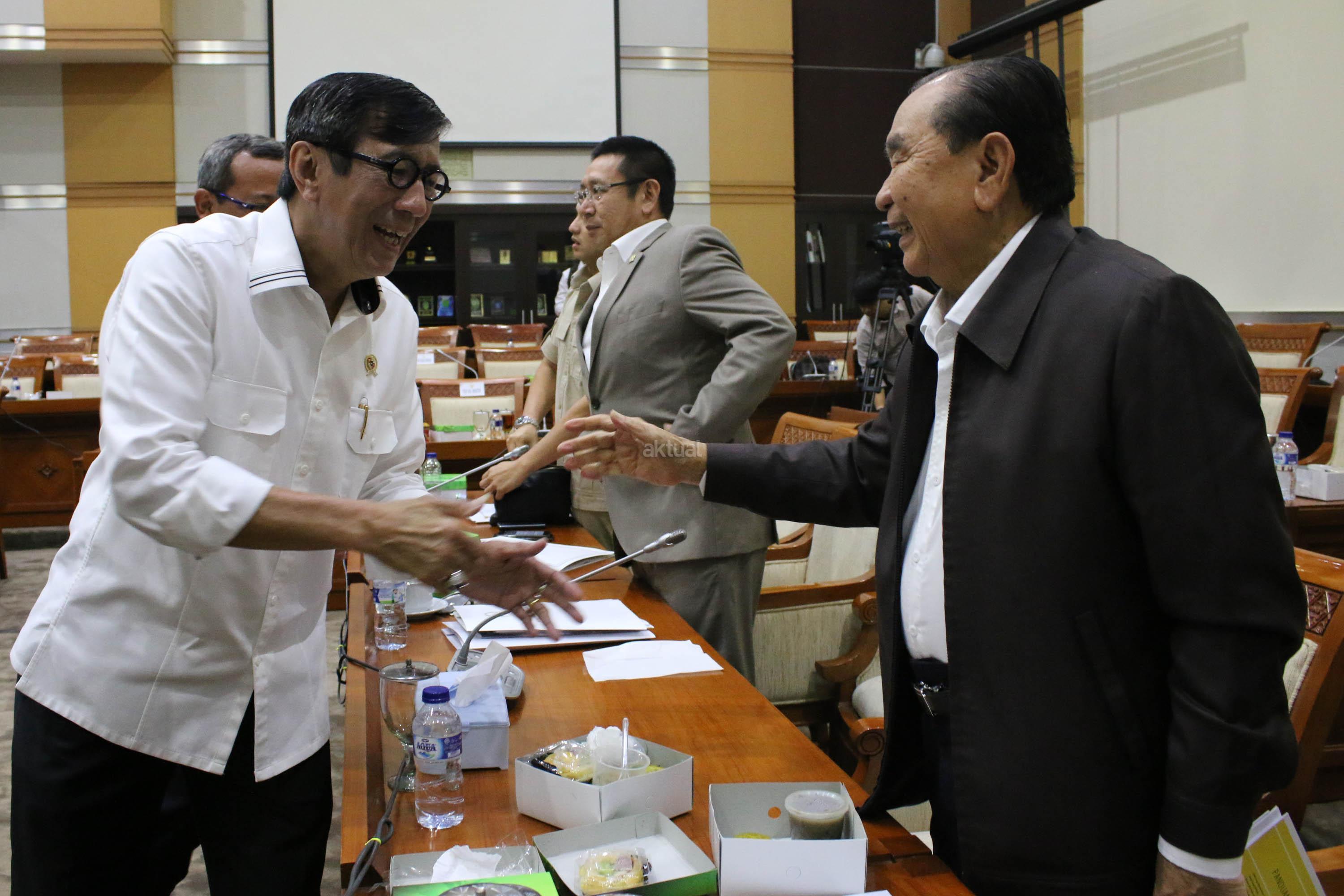 Menteri Hukum dan HAM Yasonna Laoly (kiri) bersalaman dengan anggota Komisi III Fraksi Demokrat Abdul Wahab Dalimunthe, saat menghadiri Rapat Kerja dengan Komisi III DPR di Gedung Nusantara II, Kompleks Parlemen, Jakarta, Rabu (12/7). Rapat kerja tersebut membahas pemanfaatan teknologi terkait pengawasan orang asing, pelaksanaan perlindungan hak kekayaan intelektual, dan program-program kerja prioritas tahun 2018 serta target yang akan dicapai. AKTUAL/Tino Oktaviano